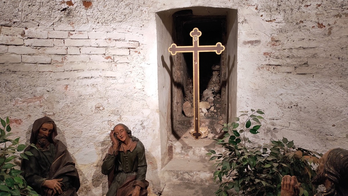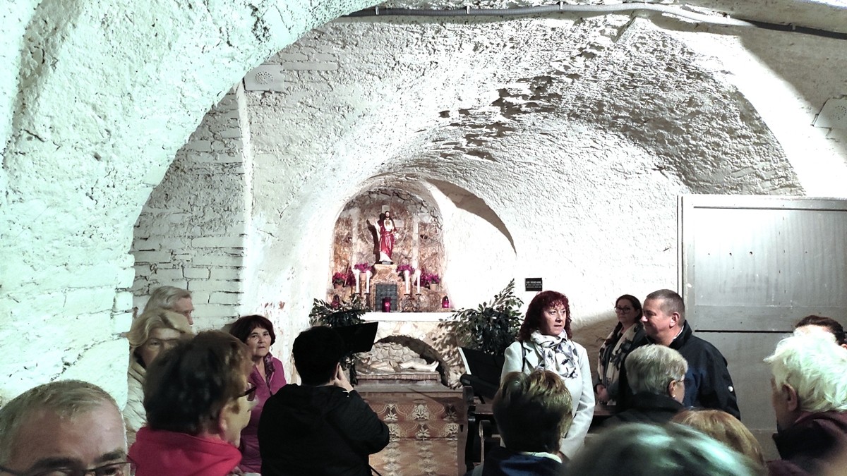 Po schodech jsme sešli do krypty a průvodkyně nás zasvětila do tajů opraveného podzemí. Původně stával na tomto místě menší starý kostelík, již z druhé poloviny 14. století. Na počátku 16. století byl renesančně přestavěn. Ke kostelu patřil hřbitov, který však již zcela zanikl. Ještě na konci 16. století byly ostatky karlovarských starostů ukládány do krypty, v níž jsme stanuli. V podzemních prostorách je dochován Oltář Božího hrobu. Jde o světový unikát, protože byl vytvořen s pomocí kamene vřídlovce a hrachovce, a to se nenajde nikde jinde na světě. Spatřili jsme také znázorněné výjevy z Gatsematské zahrady a ještě Kalvárii a Kostnici. Zajímavá byla též ukázka kontrolních vrtů, které se v místech okolo Vřídla musí pravidelně provádět kvůli hlídání stability podloží.