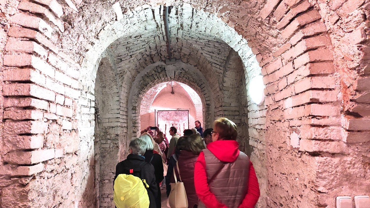 Před vchodem do podzemí se začali shromažďovat před 10. hodinou první zájemci o prohlídku. Postupně se skupina rozrůstala. Když nás vyšla ven uvítat průvodkyně a oznámila, že dolů můžeme maximálně o 20 lidech, tak to v davu začalo vřít. Mírný déšť zesiloval, každý se chtěl co nejrychleji dostat dovnitř. Měla jsem štěstí, že již při příchodu jsem si zvolila místo v blízkosti vchodu a čekala. Stalo se, že jsem bez jakéhokoliv vlastního přičinění byla vtlačena do otevřených dveří hned s tou první skupinkou.