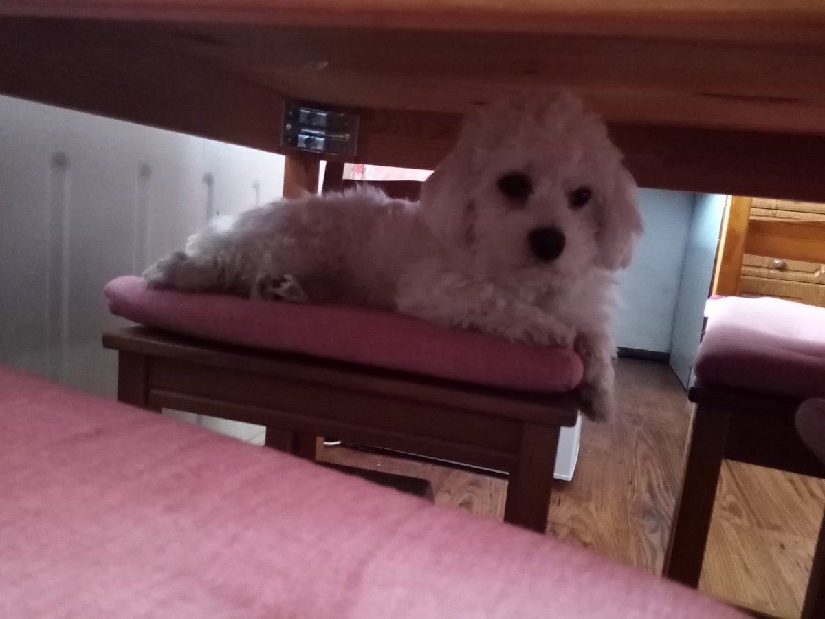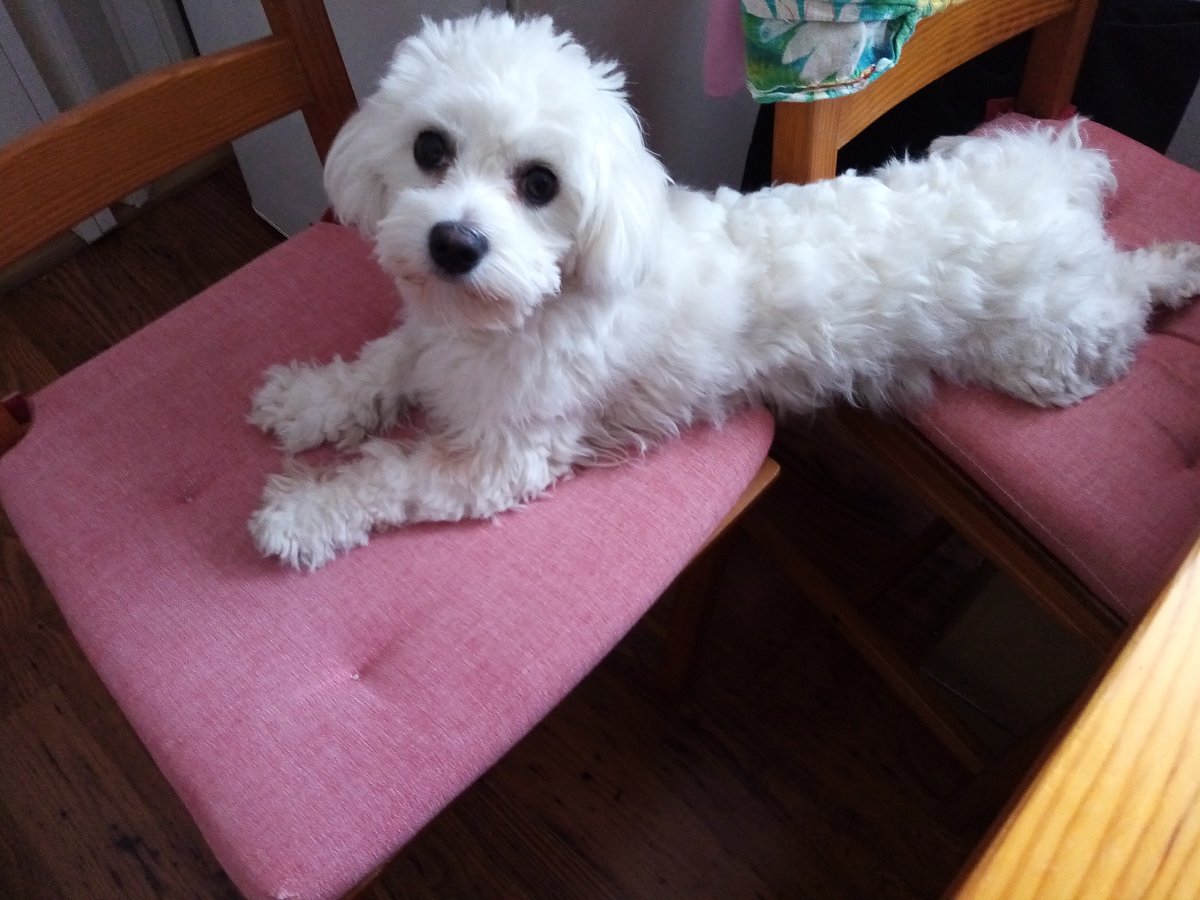 Natáhla jsem se zase přes dvě židle. Já buď sedím vedle paničky u stolu, když pracuje a tulím se k ní, nebo když má panička jinou práci a nemůžu vedle ní sedět, zalezu si pod stůl na ty židle a dělám si tam boudu. Taky mám ráda, když se natáhnu u kamínek.