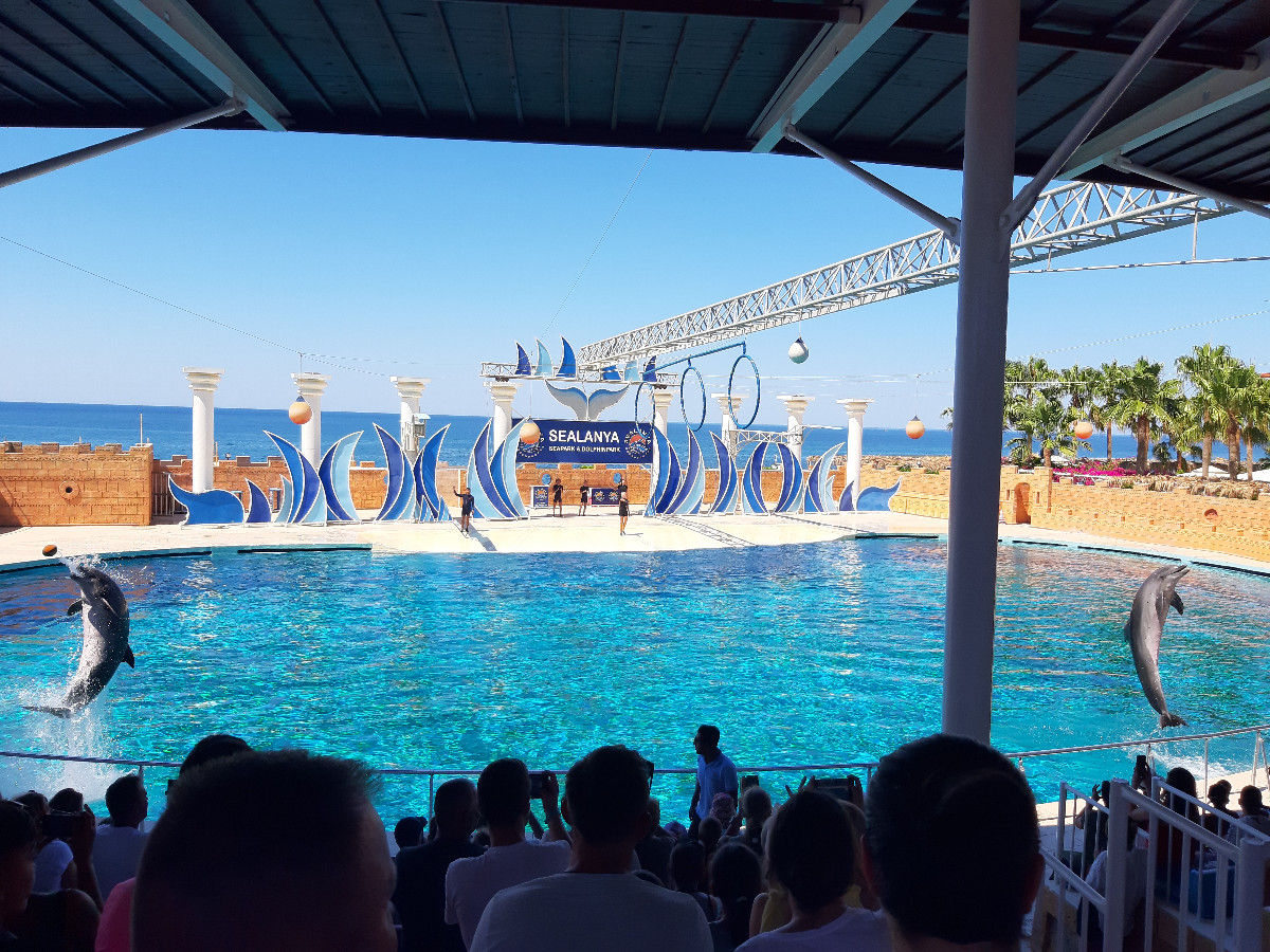 Minibusík posbíral několik stejně střelených jedinců a vyrazili jsme. Kousek od Alanye je totiž delfinárium a tam jsme se vypravili na plavání s delfíny. Po příjezdu si nás převzala pracovnice delfinária, navlékla nás do plovacích vest a dala školení. Všechny šperky sundat, delfínů se nedotýkat, nedělat prudké pohyby a poslouchat trenéry. A pozor… tady mě poprvé přejela husina po těle – pokud je mezi vámi těhotná, tak ať vůbec do vody neleze, delfín to pozná a nebude s ní spolupracovat. Vybaveni informacemi jsme po skupinkách šesti lidí vyrazili k bazénkům. Šupli nás do vody a my jsme se jako špunty houpali ve vodě, delfín kroužil kolem nás, asi si načítal, koho prvního plácne ocasem.