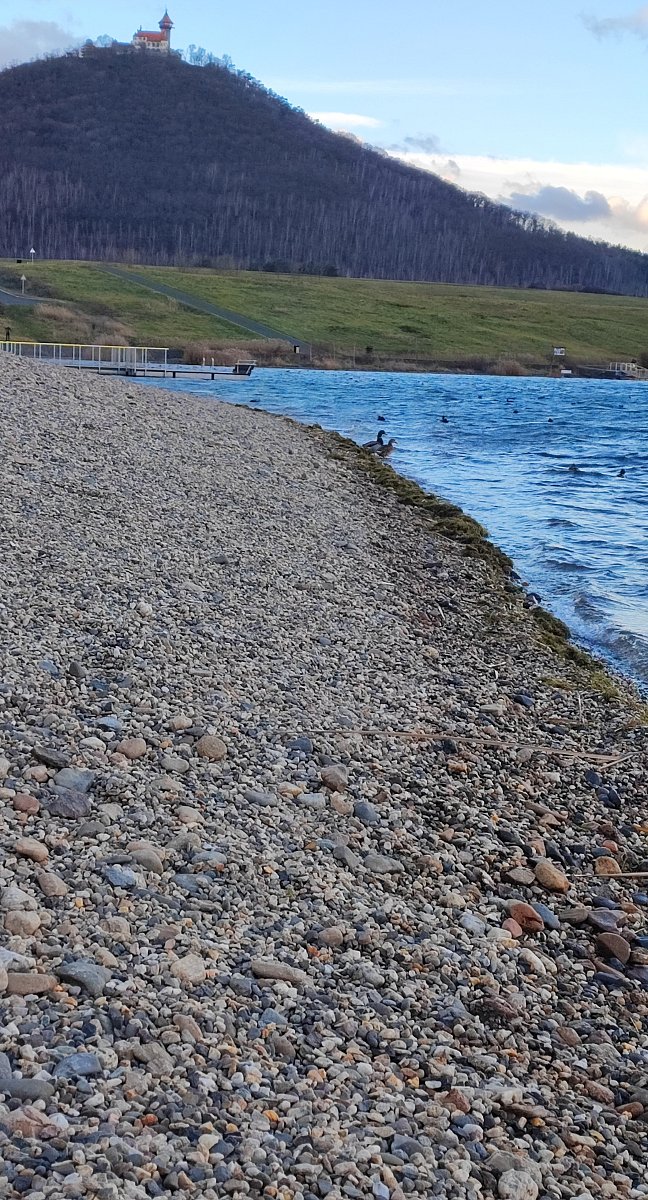 Délka kolem jezera je 9km. My jsme u jezera nebyli prvně, ale ještě nikdy jsme ho neobešli celé - přece jen 9km se dá šlapat. Jednodušší je to pro kola, koloběžky, in-line brusle. Je i pěkná procházka s hůlkami. Ale niko-li ve vedru v létě... Mě osobně chybí kolem jezera tráva se stromy (stínem) a více laviček pro odpočinek. Co se týče koupání, já se tam nekoupám, vadí mi kameny u vody a psí pláž pro Robina není zrovna blízko, ač i tam jsme se v minulosti stavěli a smočil si tlapky.
