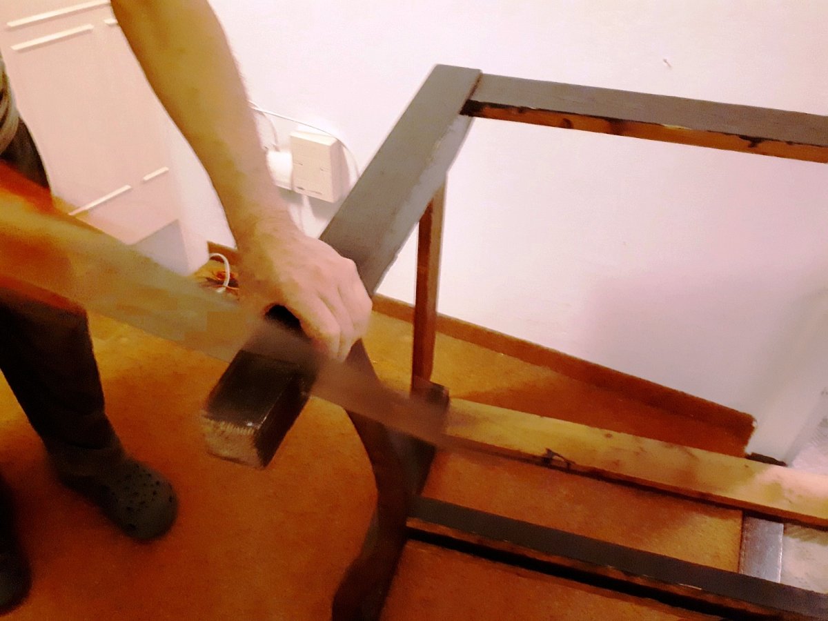 „Tak co teď s tím,“ to teda byla otázka. Cesta zpět nepřipadala v úvahu. Tatínek se sice chvíli vzpouzel, když jsem ho poslala pro pilku, ale nakonec dvě nohy zkrátil a my byli rázem i se stolem uvnitř. Jen ten stůl byl tak trochu našikmo. Nabízelo se jediné řešení: