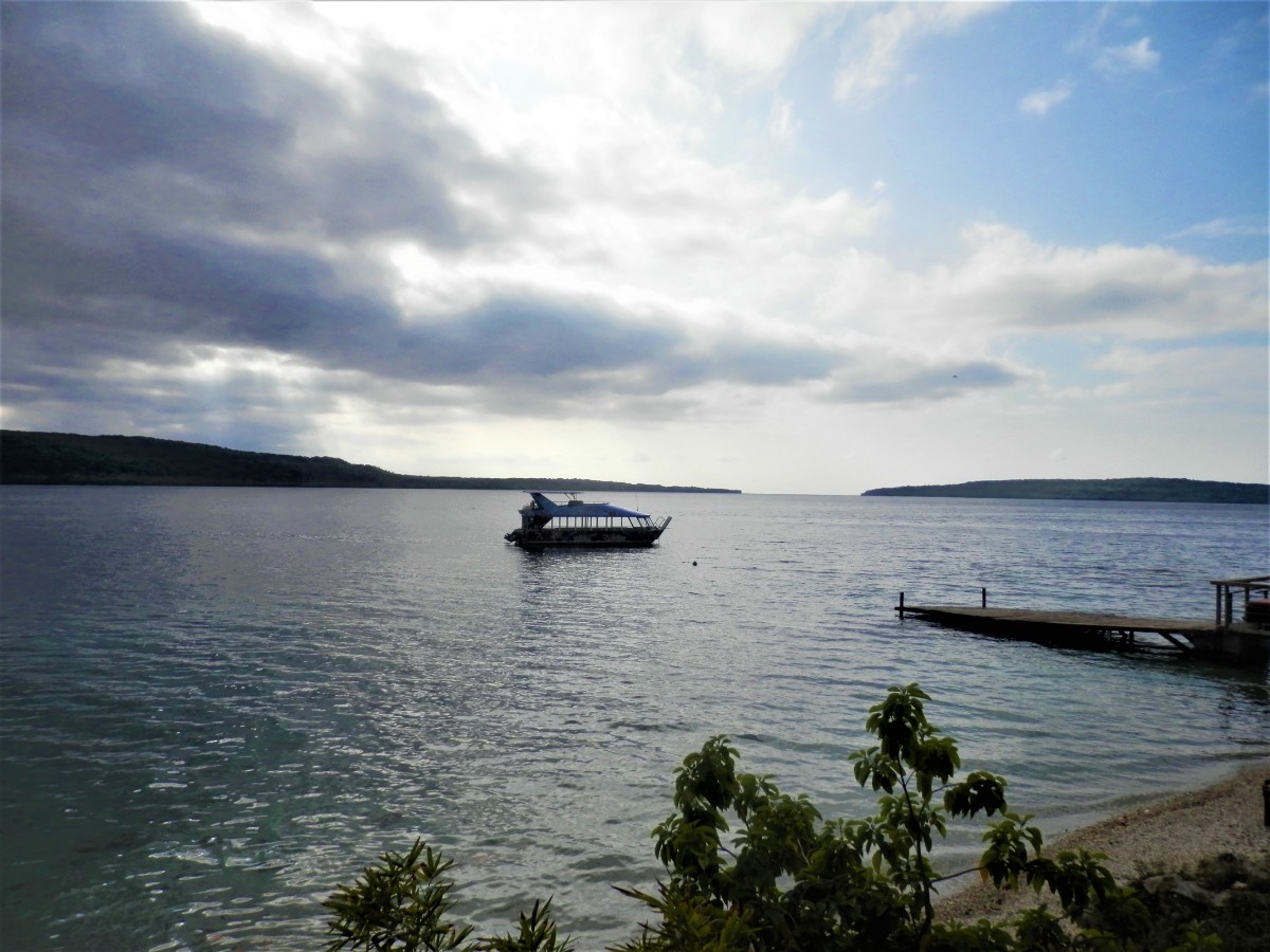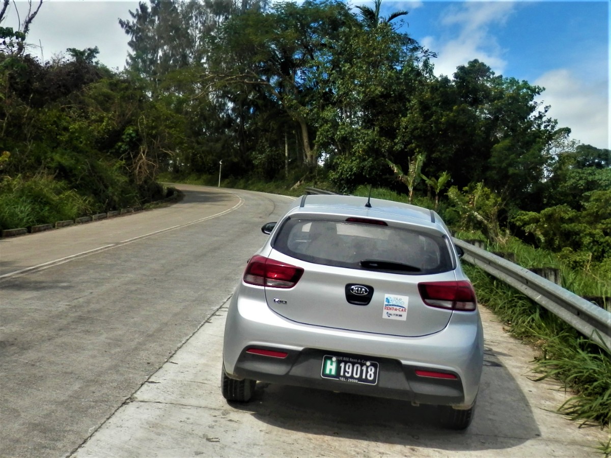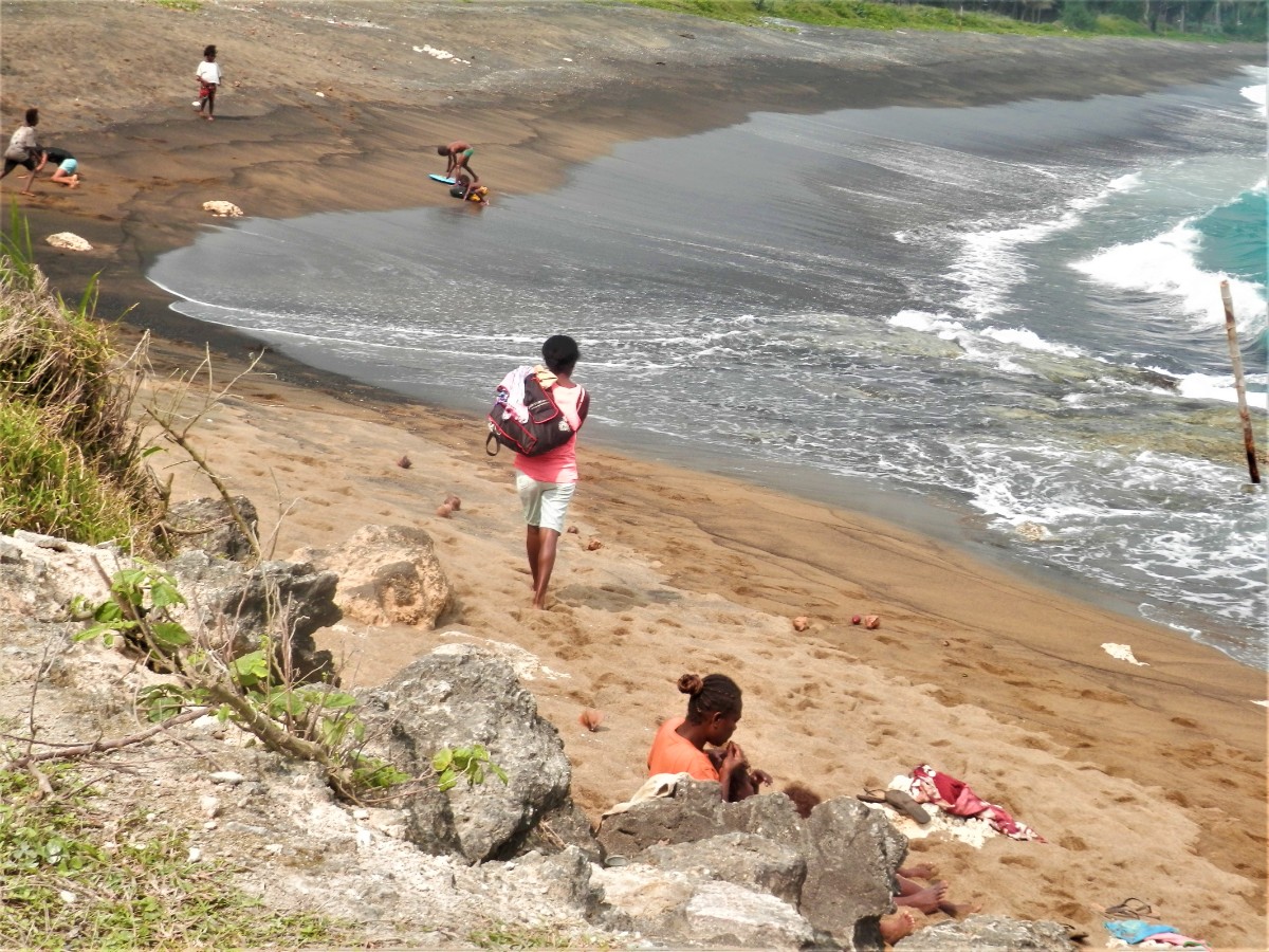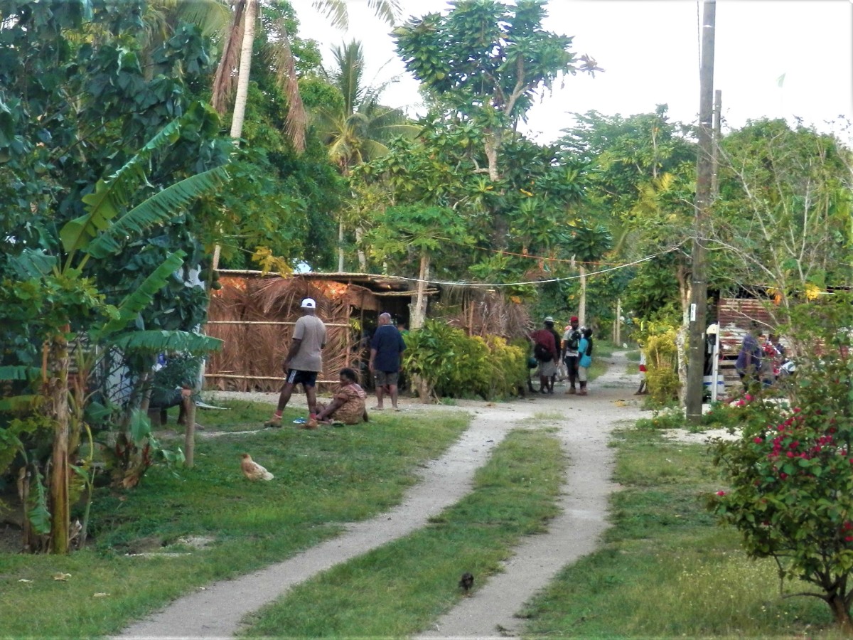 Po snídani se vydáváme na objetí ostrova. Máme to nejlevnější auto. Hned za druhou zatáčkou se zvedá strmý kopec. V jeho polovině došly autíčku síly, zakuckalo se a konec. Nezbylo než se otočit, vrátit se pod kopec a hodně se rozjet. Napodruhé se to povedlo! Jediná silnice vede kolem ostrova. Míjíme vesničky. V jedné z nich nás staví svátečně oblečený Vanuaťan. Svědkové Jehovovi jsou všude. Bereme si jejich letáky psané v jazyce bislama. O kousek dále je krásný výhled na vedlejší ostrůvek. Jsou zde dva domorodci. S jedním se bavíme anglicky a s druhým francouzsky. Spolu se domlouvají v bislama, protože každý z nich je z jiného ostrova. U každé vesnice jsou nádherné pláže. Na některých vybírají vesničané vstupné. Většina z nich září bílým korálovým pískem, jsou zde ale i černé pláže s pískem sopečného původu. Vnitrozemí je nepřístupné, občas se ale dá zajet po neasfaltované cestě kousek od pobřeží. Na jednom místě je odbočka do luxusního rezortu, jinde do tradiční vesnice s hroby předků přímo před domy. Na jedné z bělostných pláží manžel ztratil klíč od auta. Přicházejí dvě sympatické vanuatské dívky a pomáhají nám ho hledat. Bílý písek vypadá jako sníh, jsou v něm vidět naše stopy, takže nebylo obtížné klíč najít.