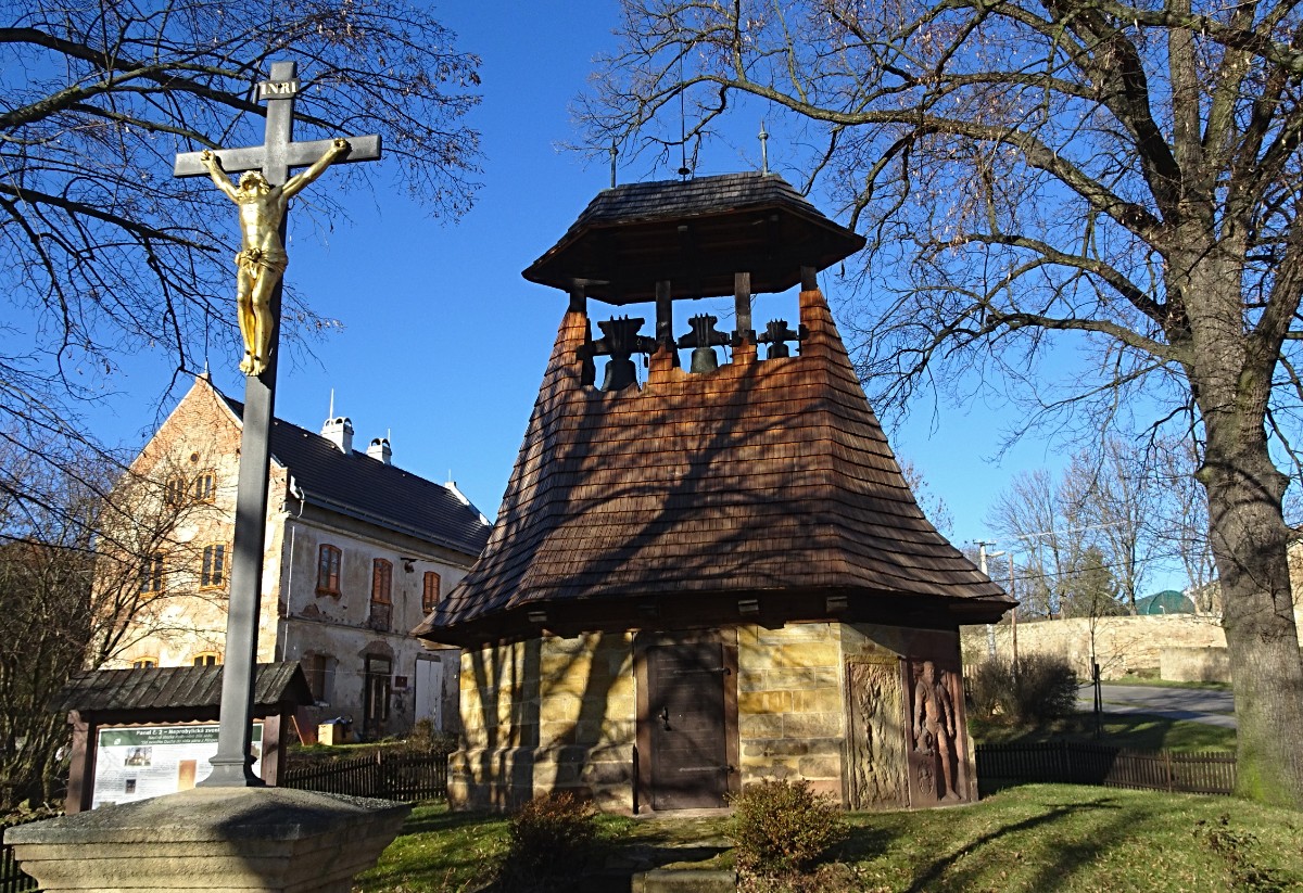 Dřevěná zvonice na kamenné podezdívce z 2. poloviny 15. století se kdysi nacházela na hřbitově, zrušeném v roce 1770. Zvonice na místě zůstala, avšak časem velmi zchátrala. V roce 1896 byla zbourána a na jejím místě byla postavena její věrná kopie. Je zajímavá způsobem zavěšení tří zvonů Václava, Jindřicha a Marie. Do podezdívky jsou zapuštěny dva staré náhrobní kameny. První z červeného mramoru patří Václavu Pětipeskému staršímu z Chýš a druhý pískovcový patřil manželce Odolena staršího Pětipeského Mandaleně z Aldaru.