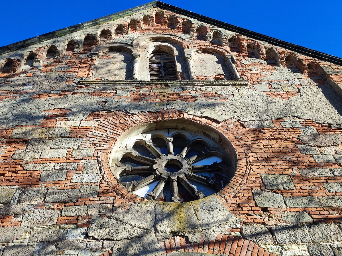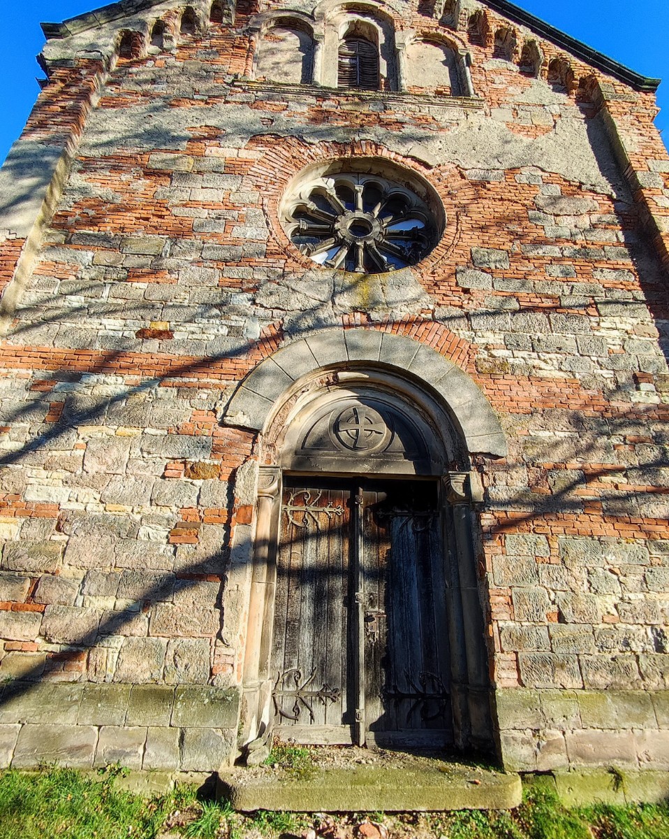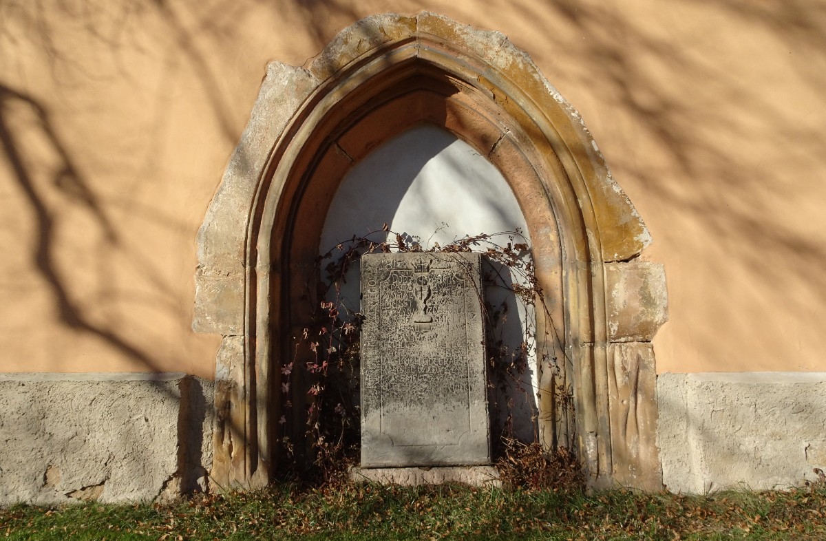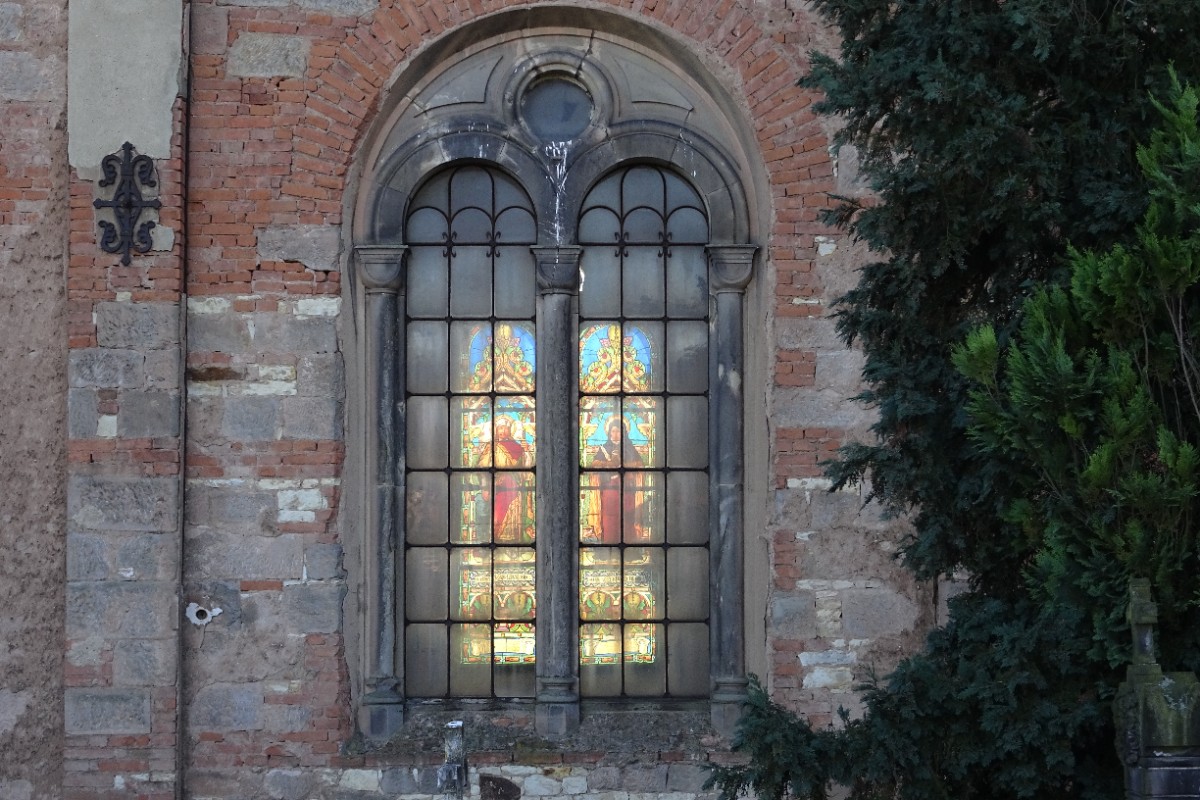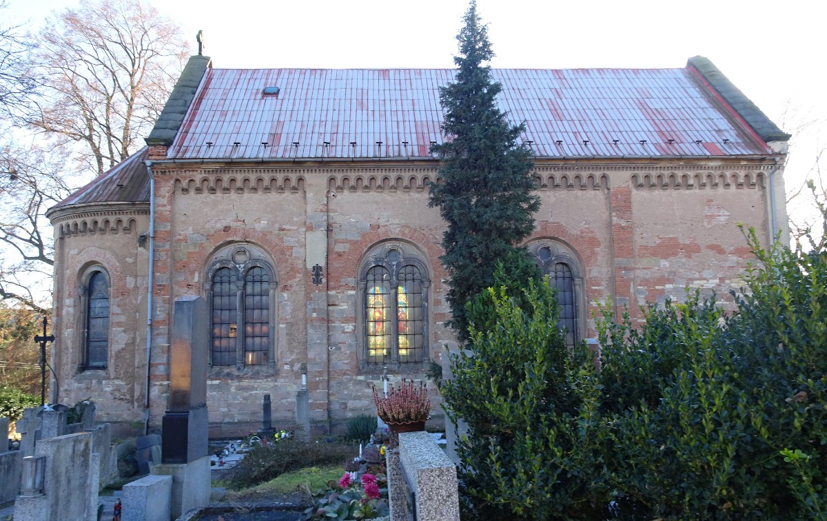 Za dřevěnou zvonicí ze 16. století si musíme vyšlápnout na hřbitov schodištěm kolem fary. Po vstupu na hřbitov nás nejprve zaujme novorománský kostel sv. Víta. Bylo mi líto, že zajímavé průčelí je blízko hřbitovní zdi a nedalo se lépe vyfotit. Po obejití kostela se nám teprve naskytne pohled na zvonici v rohu hřbitova. Ta má zděnou podezdívku a otevřené zvonové patro. Ze tří zvonů se zachoval pouze jediný. Zbylé dva byly zrekvírovány za 1. světové války. Při odchodu ze hřbitova mě upoutala proti světlu barevná okna kostela.