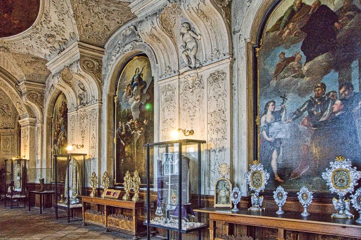 V přízemí jsme si prohlédli bývalou sakristii, kde se kdysi připravovali kněží před mší. Zdi tu lemují vyřezávané skříně pro ukládání mešních rouch a dalších liturgických předmětů.