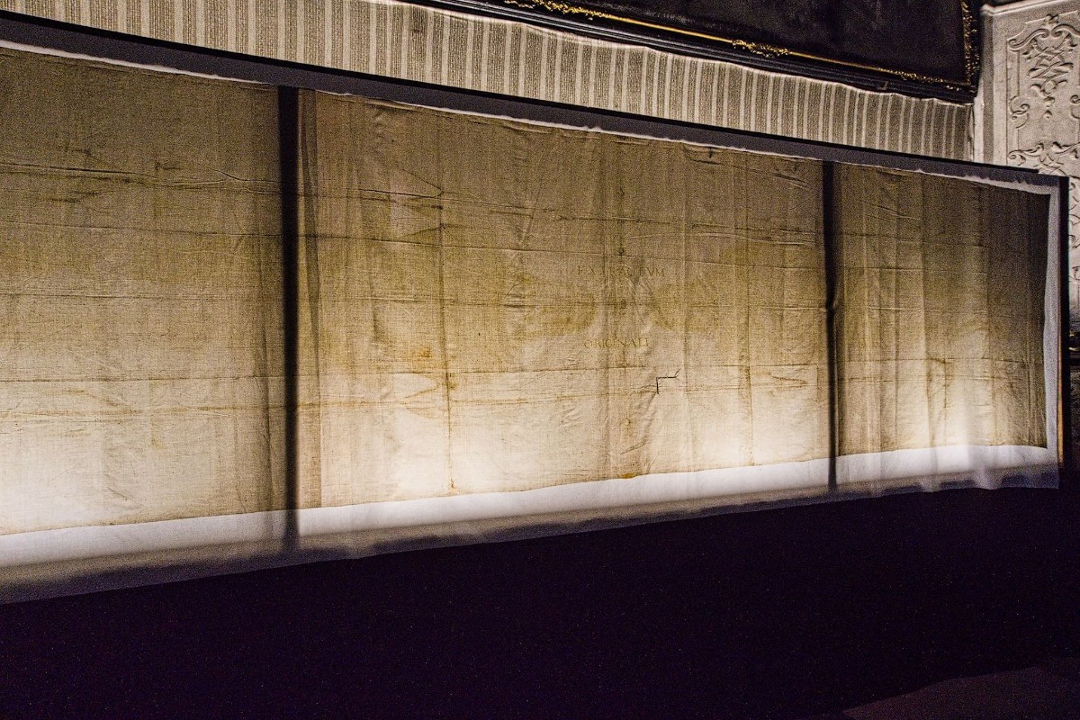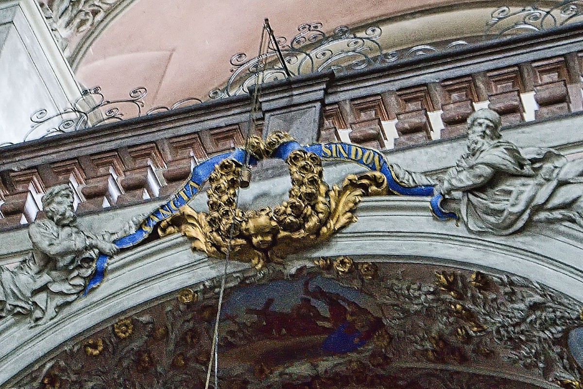 Průvodce nás upozornil na pozlacený štukový věnec nad kaplí sv. Kříže. Za ním se v dřevěné schránce po léta ukrývala ona unikátní kopie Turínského plátna.