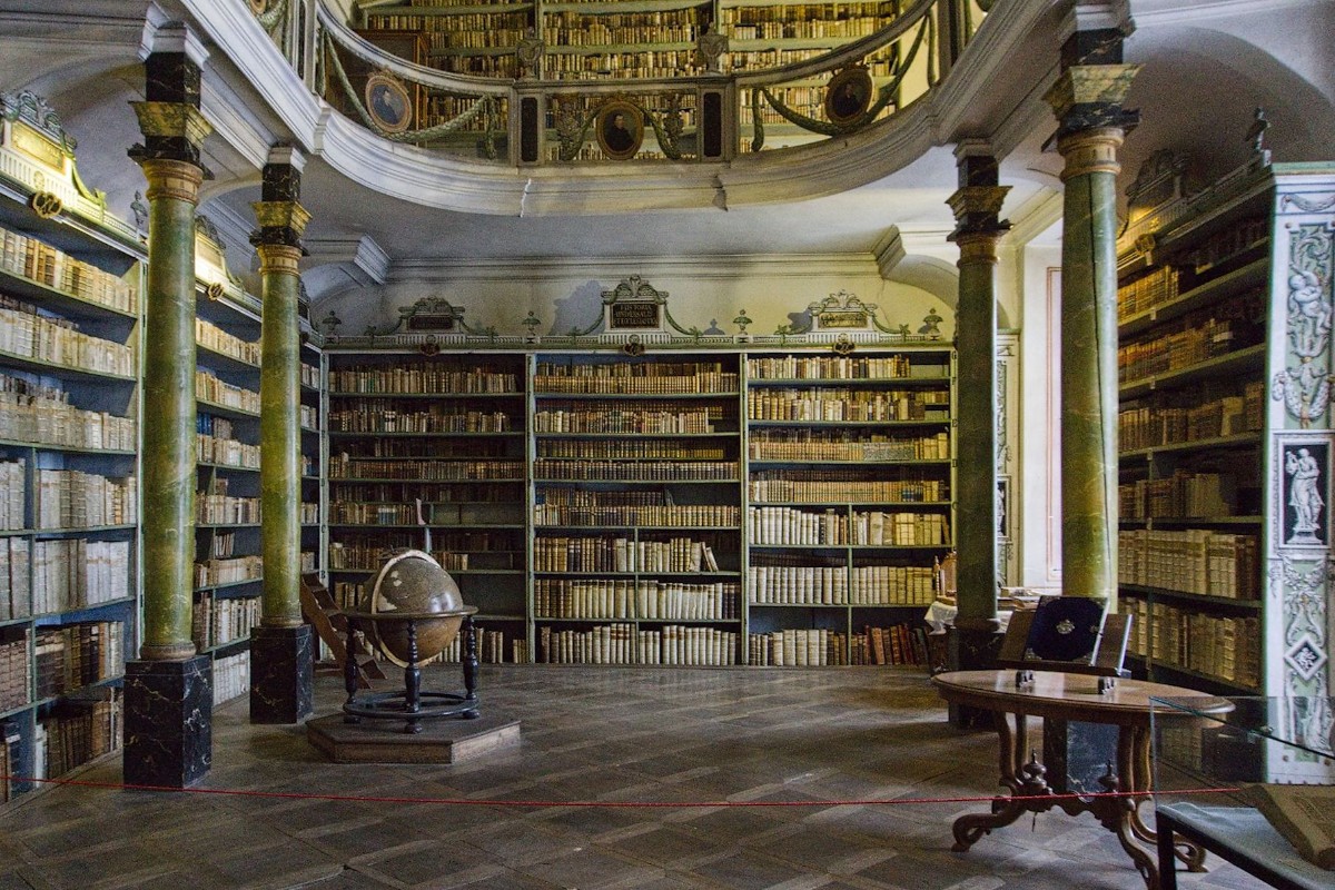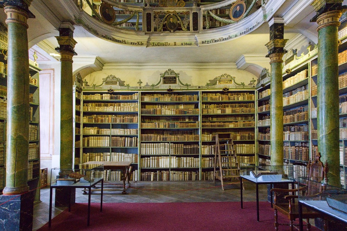 Zdejší knihovna se dochovala ve vzácné celistvosti. Obsahuje kolem sedmnácti tisíc svazků nejen z oblasti teologie, ale i z dalších vědních oborů. Z jazyků jsou tu kromě latiny, hebrejštiny a češtiny zastoupeny i další světové jazyky. Fond byl budován již od počátků kláštera. Část sloužila potřebám řeholníků, část využívali studenti benediktinského gymnázia. Po vypálení břevnovského kláštera husity sem byly přestěhovány některé zachráněné knihy. Mezi nimi slavný Codex gigas, největší rukopisná kniha na světě. Ta bohužel padla za třicetileté války do rukou Švédům. Samotný barokní prostor knihovny s nástropními freskami, ochozem, ozdobnými sloupy a vyřezávanými regály plnými knih působí na návštěvníka impozantním dojmem. Zajímavostí je, že se tu natáčely scény ze seriálu F. L. Věk.