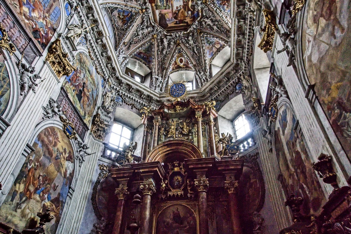 Přímo ze sakristie jsme prošli do fascinujícího kostela sv. Vojtěcha. Ohromil nás rozlohou, výškou, barevností nástropních i nástěnných maleb a hlavně neuvěřitelně bohatou štukovou výzdobou. Poprvé je kostel zmiňován v roce 1357, kdy byl dostavěn. Po zničujícím požáru na konci 17. století proběhla přestavba do současné vrcholně barokní podoby. Započal ji Ital Martin Allio z Lowenthalu a dokončili otec a syn Dientzenhoferové. Postranní kaple zdobí obrazy Václava Vavřince Reinera. Štuky jsou dílem bratrů Soldatiových, fresky ze života sv. Vojtěcha namaloval J. J. Steinels. Sochy vytvořili Jan Brokoff a Matěj Václav Jäckel.