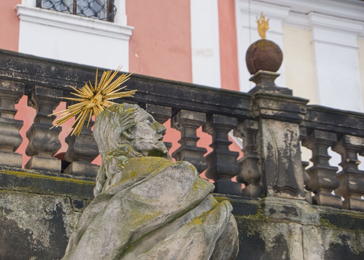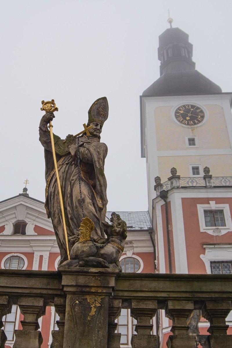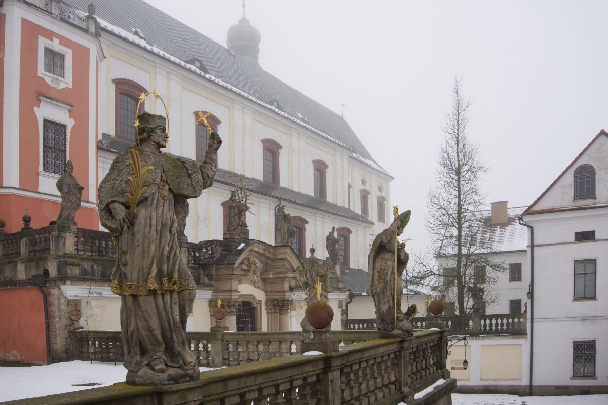 Zakoupili jsme si vstupenky a čas před zahájením prohlídky strávili obhlídkou budov zvenčí. Barokní komplex kláštera – správněji Benediktinského opatství sv. Václava, je impozantní. Kromě samotných budov upoutá návštěvníka bohatá sochařská výzdoba.