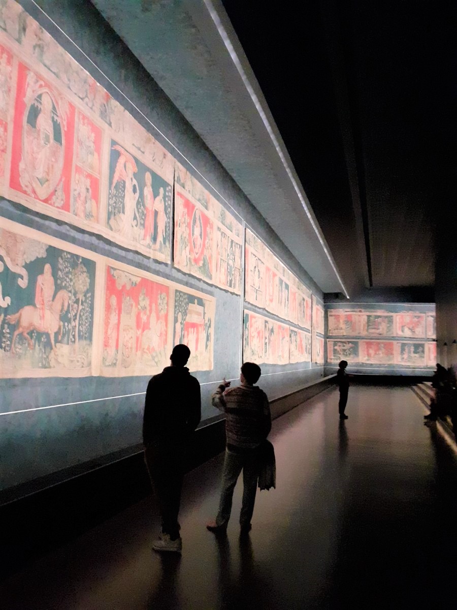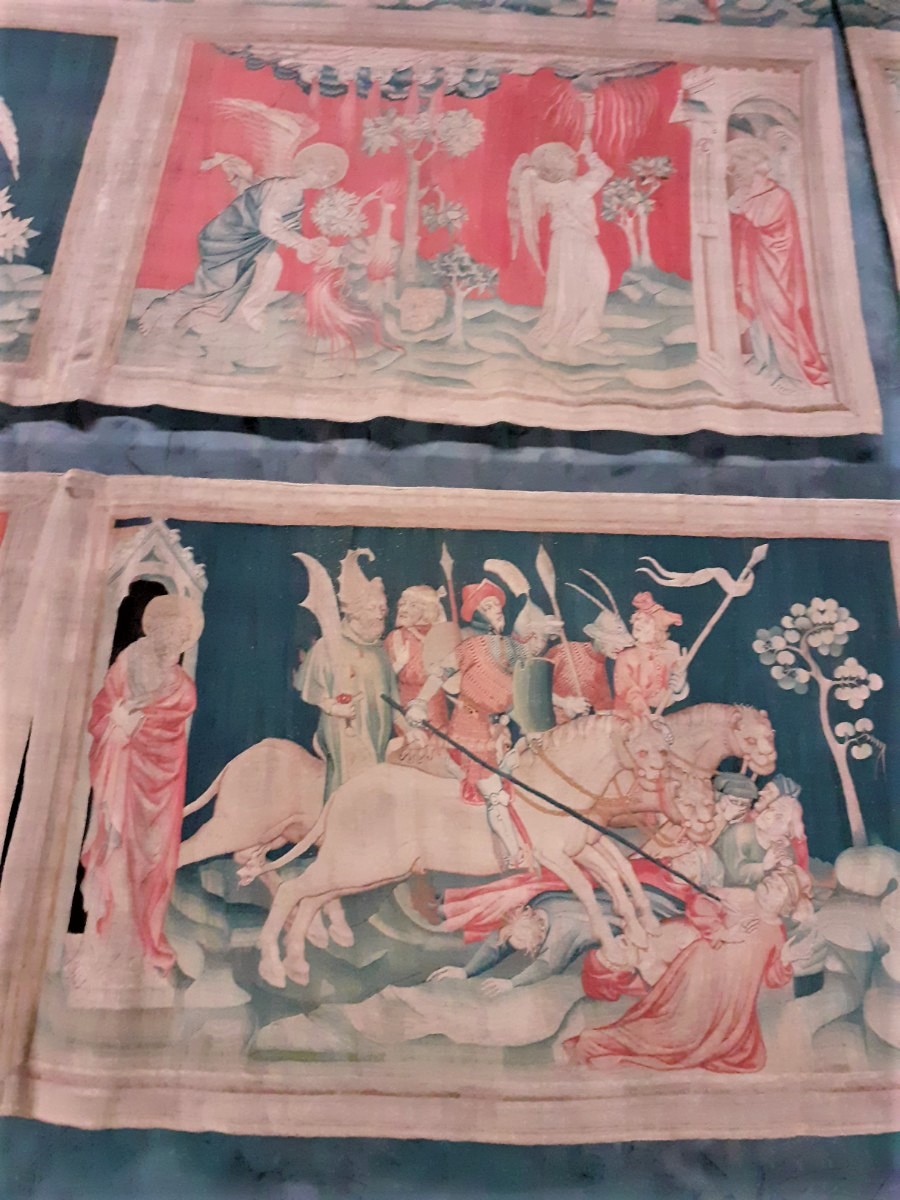 Nemohu vám zatajit ještě jednu úžasnou věc. V interiéru zámku je komnata, na jejíchž zdech se rozprostírá 140 m dlouhá tapisérie. Je vysoká 4,5 m a je na ní zobrazena Apokalypsa podle zjevení sv.Jana. Byla vytvořena ve 14. stol. v Paříži a je svým rozsahem a kvalitou první na světě!