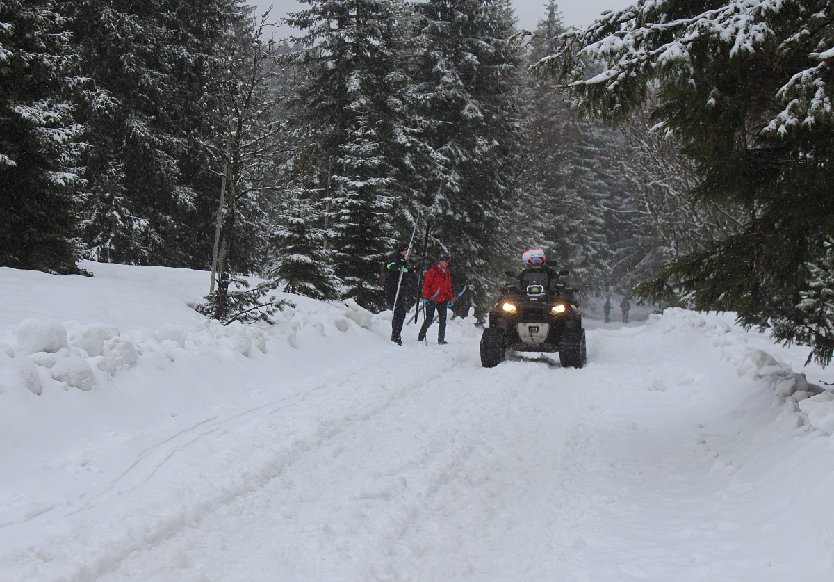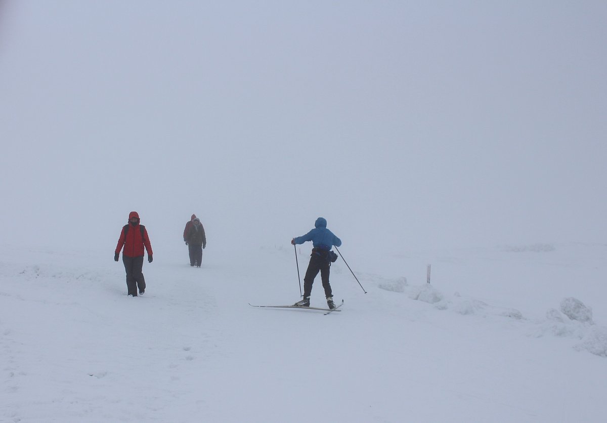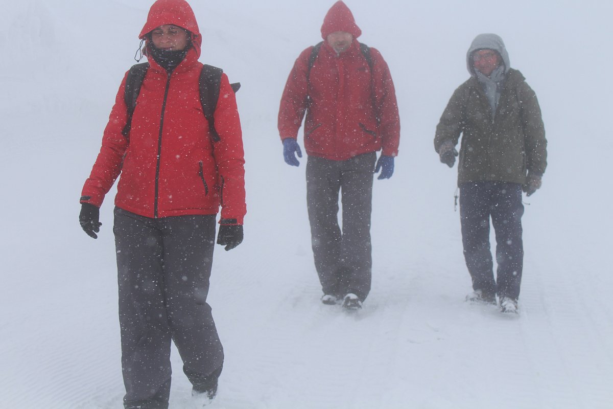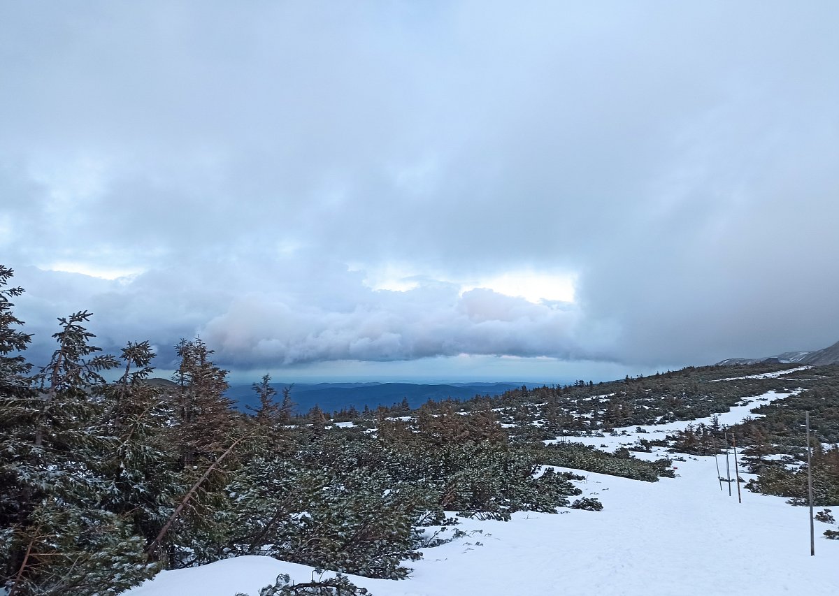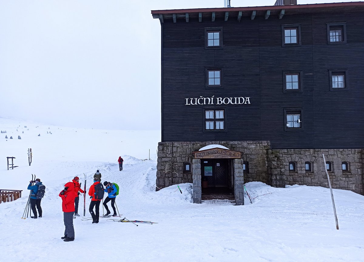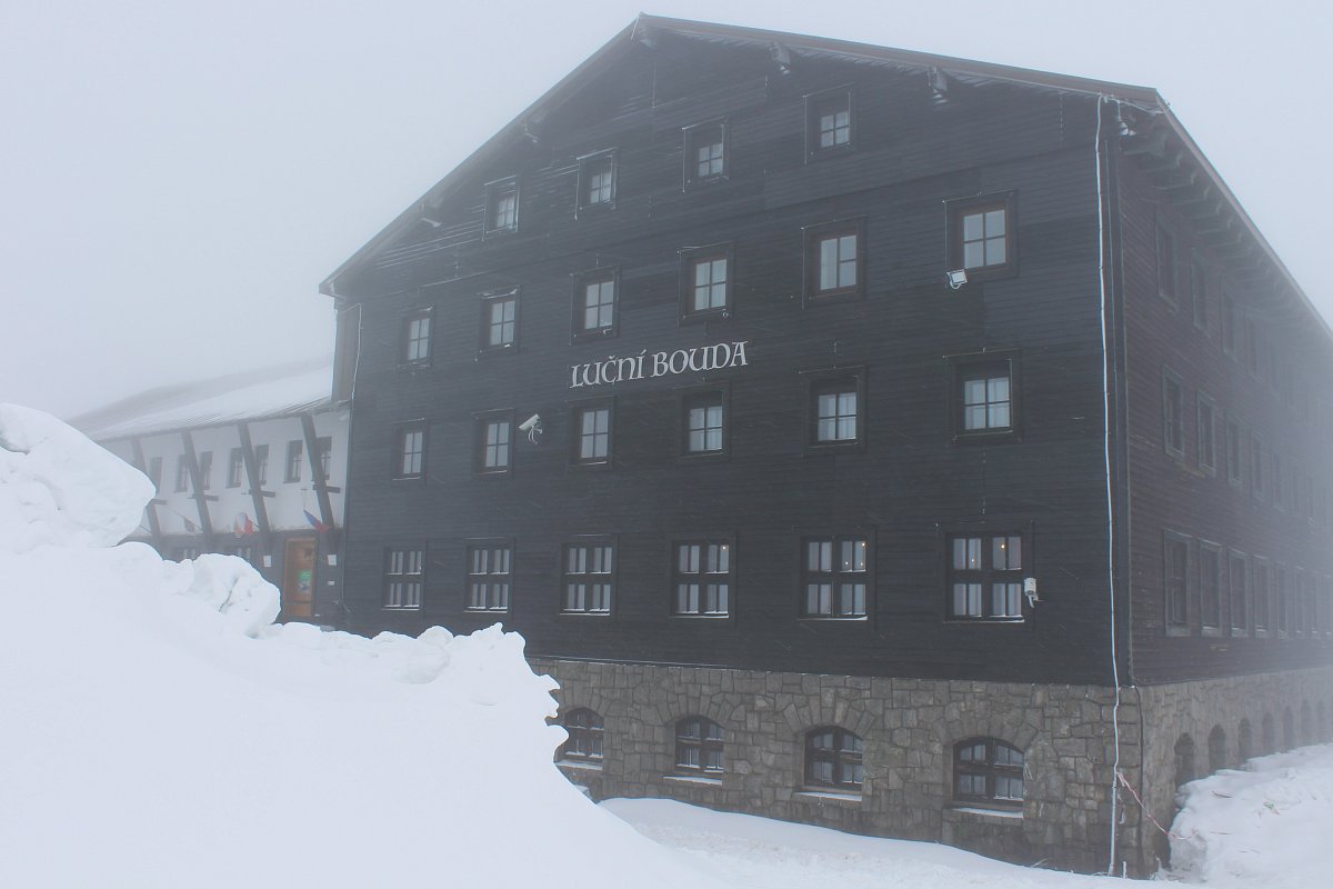 Po cestě se počasí střídalo, hned se přihnala silná dešťová přeháňka a vzápětí vykouklo sluničko. V Peci pod Sněžkou nás uvítal hustý liják, což nám na náladě moc nepřidalo. Přesto jsme se vydali směrem k lanovce na Sněžku. Tam jsme zjistili, že lanovka kvůli větru jezdí jen do poloviny cesty na Růžovou horu. V sedm hodin ráno na Sněžce udeřil orkán. Nezbývalo nám, než potvrdit dopravu na Luční  boudu sněžnou rolbou. Čekání na spoj jsme si zpříjemnili posezením v Hospůdce na peci. Protože už nám bylo smutno po domově, dali jsme si moravského vrabce se zelím a bramborovým knedlíkem. Po obědě dokonce vykouklo i sluníčko. Auto jsme zaparkovali v takovém betonovém parkovacím domě, kde jsem se i docela bála. Doposud jsem takový znala jen z detektivek, a tam se po sobě mezi auty vždy střílelo. Pan řidič rolby byl trošku otrávený životem, říkal, že nahoře už pár dní není vidět ani na krok. Hodinová cesta rolbou k Luční boudě, to byl zážitek na celý život.