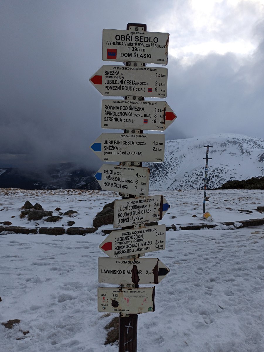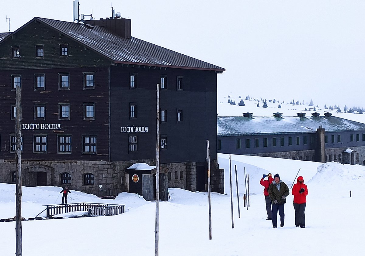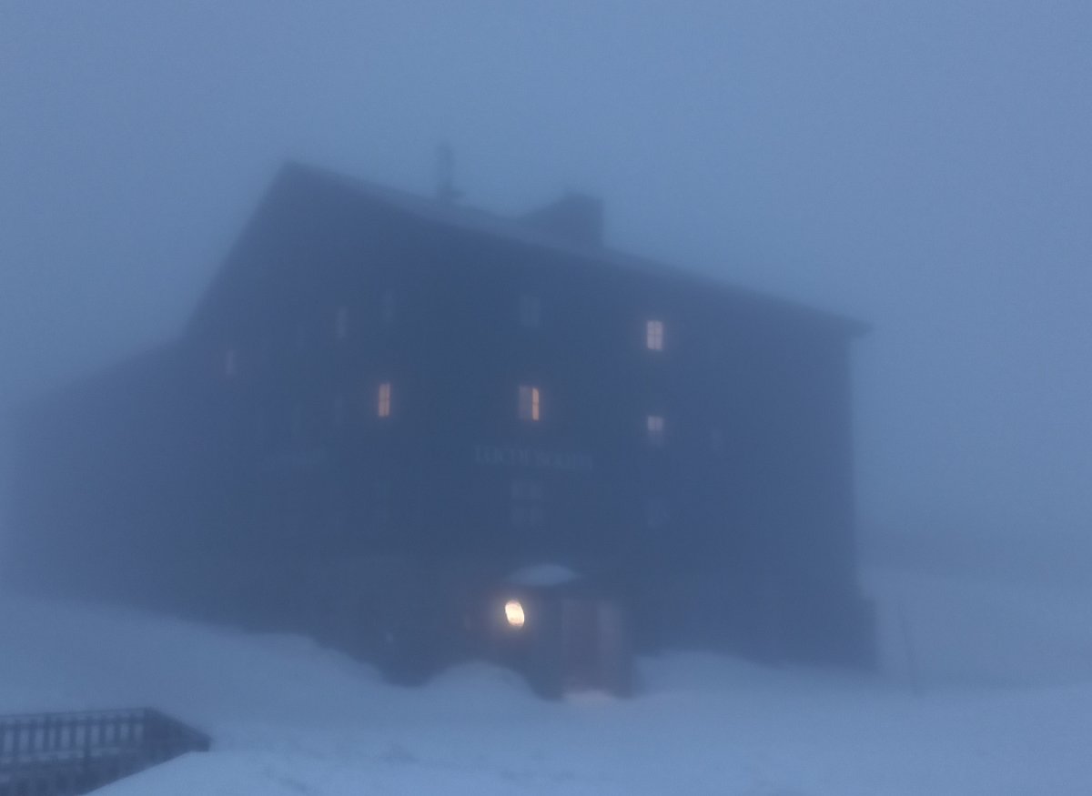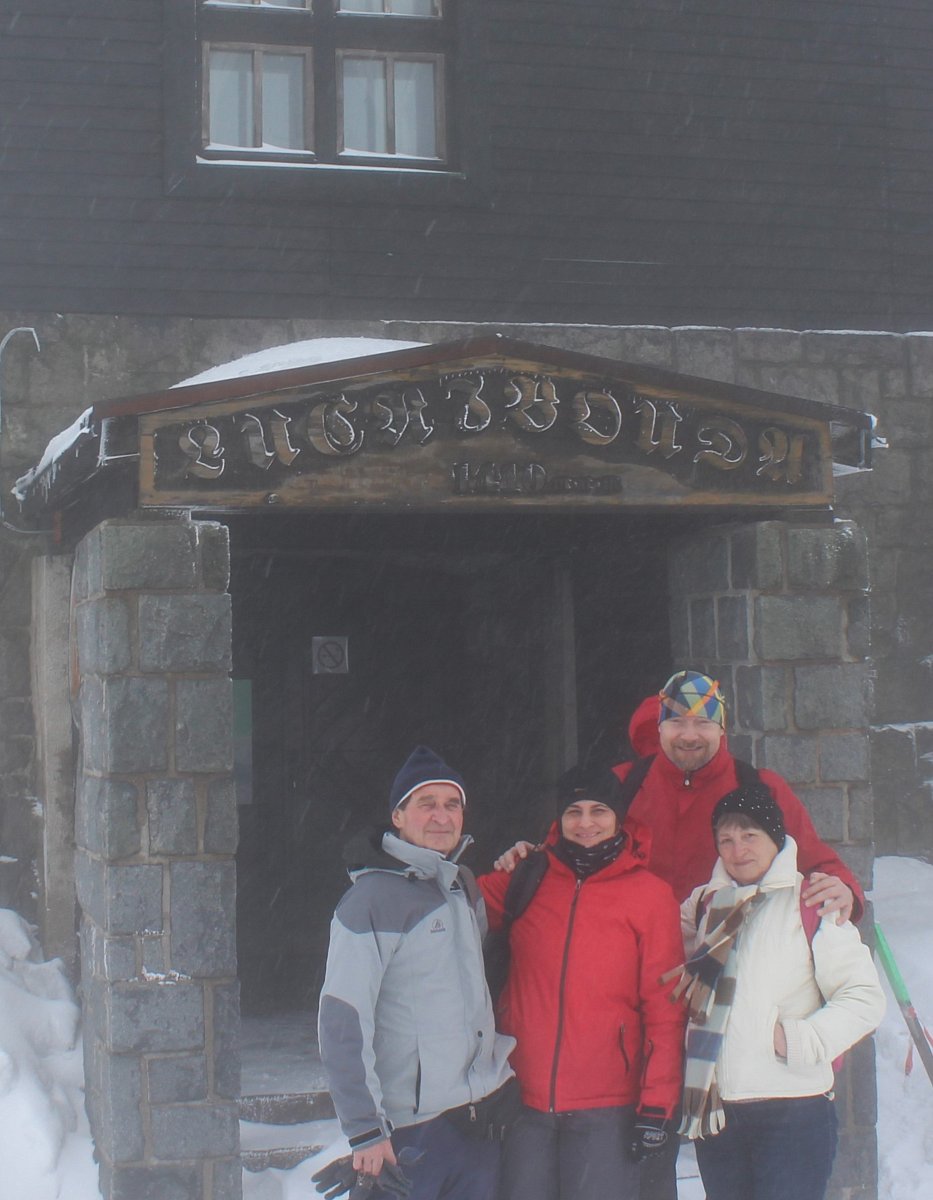 Když jsme v bílé mlze dorazili k cíli, k našemu překvapení se nebe rozestoupilo a my jsme uviděli vrcholek Sněžky. Hned po ubytování na pokojích jsme se vydali dobýt její vrchol. Protože se pomalu blížil večer a my dva senioři jsme se smířili s realitou, že už nestačíme mládí, dovolili jsme dceři a zeťovi, aby se na dobrodružnou cestu vydali sami. Kdyby bylo víc času, tak by jsme ji zdolali taky. Ušli jsme jen 2,5 km k chatě Dom šlaski, která leží na polské straně Krkonoš ve výšce 1400 m hned vedle Obřího dolu. Když jsme se na chatě trošku ohřáli a dali razítko do turistického deníčku, obrátili jsme se zpět k dočasnému domovu. Dveře od pokoje jsme otevřeli vyťukáním kódu, zahřáli jsme se horkou sprchou a pod dekou jsme netrpělivě čekali na naše dva zbylé turisty. Za chvíli přišla SMS, že v pořádku sestoupili do sedla, a nám se docela ulevilo. Na zpáteční cestě ze Sněžky prý potkali jednoho osamělého turistu, a že vypadal dost zkušeně. Za další půlhodinku už klepali na naše dveře. My jsme měli pokoj v první poschodí, oni ve druhém. Asi se tam drží hesla: Co nejdál od tchyně.