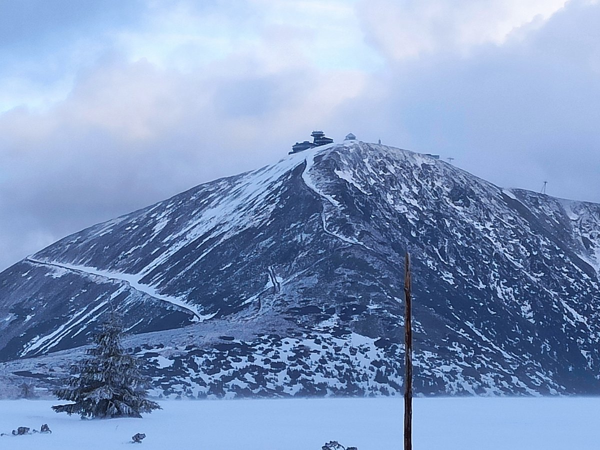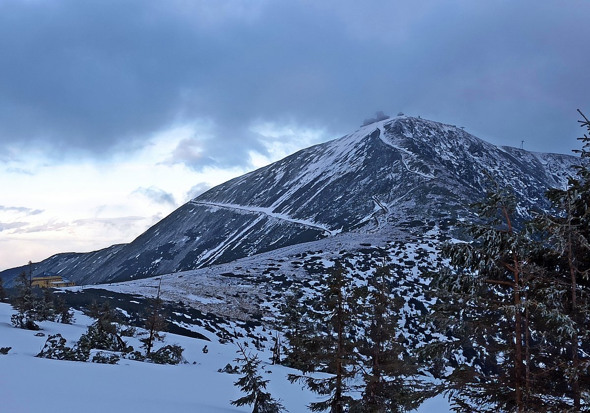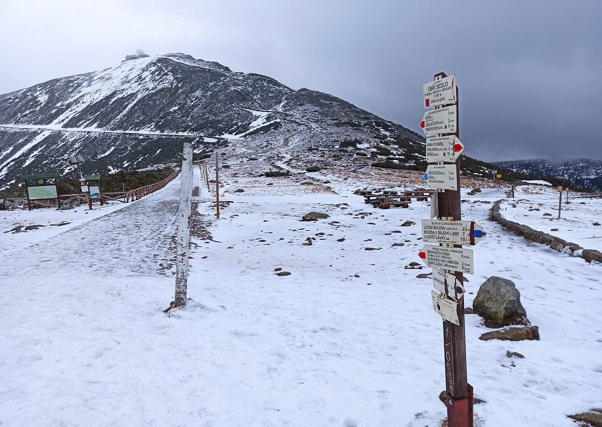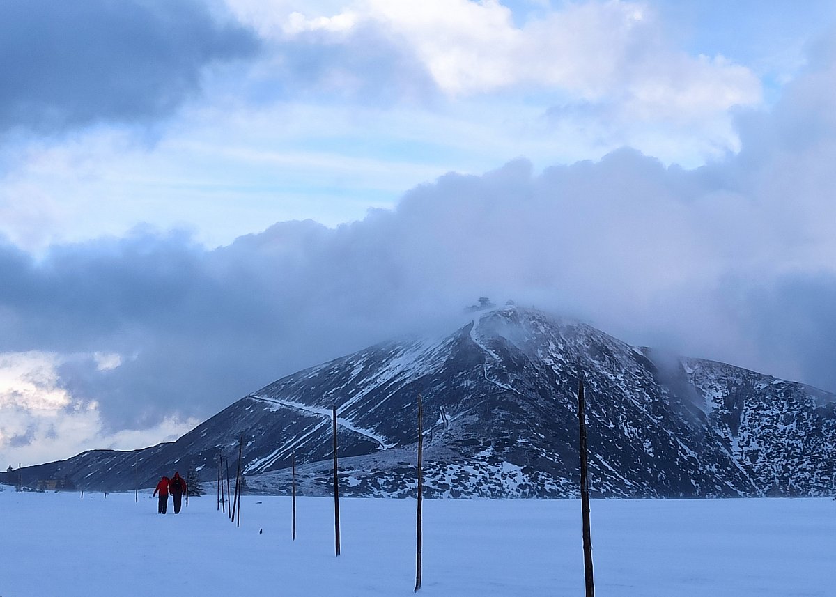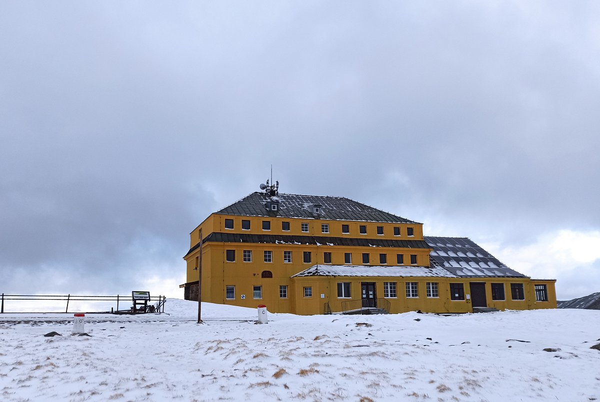 Když jsme v bílé mlze dorazili k cíli, k našemu překvapení se nebe rozestoupilo a my jsme uviděli vrcholek Sněžky. Hned po ubytování na pokojích jsme se vydali dobýt její vrchol. Protože se pomalu blížil večer a my dva senioři jsme se smířili s realitou, že už nestačíme mládí, dovolili jsme dceři a zeťovi, aby se na dobrodružnou cestu vydali sami. Kdyby bylo víc času, tak by jsme ji zdolali taky. Ušli jsme jen 2,5 km k chatě Dom šlaski, která leží na polské straně Krkonoš ve výšce 1400 m hned vedle Obřího dolu. Když jsme se na chatě trošku ohřáli a dali razítko do turistického deníčku, obrátili jsme se zpět k dočasnému domovu. Dveře od pokoje jsme otevřeli vyťukáním kódu, zahřáli jsme se horkou sprchou a pod dekou jsme netrpělivě čekali na naše dva zbylé turisty. Za chvíli přišla SMS, že v pořádku sestoupili do sedla, a nám se docela ulevilo. Na zpáteční cestě ze Sněžky prý potkali jednoho osamělého turistu, a že vypadal dost zkušeně. Za další půlhodinku už klepali na naše dveře. My jsme měli pokoj v první poschodí, oni ve druhém. Asi se tam drží hesla: Co nejdál od tchyně.