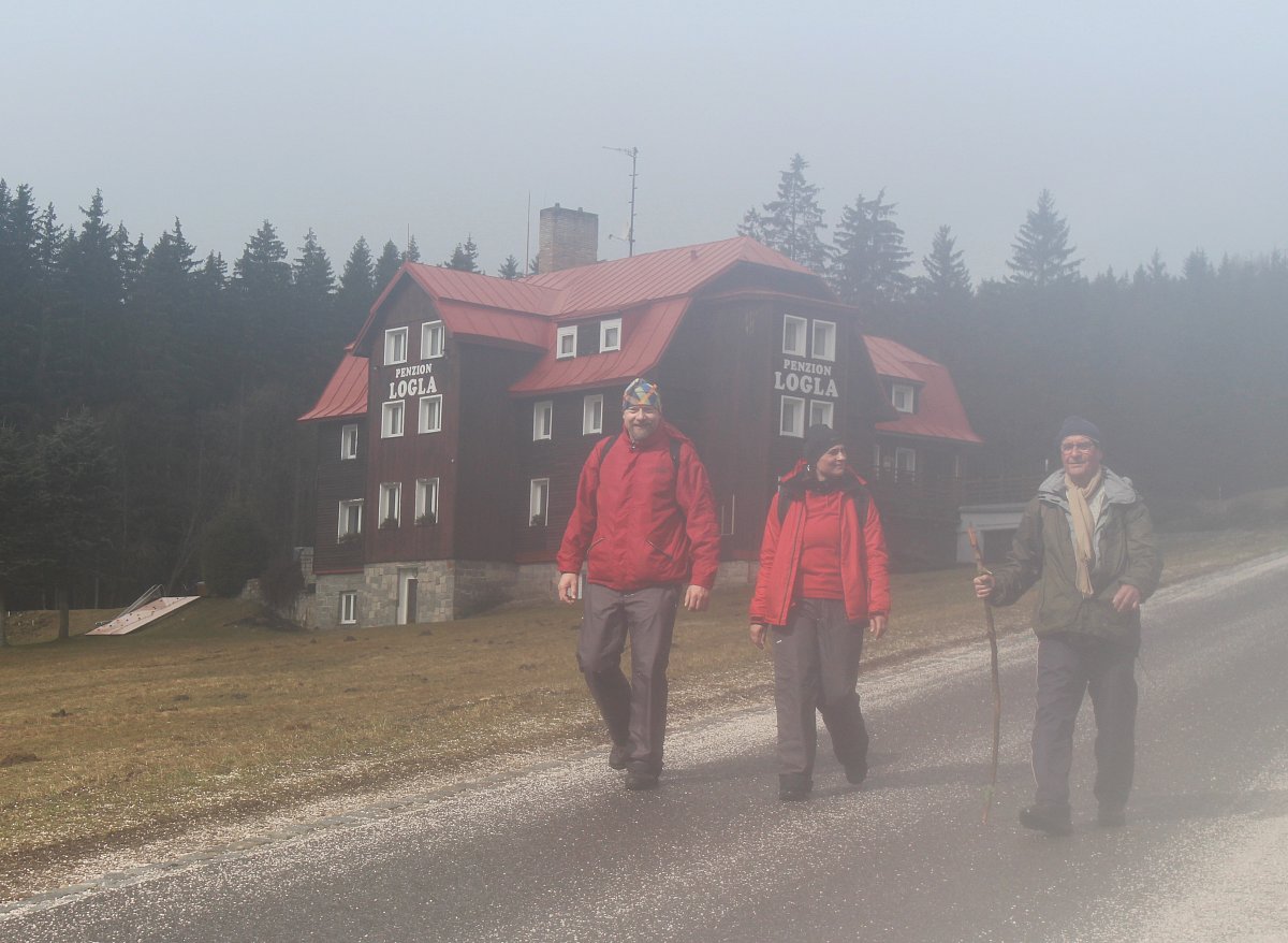 Ráno nám vůbec nevadilo, že se změnil zimní čas na letní, snídaně se podávala až do devíti hodin. A ta byla. Široká nabídka uzenin, sýrů, zeleniny, pomazánek.... To všechno doplňovalo čerstvé domácí pečivo, vdolečky a jiné koláče,upečené v místní pekárně. Ty jejich vyhlášené rohlíky! Spořádali jsme toho, co se dalo, poseděli ještě u kávy, až přišel čas opustit pokoje a pěšky se vydat na zpáteční 8 km cestu proti větru v bílé husté mlze. Občas jsme potkali pár turistů a běžkařů.