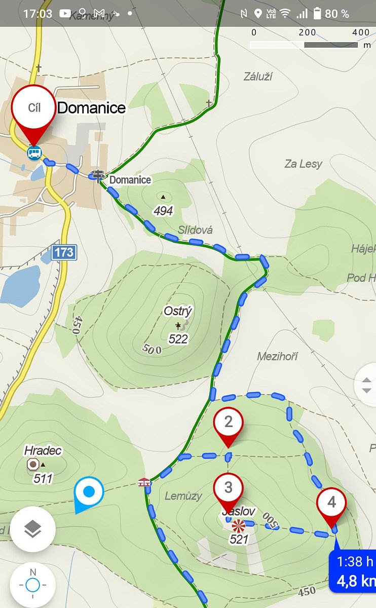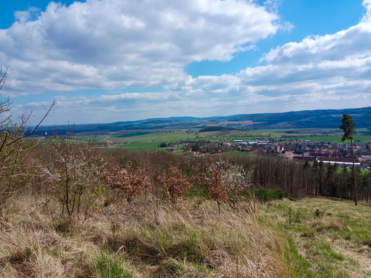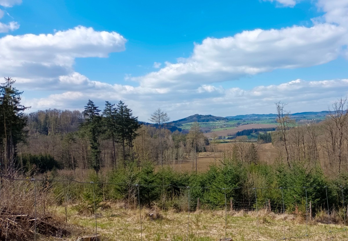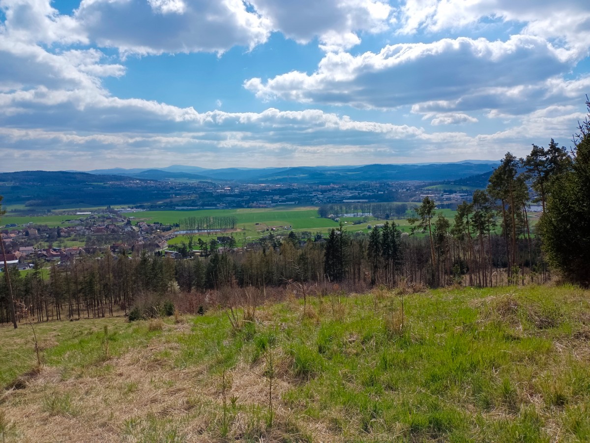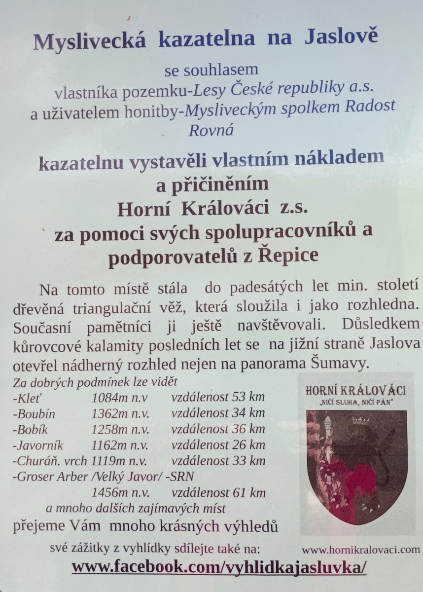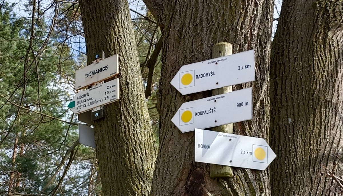 Zelená značka za vsí míjí vrch Jaslov, na kterém je postavena jednoduchá rozhledna. Ale pohledy jsou krásné i z vyhlídky s lavičkou pod rozhlednou. Zacházka na vrchol je do prudkého kopce, ale stojí to za trochu námahy. Lesem se dostaneme opět na značku a mezi poli a loukami s výhledy do kraje a lesním úvozem dojdeme do Domanic u Radomyšle.