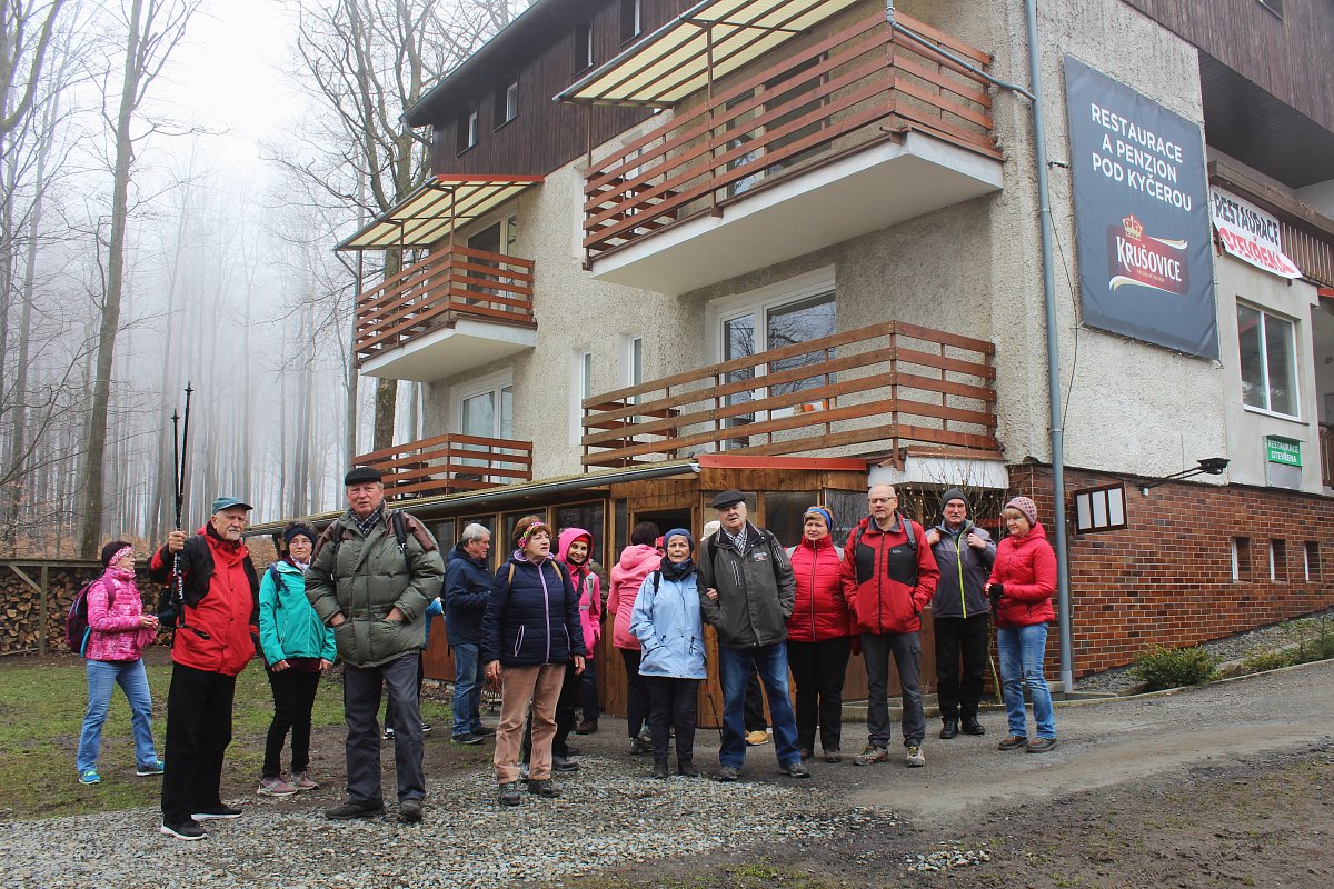 Vyjeli jsme ráno po osmé hodině vlakem z Holešova do Bystřice pod Hostýnem. Tam jsme přestoupili na autobus, který nás vyvezl na kopec Tesák. Je to vyhlášené turstické centrum Hostýnských vrchů, jenže to s ním jde z kopce. Historická turistická chata z roku 1938 v lednu 2022 vyhořela, a další ubytovna s restaurací je na prodej. Blýská se ale na lepší časy, majitel vyhořelé chaty chce postavit novou,hodně podobnou té původní. Stavební projekt už je vypracován a sbírka vynesla 2,2 mil korun. Ostatní pokryje půjčka a dotace.