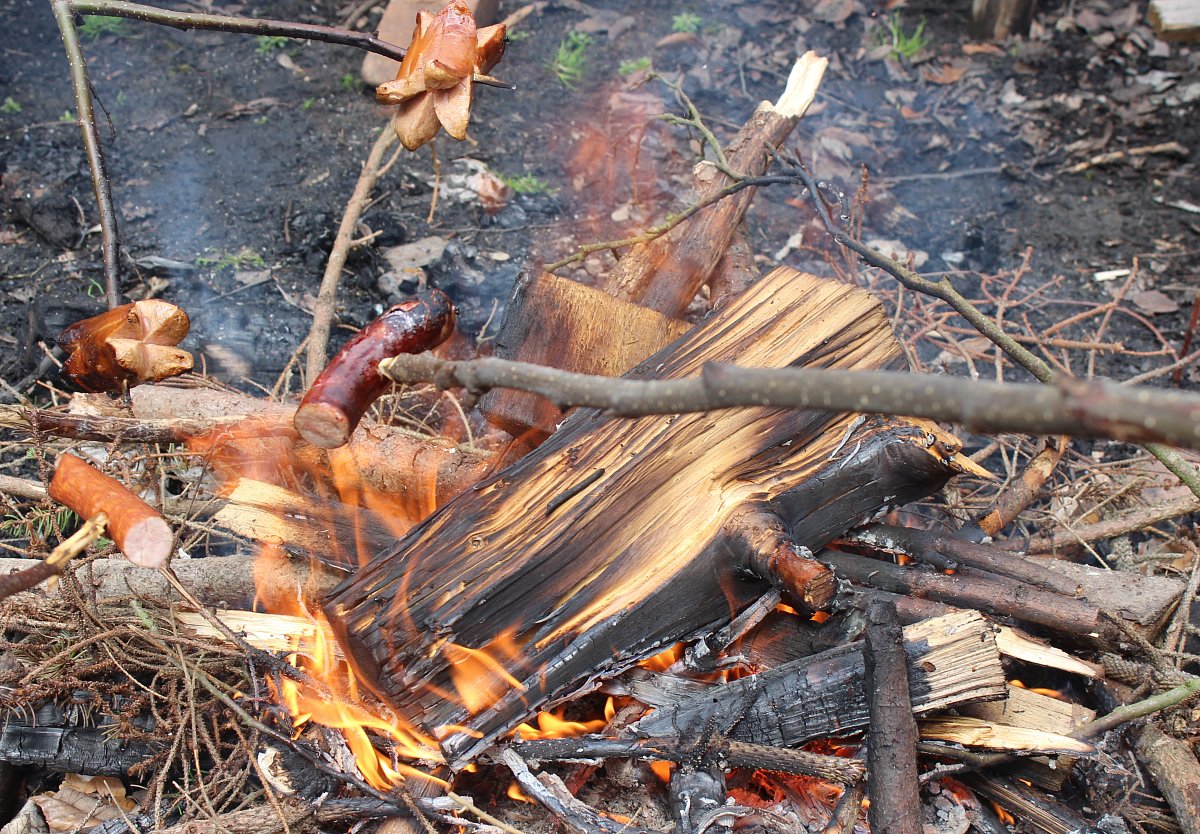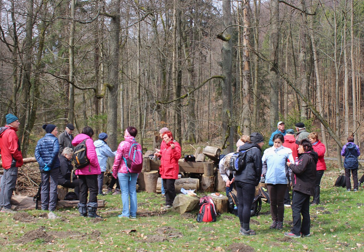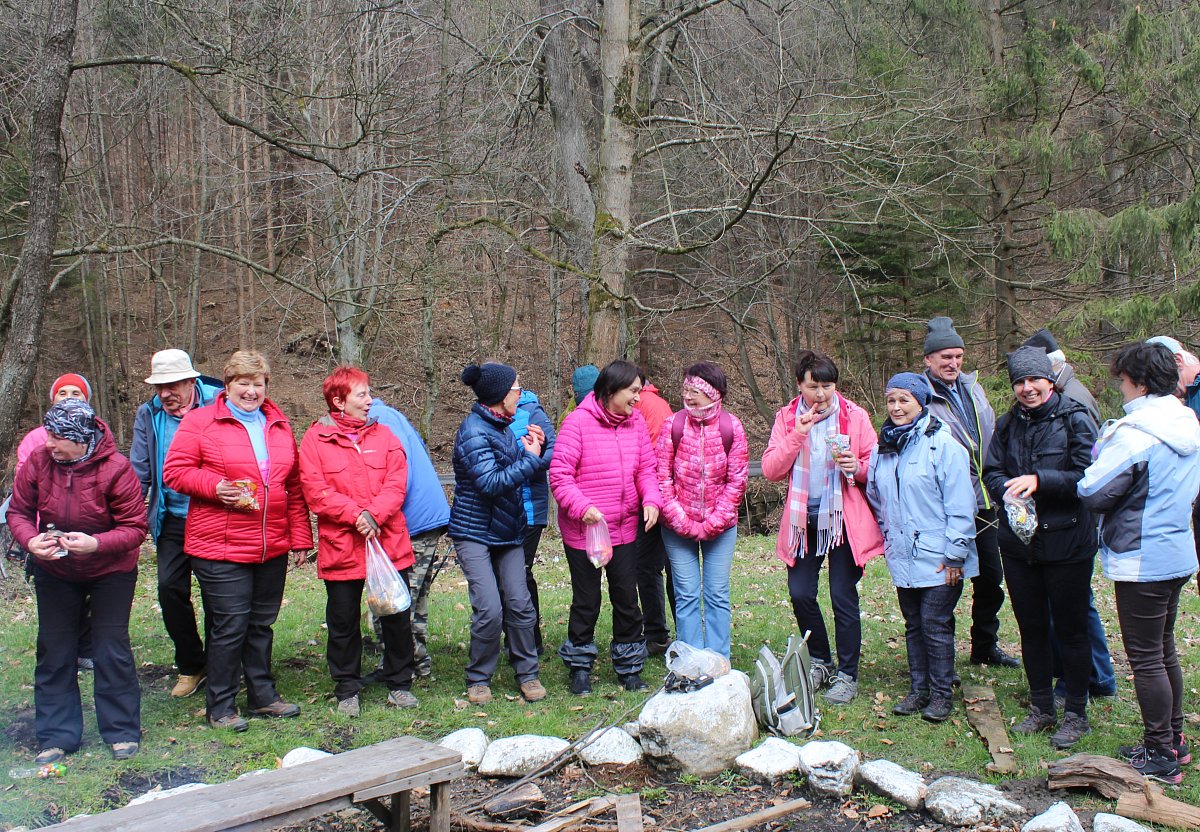 Po dalších 4 km jsme se zastavili na louce s dřevěnou chatou, kde bývají v létě skautské tábory. Rozdělali jsme si v ohništi oheň, opekli špekáčky, klobásky a ochutnali velikonoční cukroví. Následovala tradiční šibačka a po ní obdarování šibačů vajíčky, dobrotami nebo štamprlkou. Počasí se začalo umoudřovat a s tím se zvedala i naše nálada. Čekalo nás ještě pár kilometrů do Rajnochovic, kde jsme zakotvili v hostinci Ve dvoře. Bývávalo tam jinak veselo, ale letos nebyli žádní kolaři, žádné rodiny s dětmi. Prý to měli pár týdnů zavřeno, tak snad si zase lidi zvyknou. Po našem příchodu to ale v lokále jenom hučelo, a personál hned ožil. Většina výletníků po občerstvení odešla na autobus, který je odvezl zpět k domovu. Nás sedm statečných ještě pokračovalo 4 km přes vesnici Rajnochovice, přes louky okolo lomu na vlakovou stanici do Podhradní Lhoty. V