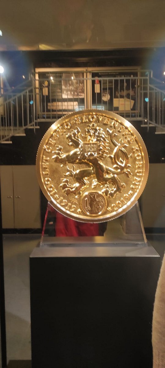 Poté jsme zamířili do České národní banky, která stojí naproti. Bezpečností opatření, projítí rámem, odložení tašek i kabátů a pak jsme mohli vejít do návštěvnického centra. S fundovaným průvodcem jsme se dozvěděli mnoho ze světa peněz.V původním trezoru Živnostenské banky, dnes České národní banky se nachází expozice Lidé a peníze. Dozvěděli jsme se spoustu zajímavostí- jak peníze vznikly, o české a československé měnové histori, o vývoji ochranných prvků bankovek a spoustu dalšího. V expozici je vystavena unikátní zlatá mince, která má hodnotu 100 000 000 Kč. Váží snad kolem 130 kg. Je to největší zlatá mince v Evropě a druhá největší na světě. Tuto minci vydala ČNR v roce 2019, k příležitosti 100.vzniku československé měny.