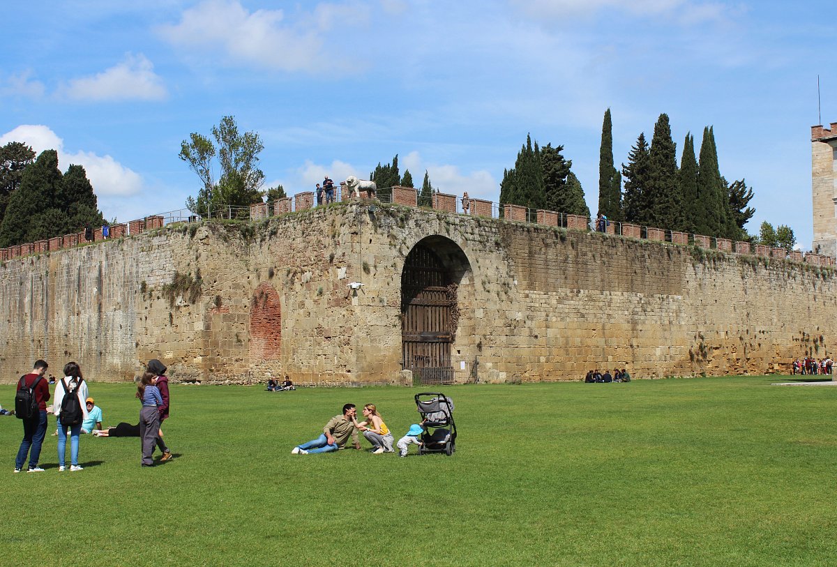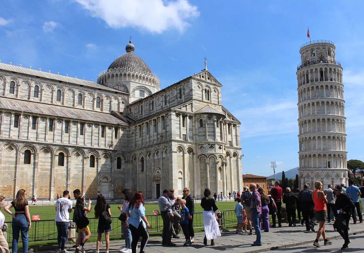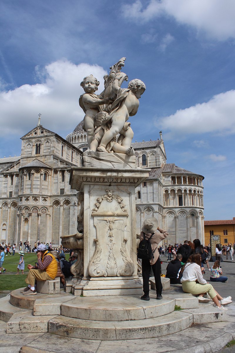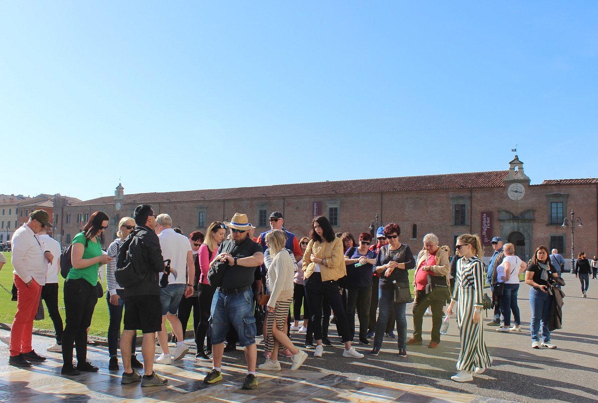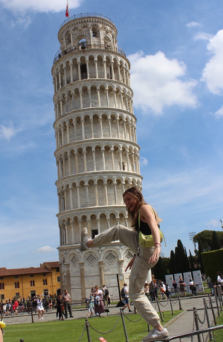 Na místě jsme byli mezi prvními. Pohled na bílé stavby uprostřed udržovaného zeleného trávníku byl úchvatný. Měla jsem představu, že tam někde stojí jedna opuštěná šikmá věž, ale ona byla obklopena krásnými mramorovými stavbami. Celkem jsou na jednom místě čtyři. Tomuto místu se říká "Pole zázraků". Nejprve jsme si prohlédli Baptisterium sv. Jana Křtitele, které měří na výšku 55 metrů. Stavba postavená již ve 12. století je obložena bílým mramorem a zdobená mnoha různými sochami.Samotná střecha, která připomíná citron, byla dostavěna až o dvě století později. Další památkou je hřbitov Camposanto Monumentale, nejkrásnější pohřebiště na světě. Dominantou je Katedrála Nanebevzetí Panny Marie, nejstarší budova z uvedených, která se začala stavět již v roce 1064. Tuto stavbu bohužel zastiňuje ona vyhlášená šikmá věž. Když jsme dokončili prohlídku chrámu, stačili prostranství mezi památkami zaplnit návštěvníci z celého světa. Počasí se vydařilo a snad každý se chtěl zvěčnit na památku před posledním divem, před šikmou věží. Tato osmipatrová stavba byla postavena na písečném podloží a krátce před dokončením už se začala naklánět. Celé generace stavitelů se snaží památku zabezpečit před zřícením.