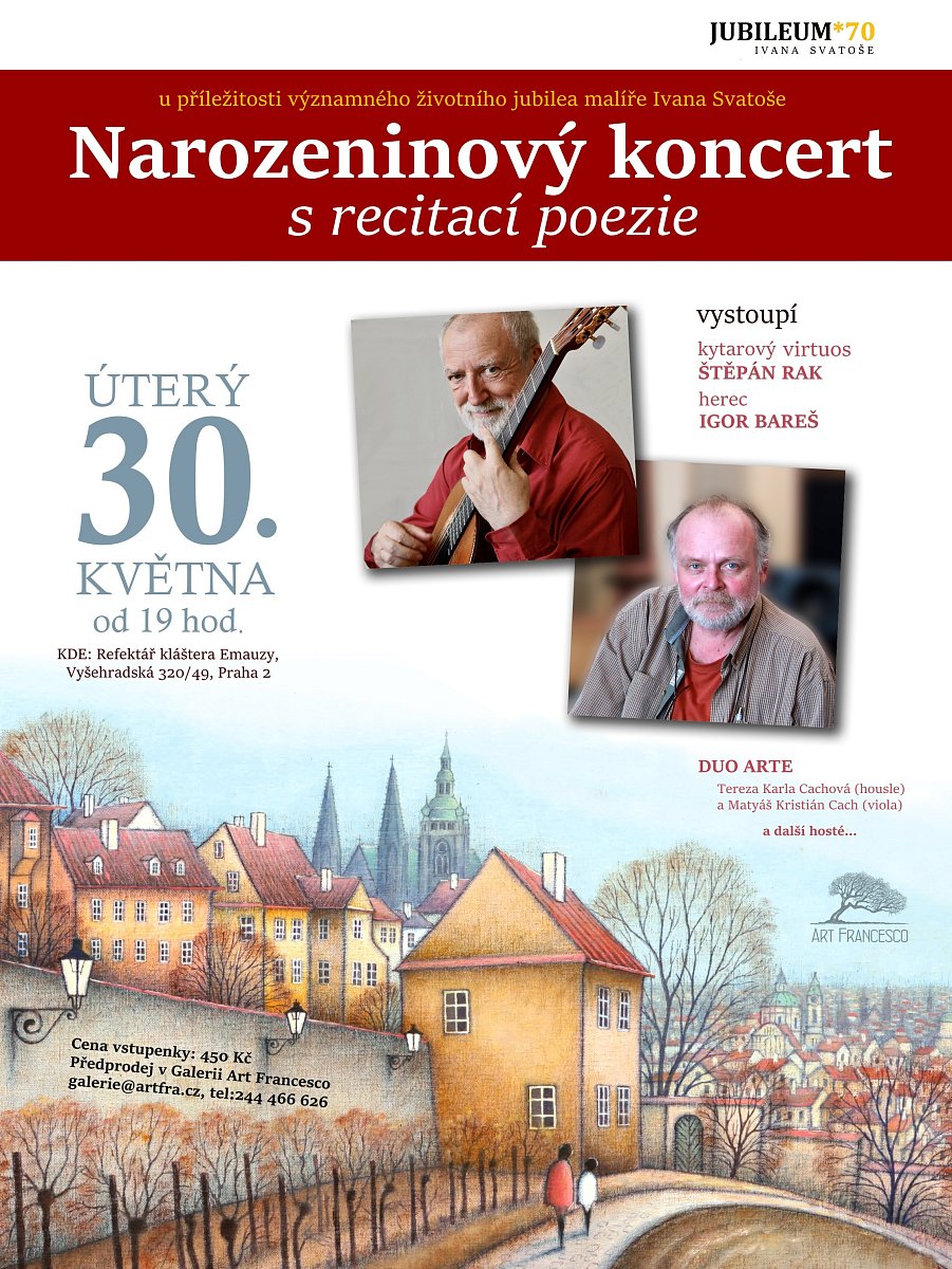 Pokud byste chtěli Ivanovi Svatošovi popřát k nadcházejícímu jubileu, můžete tak udělat 30. května od 19 hodin v refektáři emauzského kláštera na koncertě, jehož hlavními protagonisty budou kytarista Štěpán Rak a herec Igor Bareš.