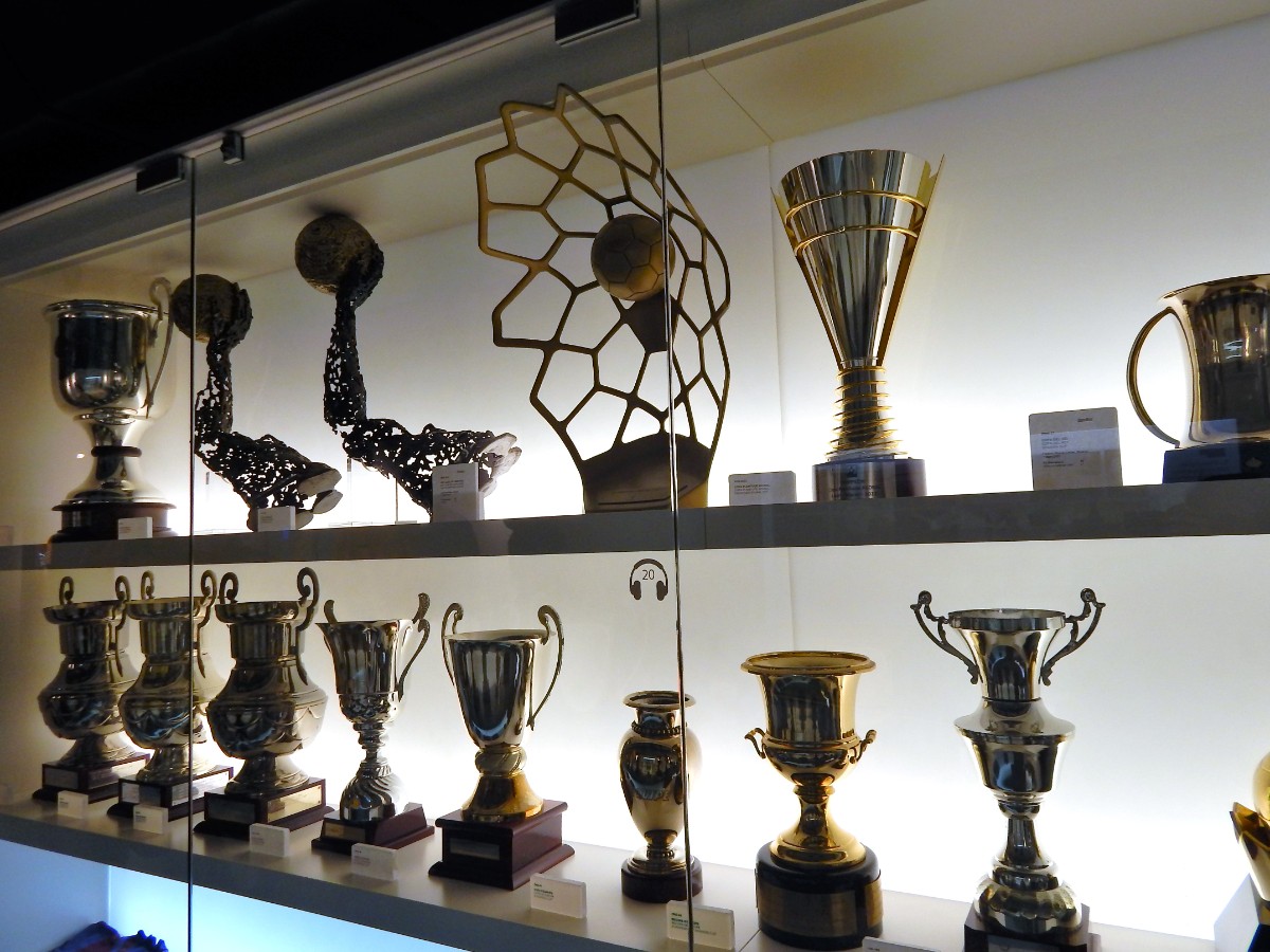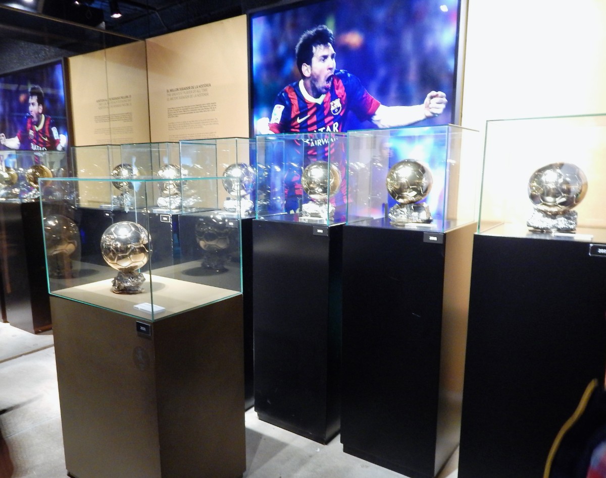 Mohli jsme se pohybovat ve vymezené části a jak se ručičky hodin přibližovaly k poledni, návštěvníků kolem nás přibývalo. Kochali bychom se déle, ale dav lidí nás postupně vytěsnil až do prostoru muzea. U první vitríny jsem chtěla počítat poháry, od druhé jsem přestala. Pohárů jsou stovky, i když nejen za fotbalová vítězství, ale i za jiné sporty. U zlatých míčů a fotky Lionela Messiho se fotili malí, velcí, kluci i holky. Prodavači v obchodu se měli co ohánět. Návštěvníci kupovali trička, bundy, tepláky, šály, míče, tašky, přívěsky, fotografie, vlastně kdeco. Všechno s logem FCB. Malým klukům to slušelo a radostné jiskřičky v očích byly pro jejich rodiče asi tou největší odměnou.