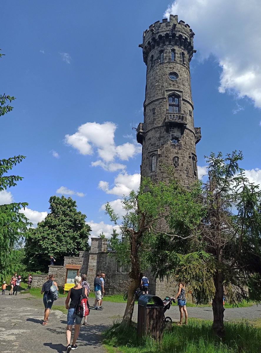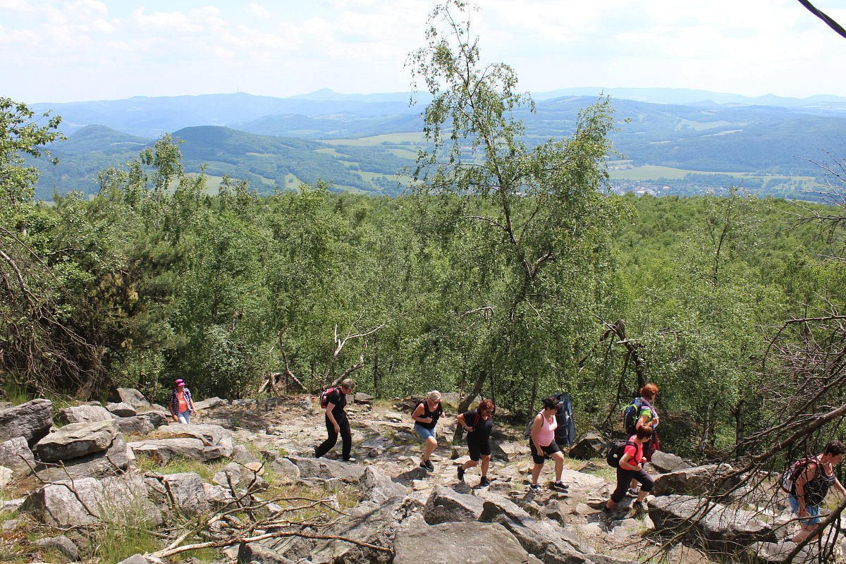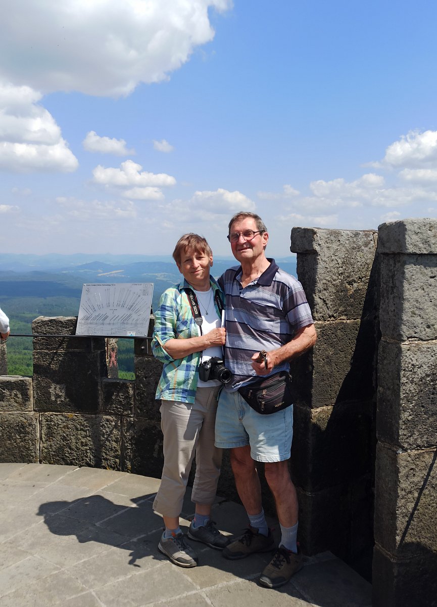 Dopoledne byla na programu prohlídka Děčínského zámku, jeho krásné růžové zahrady, výstup na vyhlídku Nebíčko a jiné zajímavosti a památky. Odpoledne jsme se přesunuli autobusem k Hřebenové boudě pod rozhednou a po červené značce po kamenech jsem se vyšplhali k cíli našeho výletu. Nedělní odpoledne bylo slunečné, výhledy do okolí nádherné. Potkávali jsme ostatní turisty, na chodníčku bylo docela živo. Pod rozhlednou se nám moc líbilo malé jezírko. Vystoupali jsme těch 153 schodů nahoru a byli jsme odměněni krásnými výhledy na všechny čtyři světové strany.
