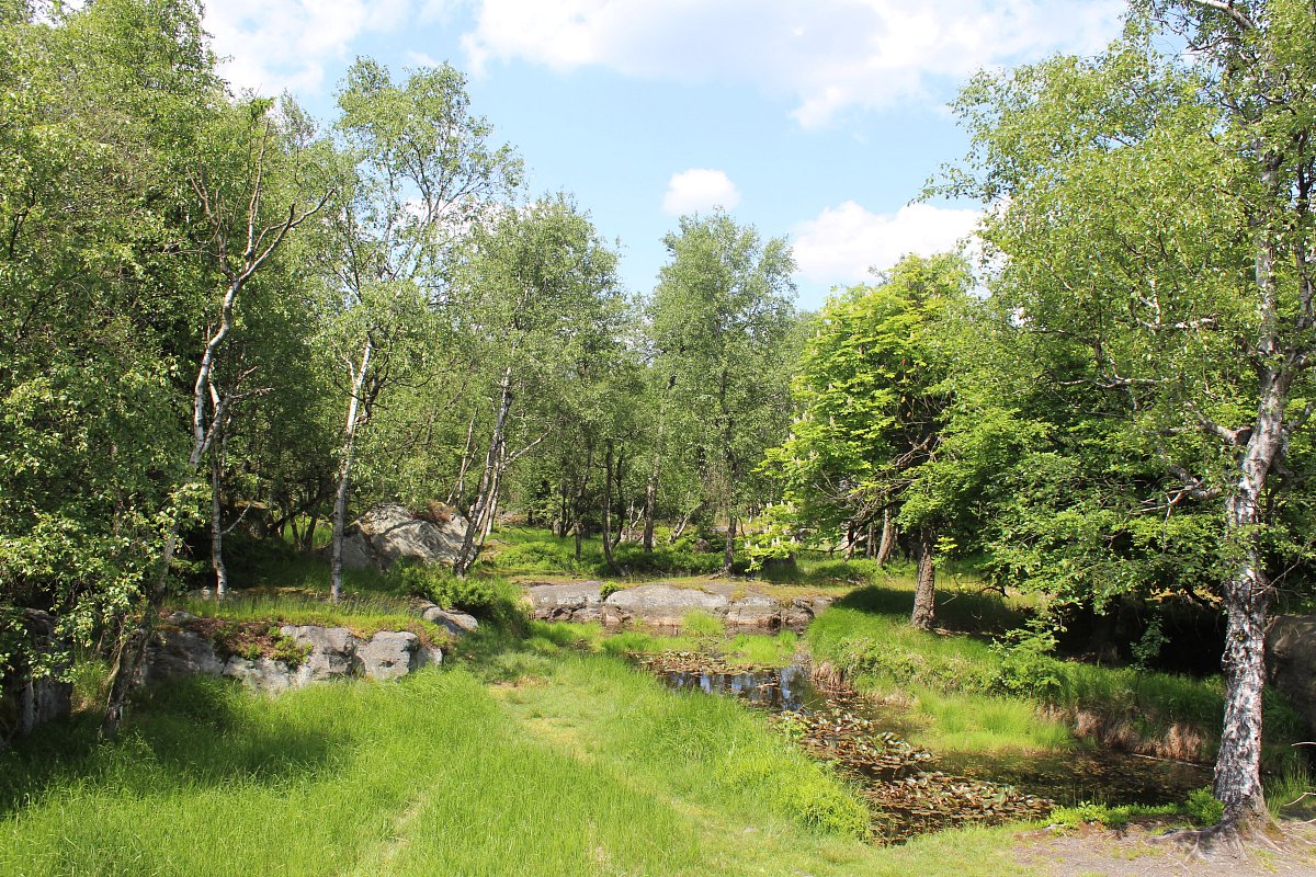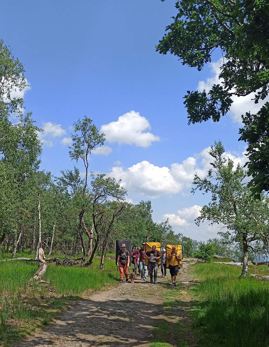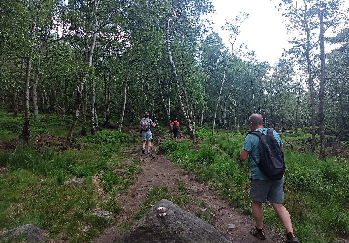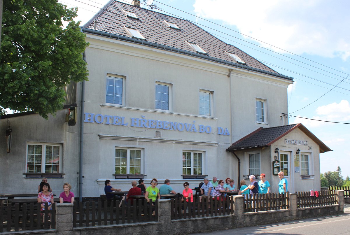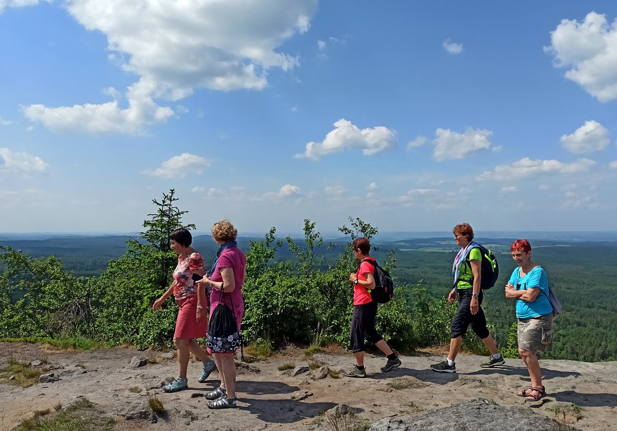 Po malém občerstvení a nasátí příjemné atmosféry jsme se rozhodli vrátit jinou cestou, a to zpevněnou okolo Drážďanské vyhlídky. Cesta vedla vedle skalního masivu a přes hezky zelené březové hájky. Počasí i tato procházka se opět vydařila. Bohužel Hřebenová bouda byla zavřená, tak jsme se žízniví přepravili ještě k německým hranicím projít si Tiské stěny, kde o nás bylo v hospůdce hezky postaráno.