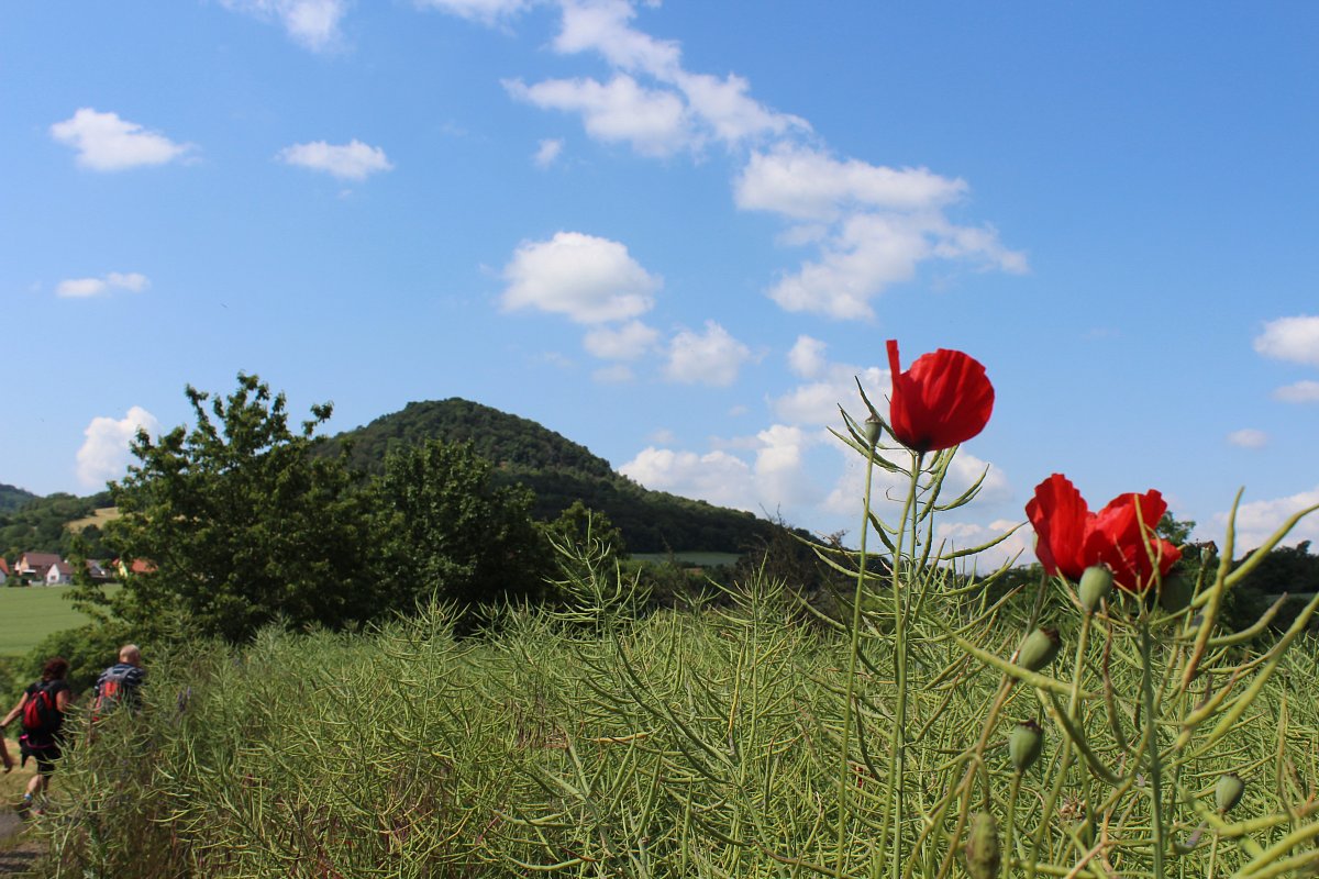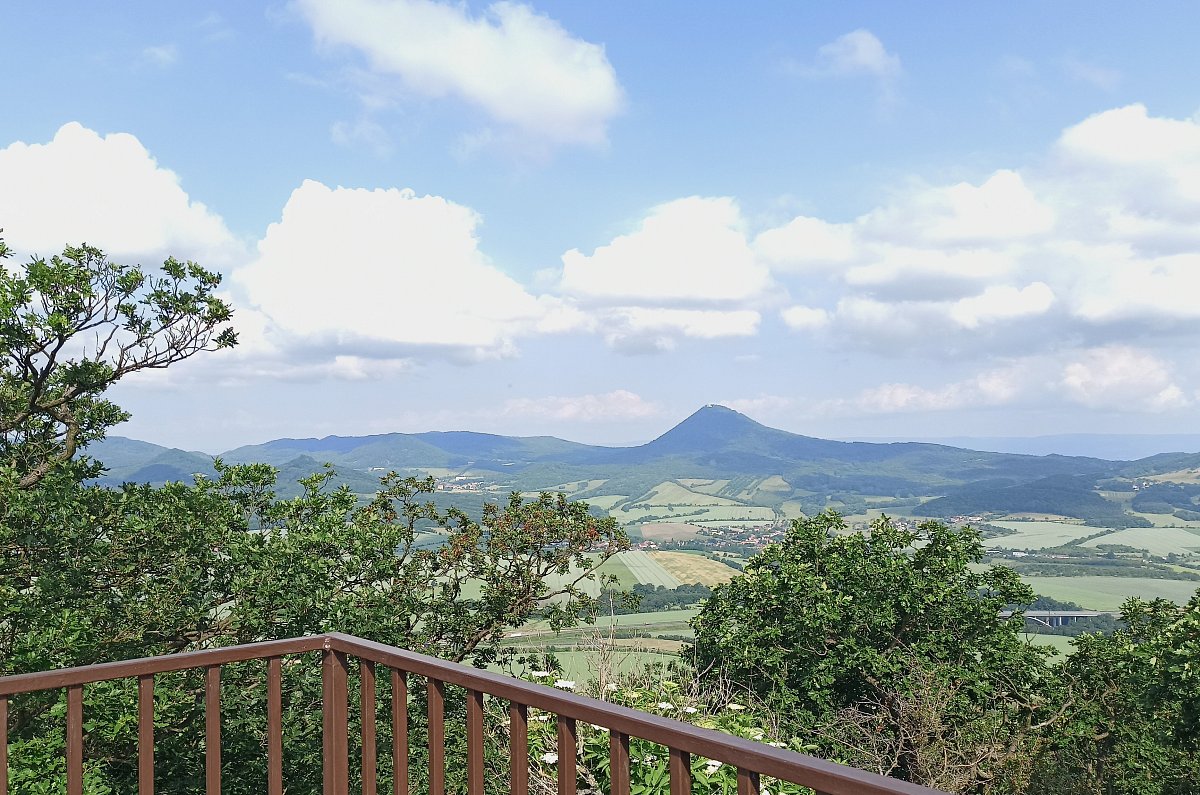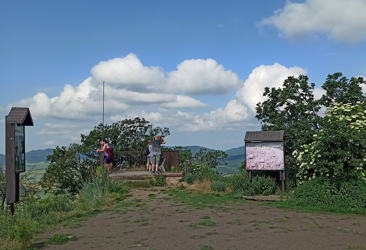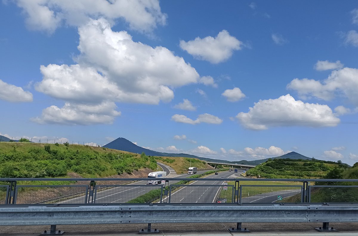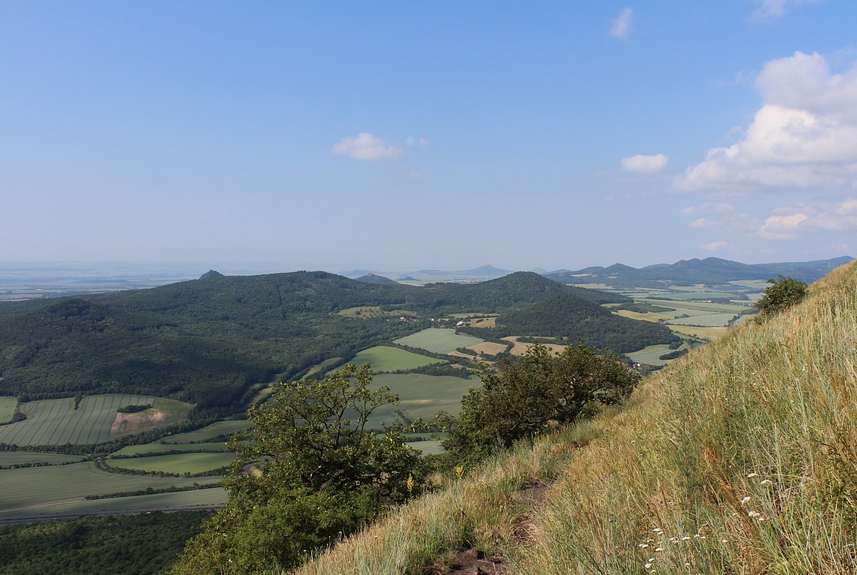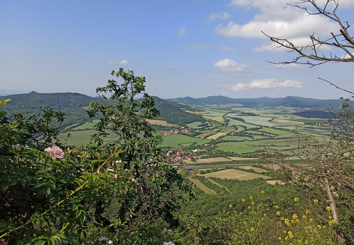 Dolů jsme nepospíchali, užívali jsme si krásné okolní krajiny. Ze začátku jsme se vraceli stejným kamenitým chodníčkem, potom jsme odbočili na zelenou značku směr Boreč. Přešli jsme nad dálnicí a pokračovali mezi poli, kde po krajích kvetly červené vlčí máky.