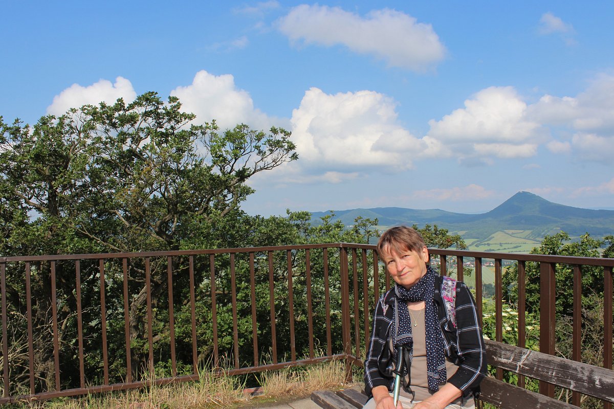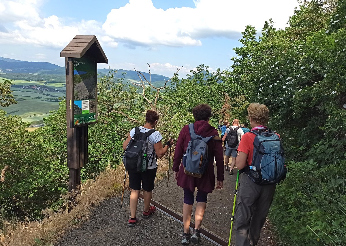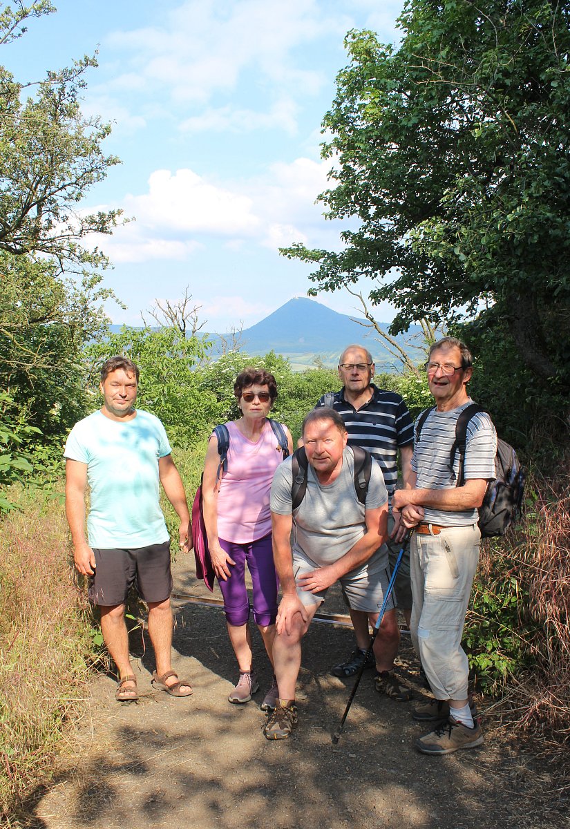 Ve středu 14. června dopoledne, při cestě do Litoměřic, jsme se vydali autobusem k jeho úpatí do obce Oparno, kde započal náš výstup. Hned na začátku jsme míjeli pasoucí se koníky, a někdo měl i nápad, že na jejich hřbetech bychom to zvládli rychleji. Naštěstí se neujal. Tak jsme cestu absolvovali poctivě po svých, a užívali si pohledů do okolí. Pod námi bylo tentokrát rušněji, protože pod Lovošem vede přes České Středohoří rušná dálnice.