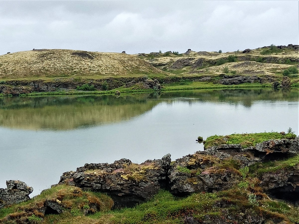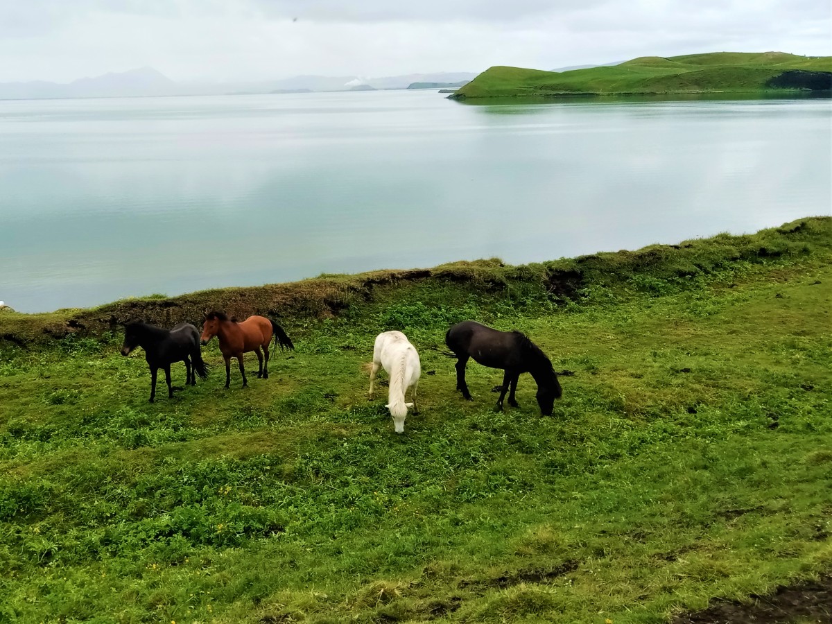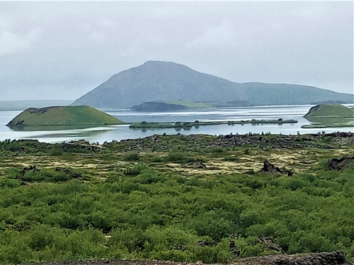 Na sever Islandu jsme jeli hlavně proto, abychom viděli bájné jezero Mývatn opěvované v islandských ságách. Nezklamalo nás. Bylo třeba se vyhýbat „atrakcím“, kde si autobusy plné turistů nezadaly s turistickými místy v Evropě, ale poetických míst je na jezeře stále dost, přičemž autobusy cestovek je plnou rychlostí míjejí. Jezero jsme objeli dvakrát. První zastávka byla v malém muzeu ptactva. Na Islandu každý rok hnízdí 74 druhů ptáků. Zajímavě jsme se pobavili s místní pracovnicí. Litovala, že se už na Island nedovážejí české holínky, které v mládí ráda nosila. Zato má stále českou loveckou pušku vyrobenou ve Zbrojovce Brno, kterou jí před padesáti lety věnoval její otec. Už jako čtrnáctiletá totiž v zimě lovila bělokury, místní pochoutku. Na jezeře jsme si zamilovali malé zátoky, odkud lze pozorovat ostrůvky rozeseté po vodní ploše, na které je spousta vodního ptactva. Na jednom místě farmář hnal domů od jezera stádo koní. Vynikali mezi nimi čistokrevní islandští bělouši. Kolem koní poletoval obrovský počet pakomárů, kteří sice lidi neštípou, ale jsou velmi dotěrní. Na několika místech jsme vystoupali na malé pahorky, odkud byl nádherný výhled na jezero. Oběd jsme si dali v baru, který zvenku nevypadal příliš vábně, ale uvnitř byl útulný. Navíc měli vynikající polévky a mohli jsme si neomezeně přidat. K tomu křupavý islandský chléb. Obsluhoval nás Španěl z Toleda. Nedaleko od jezera Mývatn se nachází geotermální elektrárna. Futuristický pohled na oblaka bílé páry stoupající z nitra Země.