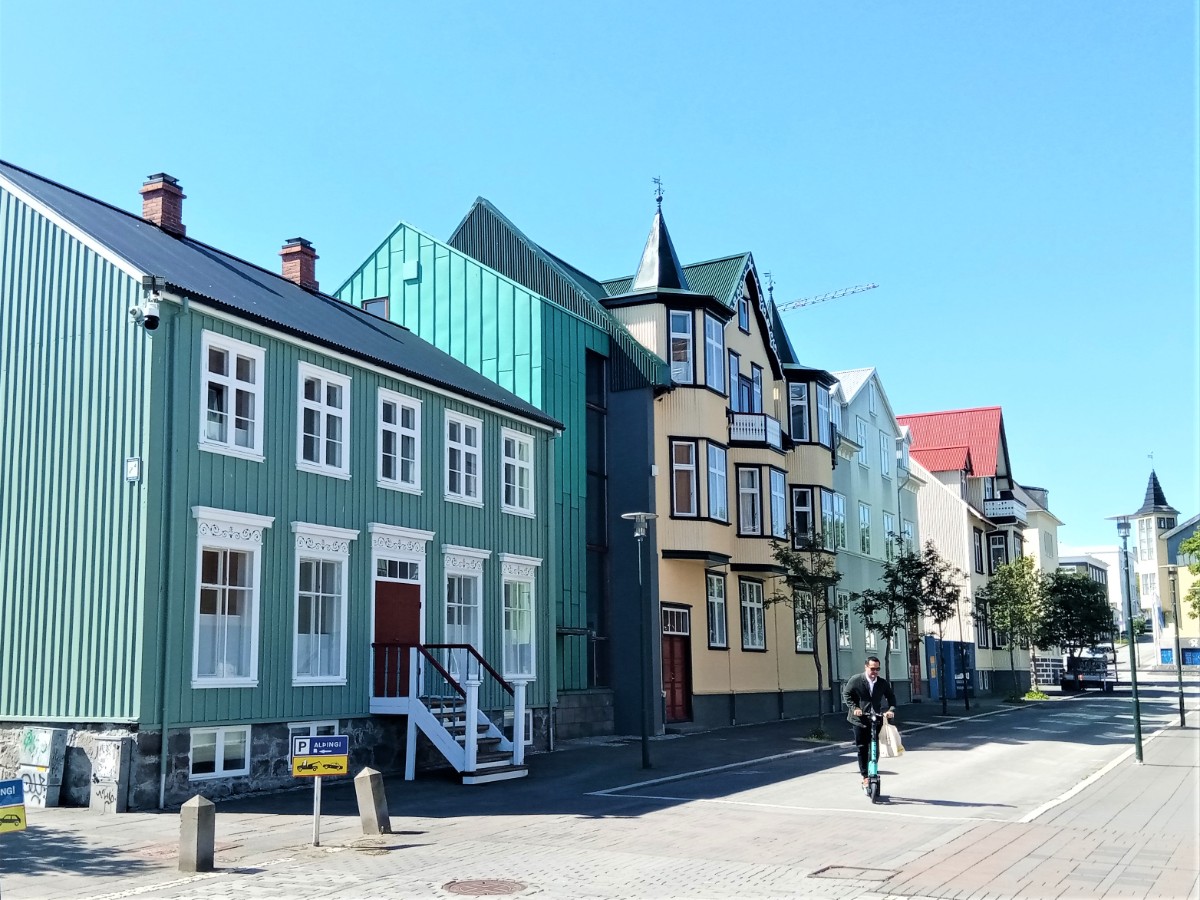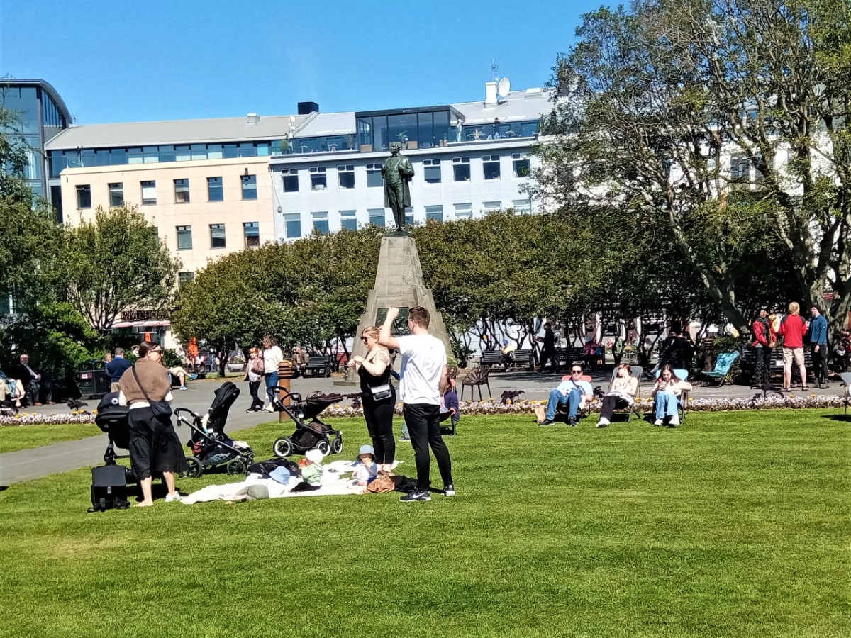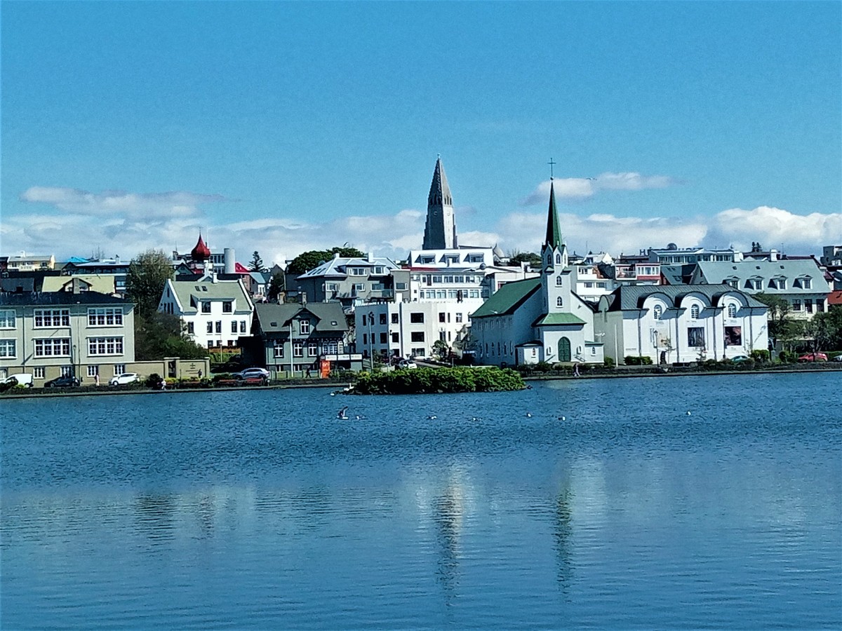 Stačilo však popojít 500 metrů směrem od centra a naskytly se nám stejné scény jako při našem prvním pobytu na Islandu. Slunce je vysoko na obloze a příjemně hřeje, ačkoliv fouká mrazivý vítr. V létě je na Islandu maximální teplota kolem dvaceti stupňů, v zimě klesá na pět až deset stupňů pod nulou. Blonďaté ratolesti si hrají na dětských hřištích. Vidíme typické islandské domy se zahradami. Máme výhled na druhou stranu jezera na luteránský kostel Hallgrímskirkja, který se nachází na vrcholu kopce Skólavörðuhæð. Se svou výškou 74,5 metru je největším kostelem na Islandu a z jeho věže je nádherný panoramatický výhled na město.