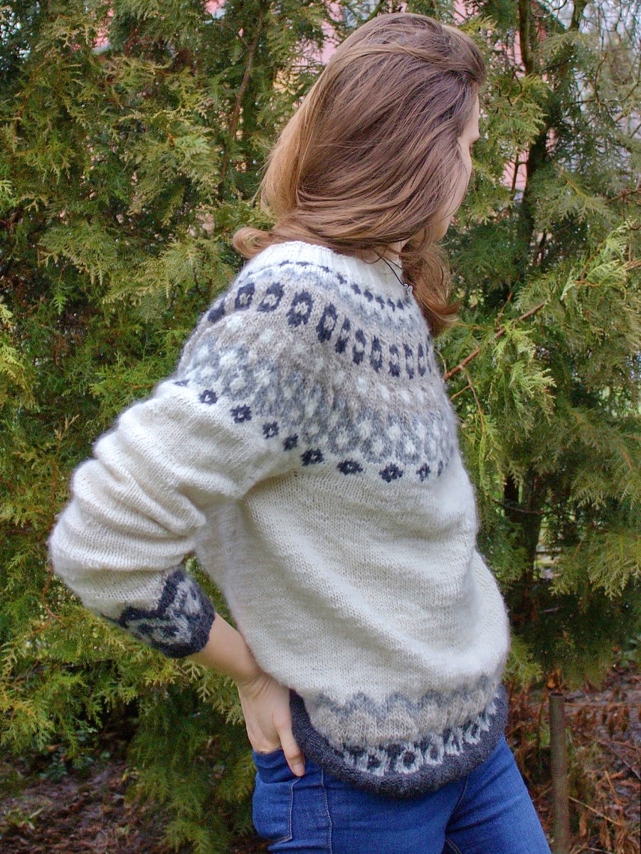 Před mnoha lety jsem dostala darem dvě soupravy na upletení takových svetrů, tedy klubíčka, podrobný návod a katalog. Jeden svetr jsem tehdy upletla po islandsku, druhý po česku a po různých peripetiích způsobených páráním a přeplétáním mi dodnes (no dobře, je to přes 40 let) část tehdejší příze zůstala a její kvalita je téměř stejná.