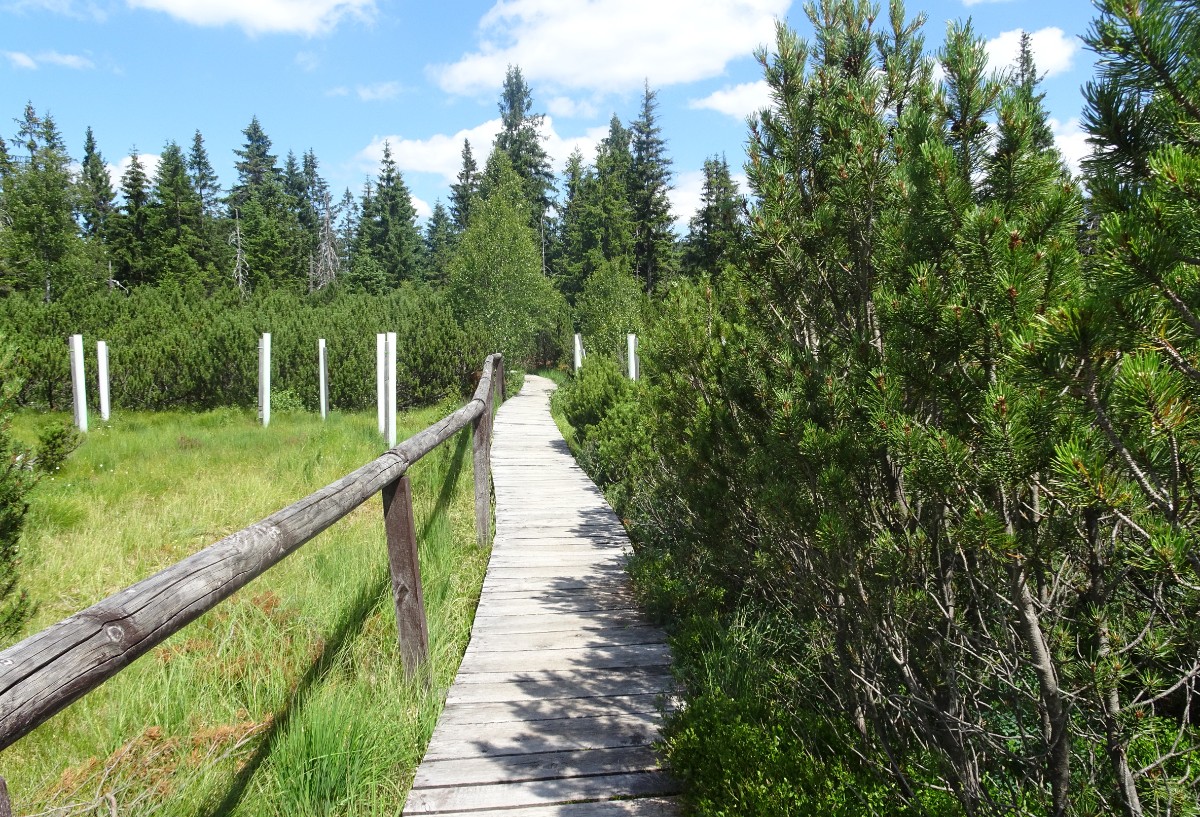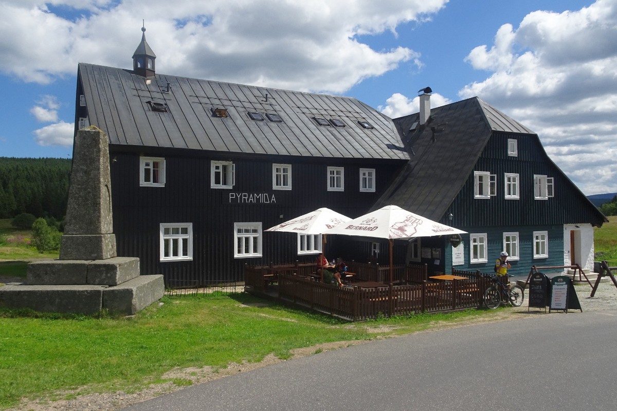 Náramně se nám vyvedl i tradiční výlet na Jizerku s obědem v Pyramidě. Sluníčko se na nás smálo a zatímco doma panovaly tropické teploty, tady ve výšce přes 800 m bylo příjemně a v pohodě se pochodovalo mezi krásnými chaloupkami i cestičkou jizerskohorským rašeliništěm podle Smaragdového potoka. Z louky ukryté zrakům chodců po asfaltové cestě se na mě dívaly oči chlupatých a přežvykujících rohatých stvoření. Na tabulce jsem se dočetla, že skotský náhorní skot zde pastvou pomáhá s obnovou květnatých luk. K tomu mu upřímně přeji hodně úspěchů.