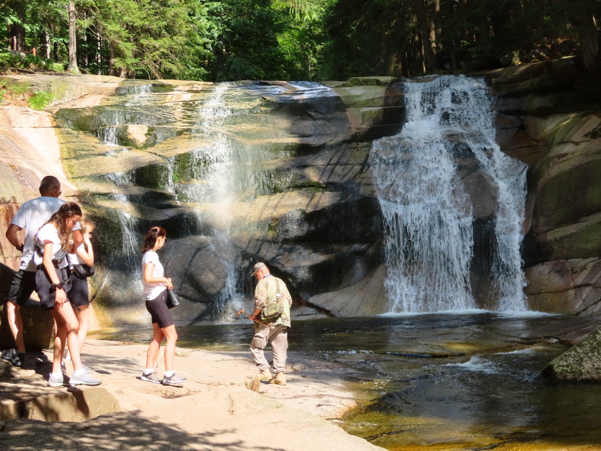 Jako první přišel na řadu Mumlavský vodopád s nezbytnou zastávkou u bělostné Tesařovské kaple v Kořenově. Tuto dominantu nevynechám ani kdyby pršelo, což se nám už také stalo. Letos však nebe zdobily bílé obláčky a srdce se tetelilo. A víte, jak dělá řeka Mumlava? Vesele si mumlá mum mum mum a přitom si tu skáče přes balvany, tu se mezi nimi umně proplétá. Ten největší skok už má za pozornosti početného lidského publika za sebou a může být v klidu. Parkoviště u vodopádu bylo poloprázdné a stokoruny za parkovné mi líto nebylo. To Harrachov jsme jen projeli bez sebemenší touhy zastavit.