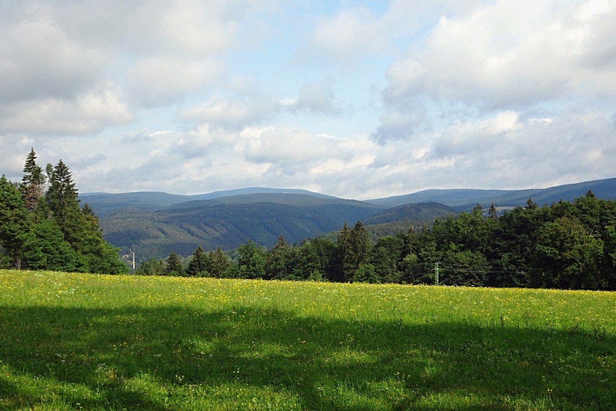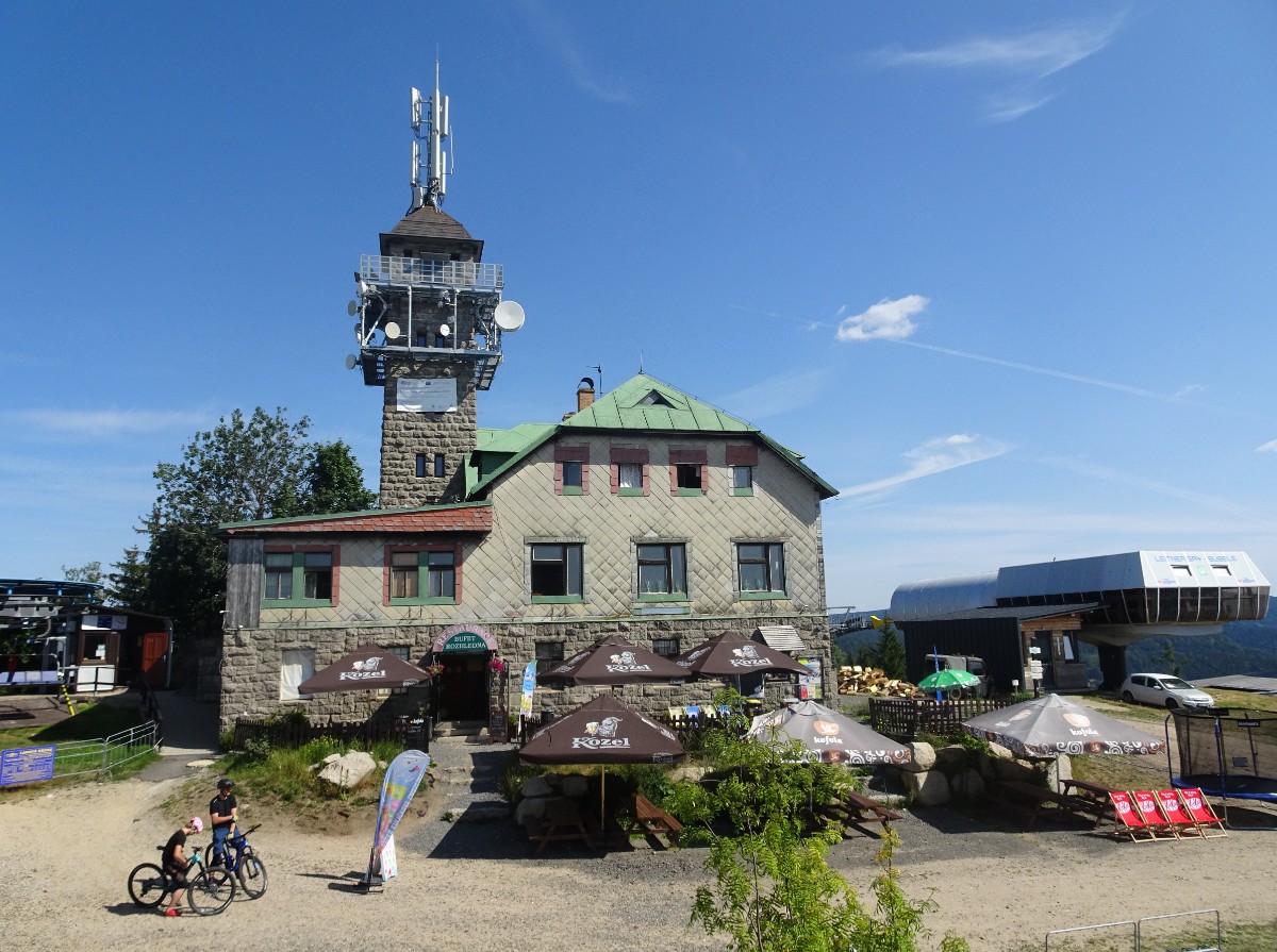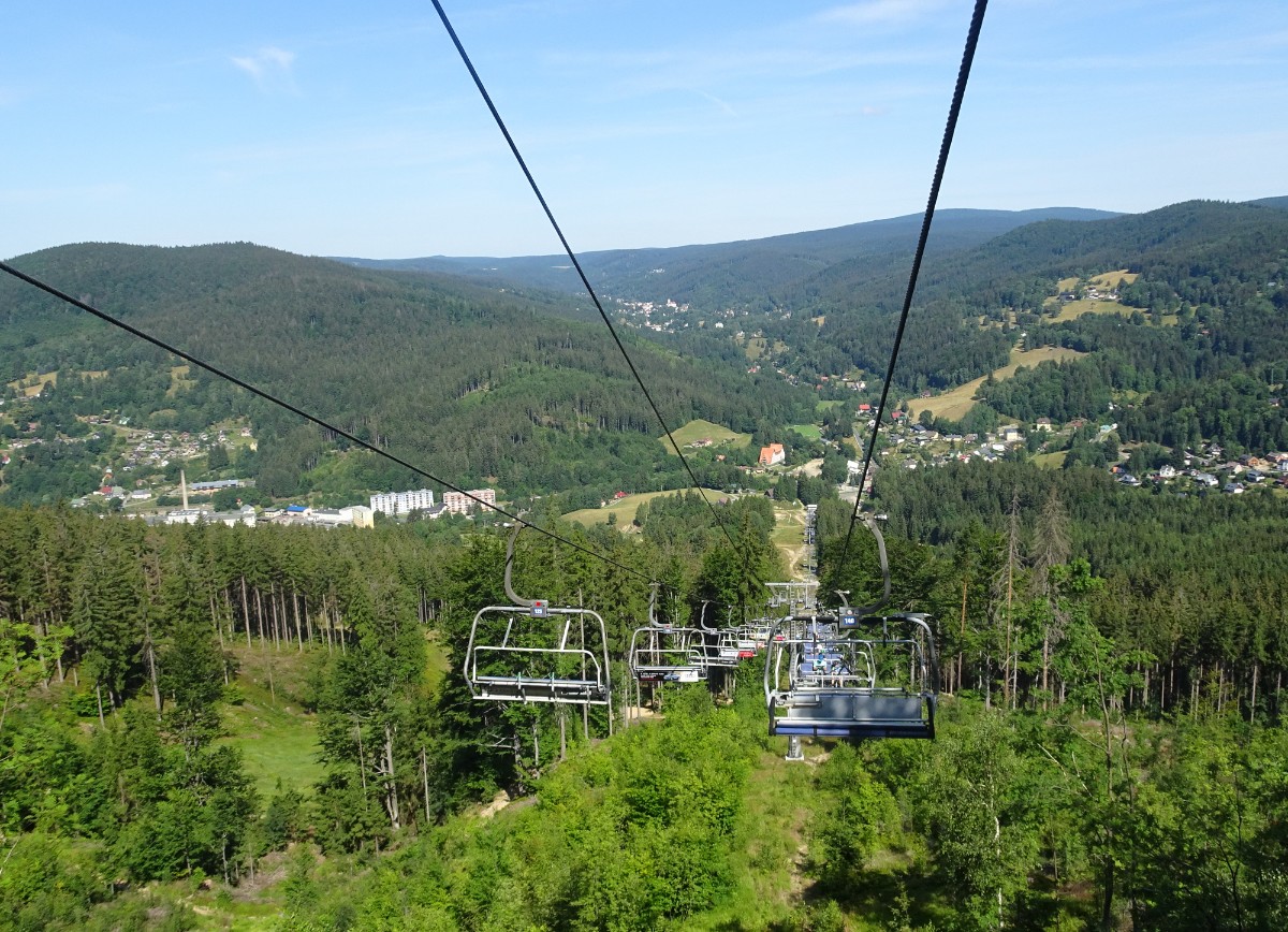 Užili jsme si výlet sedačkovou lanovkou na Tanvaldský špičák. Ta je sice asi nejvíc využitá v zimě, kdy se zde lyžuje, ale ani teď v létě nezahálí. Místo lyží si většina lidí nahoru veze kola a dolů se pak klikatě řítí dolů po cestě mezi stromy. Najde se i pár rodin s dětmi nebo seniorů jako jsme my, kteří si vyjedou nahoru "jen tak", posedí, dají si nějakou dobrotu, vyjdou na rozhlednu a kochají pohledem do kraje. Z rozhledny je nádherný výhled a viděla jsem několik jizerskohorských rozhleden - Štěpánku, Černou studnici, Bramberk, Nisanku, Královku a nejbližší Světlý vrch.