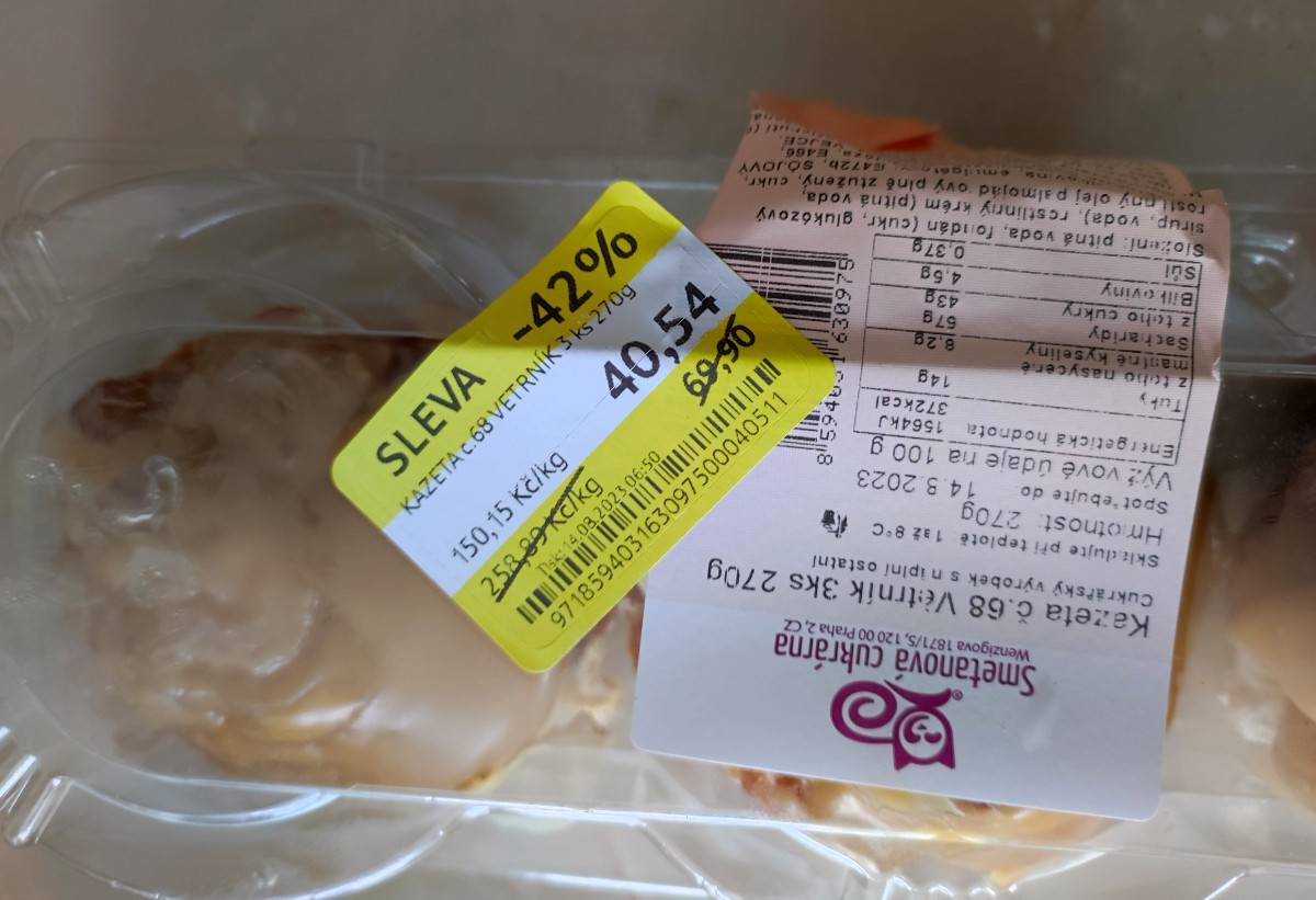Cestou tam mi slunce svítilo do zad, to se dalo vydržet. Teď mi svítí do očí a já mžourám a ploužím se strništěm zpátky k domovu. Těsně u prodejny Tesco mě popadla mlsná. Hned za vchodem mají lišácky vitrínu s kazetami zákusků. Ha, větrníky ve slevě. Tři kousky za 40,54 Kč, sleva 42 %, ty tady přece nemůžu nechat. U pokladny vytahuji telefon a otvírám pouzdro, ve kterém nosím i kartu. Přikládám k terminálu a objevuje se hláška - zamítnuto. Asi budu muset zadat PIN. Vkládám kartu do terminálu, zadávám PIN a znovu - zamítnuto. To jsem blázen, jak je to možné? Prodavačka mi radí, abych to potřetí radši nezkoušela. Budu to tady muset nechat, lekla jsem se, nemám totiž peníze. Máte tady stovku, opáčí pokladní, která skrz okénko v pouzdru viděla mou pohotovostní bankovku. Zaplatila jsem hotově a propocená stanula u našich dveří.