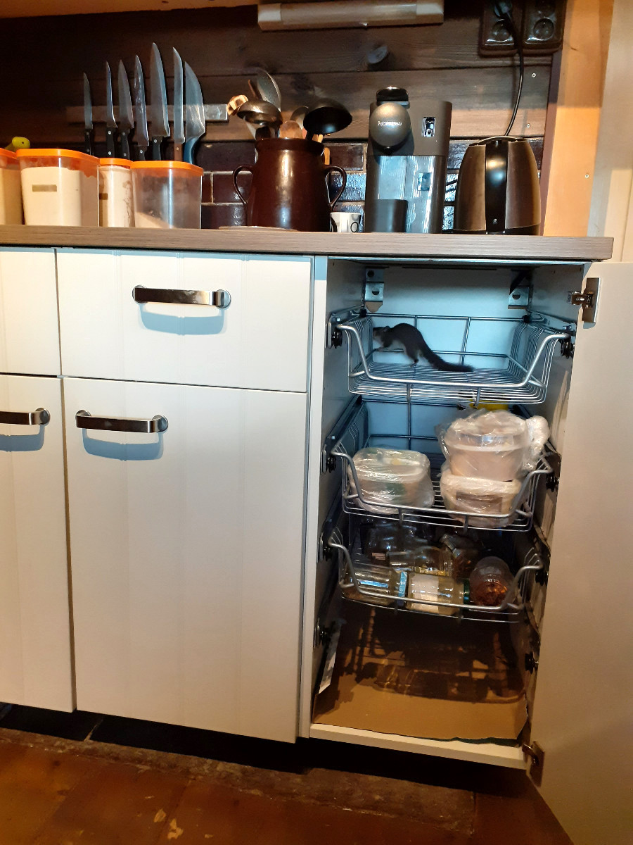 Je to až příliš poetické, tak něco zemitějšího. Otevírám zrána dvířka v lince, za kterými se ukrývá malý "špajz" - mouky, nudle, luštěniny, koření. A... hledí na mě pár korálkových očí, které patří šedému kožíšku s bílou náprsenkou a dlouhému chundelatému ocásku. Údiv rovný šoku je patrný na obou stranách. Zvířátko se vzpamatuje jako první a fofrem se protáhne otvůrkem tak malým, že dále zkoprněle "čučíte", co se to děje.
