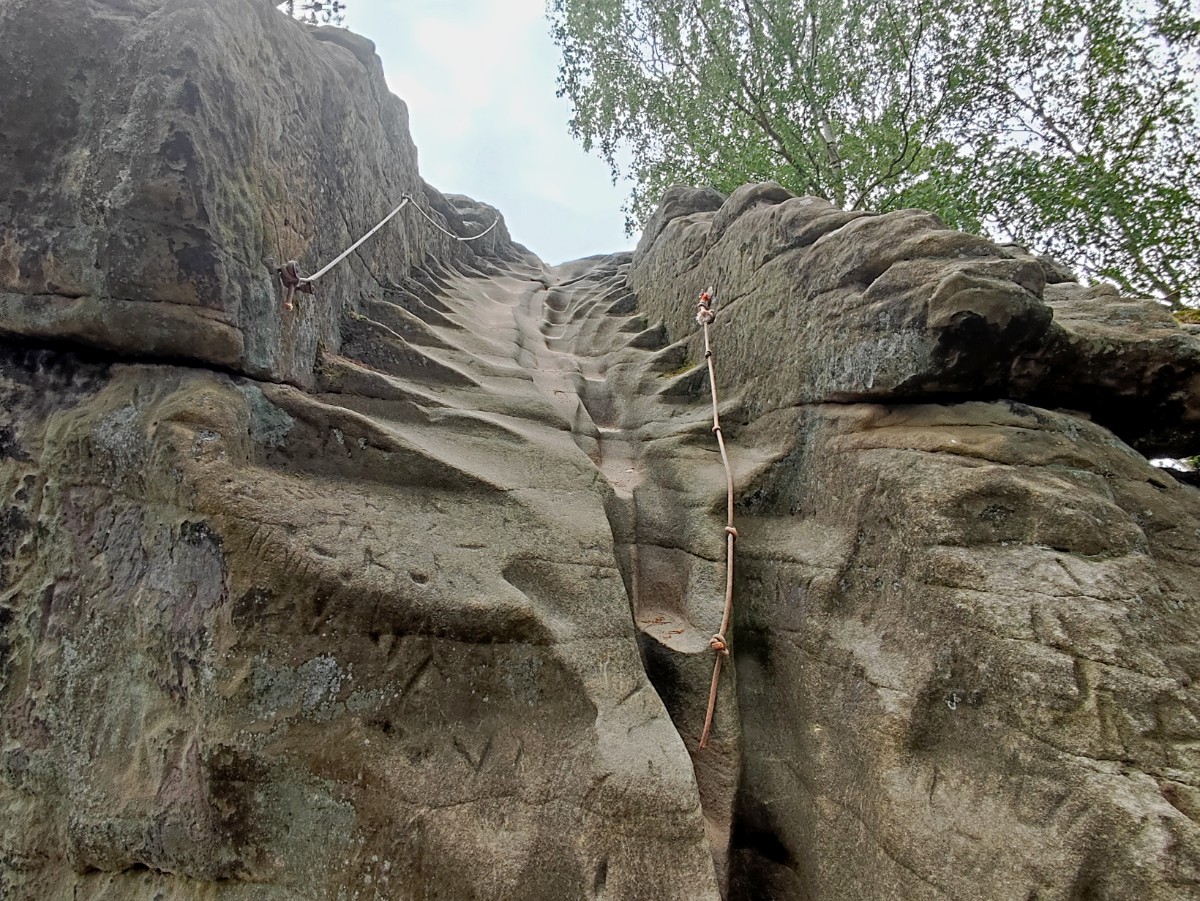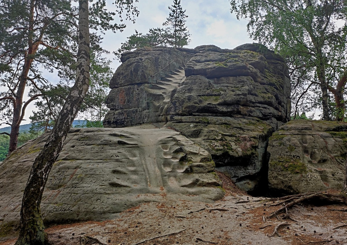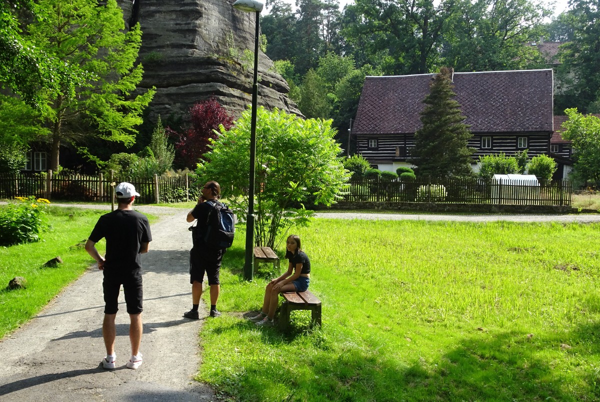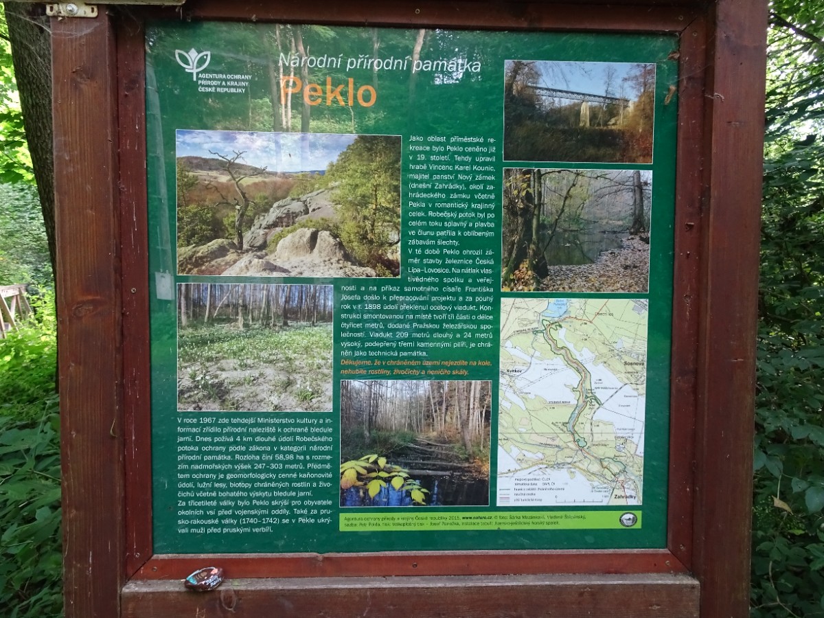 Šťastní, že Smrtka nás nedostala, vydáme se do Pekla. Popojedeme 7 km dál do Zahrádek. Auto zaparkujeme u zámku a dětem dáme batůžky s pitím a svačinkou. Tady se vyplatí, protože cesta Peklem bude delší. Dobrá by byla i malá baterka. Peklo vyhloubil Robečský potok. Ten se klikatí stinným údolím, kde i v největších vedrech je příjemný chládek. Ve skalách jsou vytesané jeskyňky, které si děti mohou prozkoumat. Ze Zahrádek nejprve narazíme na hřiště, kde se pohoupáme a pak už se vydáme do Pekla. To začíná za romantickou osadou Karba, sestávající z několika roubených stavení pod skalami. Cesta Peklem vede z větší části i po dřevěných chodnících. Podle našich sil se můžeme rozhodnout pro kratší či delší variantu. U té kratší odbočíme u můstku přes potok z červené značky a vydáme se ke Kozí farmě. Pobavíme se se stádem mlsných koz a můžeme podle ohrady a kolejí udělat kolečko po neznačené cestě a vrátit se ke Karbě a našemu autu u zámku. Zdatnější budou pokračovat po červené značce Peklem, projdou si opravdovou temnou chodbou vytesanou ve skále (baterka se hodí) a dojdou až ke Skautské skále. Její historii neznám, ale vysoko na skalní stěně uvidíte znak skautské lilie. Najdete tu i další jeskyňku. Poměrně snadno vyjdete nahoru na skálu a naskytne se vám krásný výhled na rybník a Mnišskou horu. S překvapením jsem mezi stromy hleděla na hradbu paneláků a uvědomila jsem si, jak blízko je Česká Lípa. Ostatně tady Peklo končí i začíná, protože můžete vyrazit i z opačného konce.