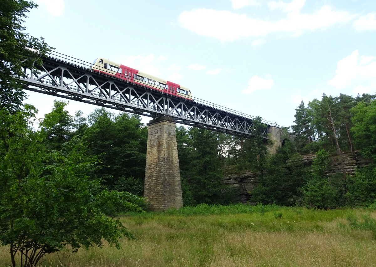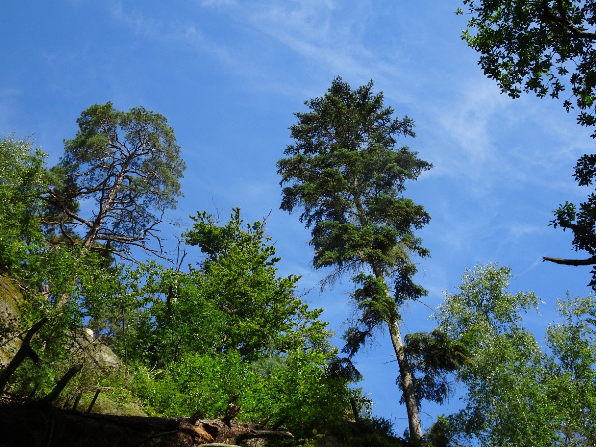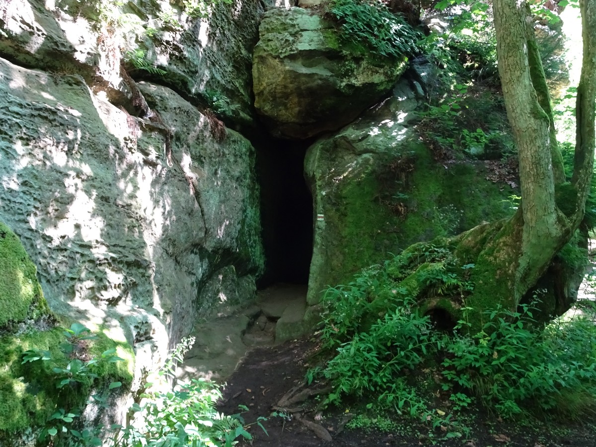 Šťastní, že Smrtka nás nedostala, vydáme se do Pekla. Popojedeme 7 km dál do Zahrádek. Auto zaparkujeme u zámku a dětem dáme batůžky s pitím a svačinkou. Tady se vyplatí, protože cesta Peklem bude delší. Dobrá by byla i malá baterka. Peklo vyhloubil Robečský potok. Ten se klikatí stinným údolím, kde i v největších vedrech je příjemný chládek. Ve skalách jsou vytesané jeskyňky, které si děti mohou prozkoumat. Ze Zahrádek nejprve narazíme na hřiště, kde se pohoupáme a pak už se vydáme do Pekla. To začíná za romantickou osadou Karba, sestávající z několika roubených stavení pod skalami. Cesta Peklem vede z větší části i po dřevěných chodnících. Podle našich sil se můžeme rozhodnout pro kratší či delší variantu. U té kratší odbočíme u můstku přes potok z červené značky a vydáme se ke Kozí farmě. Pobavíme se se stádem mlsných koz a můžeme podle ohrady a kolejí udělat kolečko po neznačené cestě a vrátit se ke Karbě a našemu autu u zámku. Zdatnější budou pokračovat po červené značce Peklem, projdou si opravdovou temnou chodbou vytesanou ve skále (baterka se hodí) a dojdou až ke Skautské skále. Její historii neznám, ale vysoko na skalní stěně uvidíte znak skautské lilie. Najdete tu i další jeskyňku. Poměrně snadno vyjdete nahoru na skálu a naskytne se vám krásný výhled na rybník a Mnišskou horu. S překvapením jsem mezi stromy hleděla na hradbu paneláků a uvědomila jsem si, jak blízko je Česká Lípa. Ostatně tady Peklo končí i začíná, protože můžete vyrazit i z opačného konce.