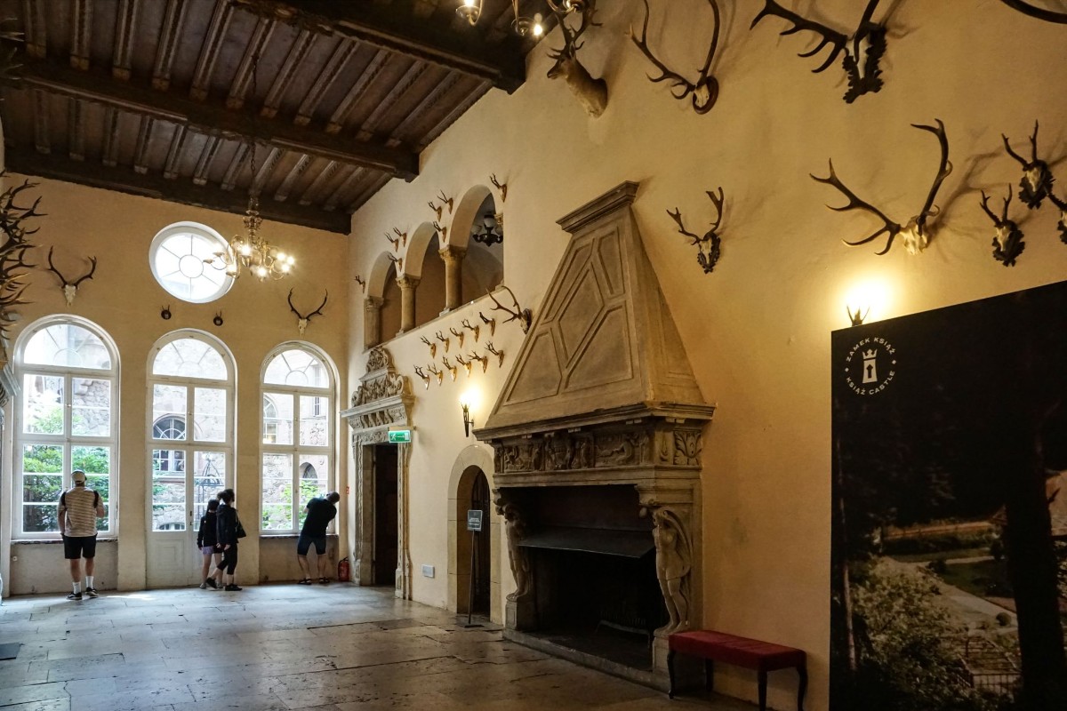 Za slavnostním vchodem dostal každý z nás audioprůvodce se sluchátky. Chvíli nám trvalo, než jsme pochopili polský pokyn, abychom si zavěsili batůžky na břicho. Příjemný hlas českého průvodce nás provázel labyrintem chodeb a místností. Vyprávěl o historii zámku, zajímavostech jednotlivých místností a podrobně se věnoval příběhu posledních majitelů z rodu Hochbergů.