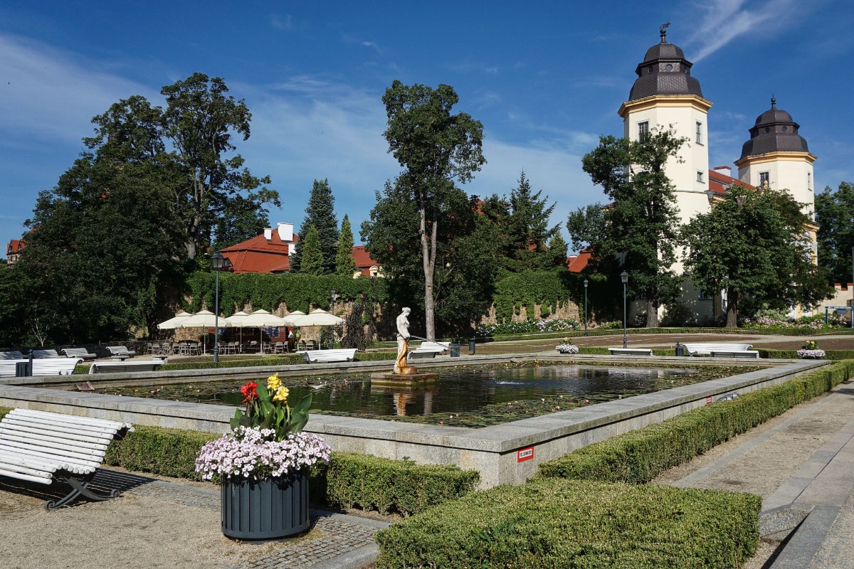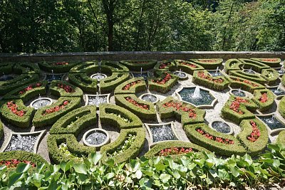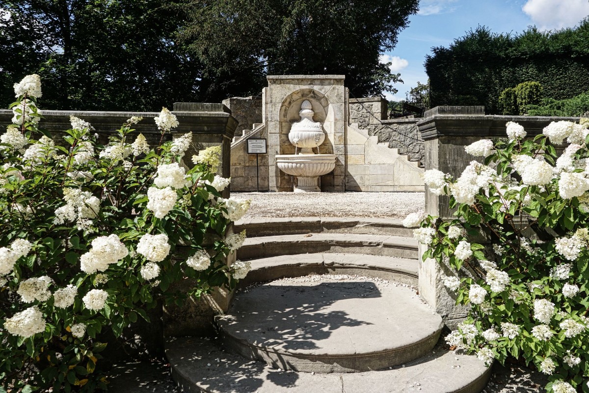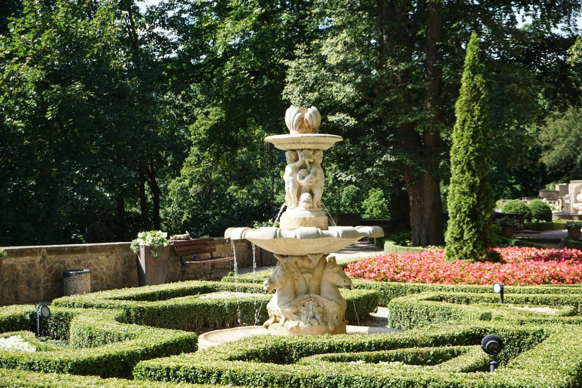 Na parkánech kolem zámku vytvořili mistři zahradníci nádherné terasovité zahrady ve francouzském stylu s mnoha půvabnými fontánami a kašnami.