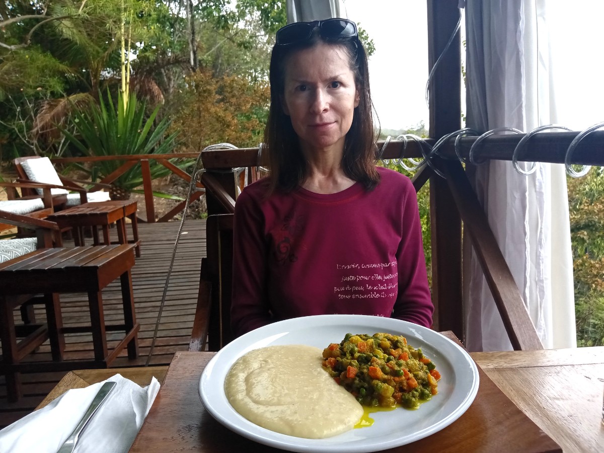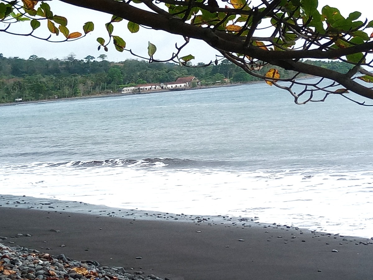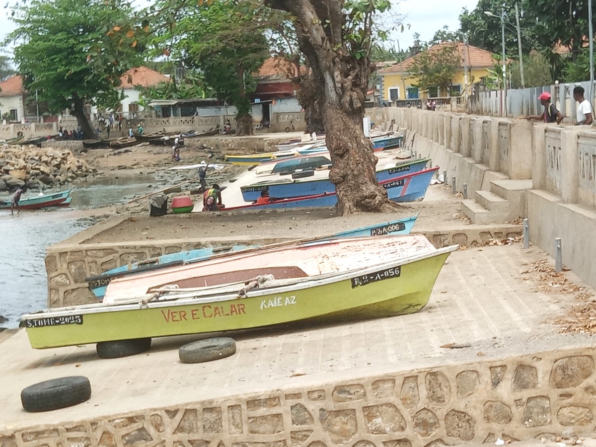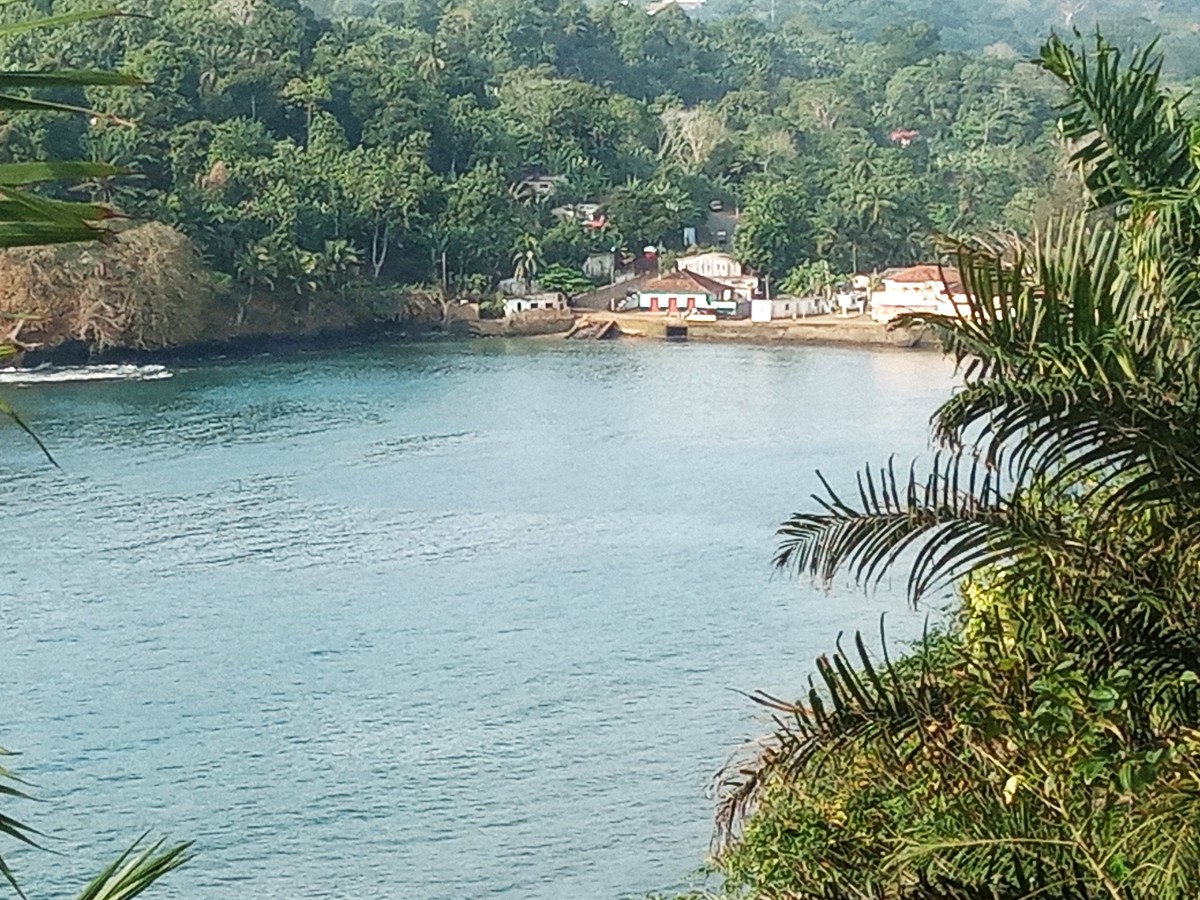 Asi deset kilometrů za Neves se nachází restaurace Mucumbli s nádherným výhledem na moře. Jídlo je opět velmi chutné. Dala jsem si pyré z chlebovníku se zeleninou ve sladké kokosové omáčce. Manžel tuňáka s cibulí naloženou v portském víně. Na stůl si nám občas sedne malý ptáček s krásnou modrou náprsenkou. Vůbec se nebojí. Ještě před obědem jsme si odskočili dále na jih, kde nám byla doporučena návštěva kakaovníkové plantáže Diogo Vaz. Jednalo se o vetchá, smutně vypadající stavení, takže jsme se raději vrátili. Cestou k restauraci jsme se krátce zastavili na nádherné pláži s kokosovými palmami a černým sopečným pískem. Nedaleko odtud byl výhled údolím řeky do bujné vnitrozemské vegetace. Na druhé straně silnice praly vesnické ženy u řeky prádlo. Namydlily ho a posléze ho na plochých kamenech usilovně drhly. Vyprané prádlo sušily těsně u řeky na zemi. Vůbec jim nevadilo, že drobně mrholilo. Prádlo nikdy nevěší, protože je zde vysoká vlhkost vzduchu a nikdy by neuschlo. Země je naopak vyhřátá sluncem a prádlo rychle uschne. Navázali jsme kontakt s jednou z nich. Vysvětlila nám, že tento způsob praní je ekologický, voda je průzračně čistá a nic ji to nestojí. Poté si dala koš s vypraným prádlem na hlavu a vykročila do své vesnice, kde ji čekaly dvě dcery. Jedna letos začala chodit do školy a druhé je teprve rok. Mladá paní byla velmi sympatická a hovořila bezchybnou portugalštinou. To se ovšem nedá říci o mém manželovi. Pro ledničku zarputile používal slovo “frigideira”, které však ve skutečnosti znamená “pánev na smažení”. Vedlo to k mnoha nedorozuměním a humorným situacím.