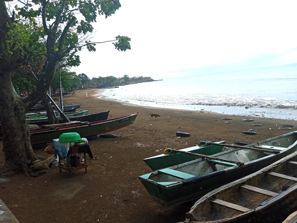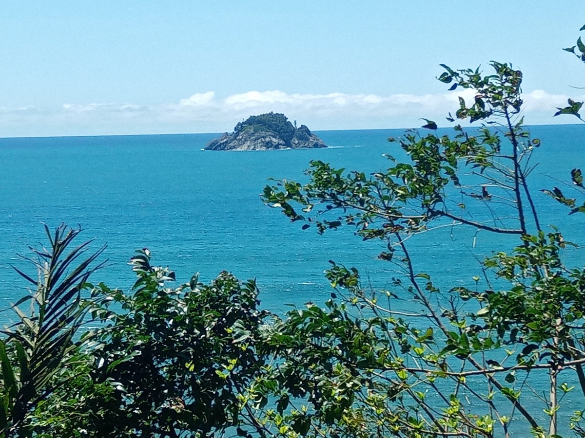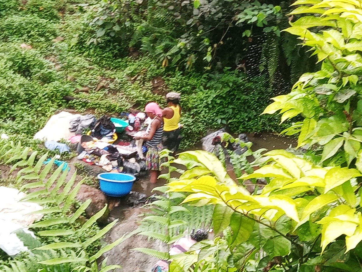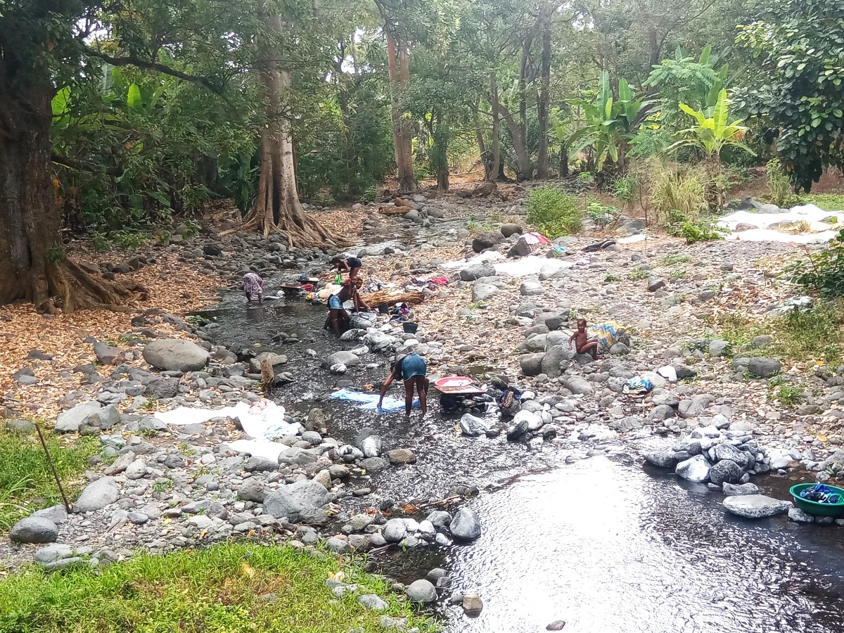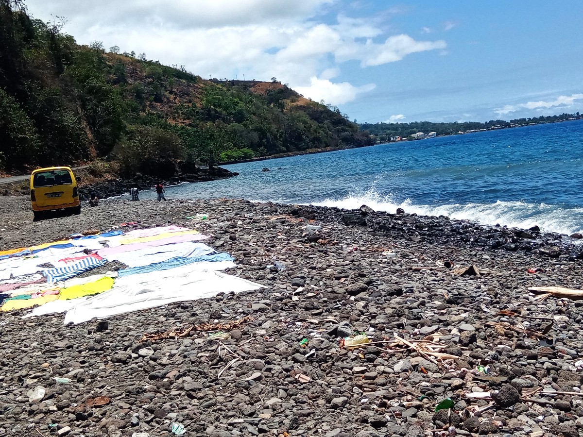 Asi deset kilometrů za Neves se nachází restaurace Mucumbli s nádherným výhledem na moře. Jídlo je opět velmi chutné. Dala jsem si pyré z chlebovníku se zeleninou ve sladké kokosové omáčce. Manžel tuňáka s cibulí naloženou v portském víně. Na stůl si nám občas sedne malý ptáček s krásnou modrou náprsenkou. Vůbec se nebojí. Ještě před obědem jsme si odskočili dále na jih, kde nám byla doporučena návštěva kakaovníkové plantáže Diogo Vaz. Jednalo se o vetchá, smutně vypadající stavení, takže jsme se raději vrátili. Cestou k restauraci jsme se krátce zastavili na nádherné pláži s kokosovými palmami a černým sopečným pískem. Nedaleko odtud byl výhled údolím řeky do bujné vnitrozemské vegetace. Na druhé straně silnice praly vesnické ženy u řeky prádlo. Namydlily ho a posléze ho na plochých kamenech usilovně drhly. Vyprané prádlo sušily těsně u řeky na zemi. Vůbec jim nevadilo, že drobně mrholilo. Prádlo nikdy nevěší, protože je zde vysoká vlhkost vzduchu a nikdy by neuschlo. Země je naopak vyhřátá sluncem a prádlo rychle uschne. Navázali jsme kontakt s jednou z nich. Vysvětlila nám, že tento způsob praní je ekologický, voda je průzračně čistá a nic ji to nestojí. Poté si dala koš s vypraným prádlem na hlavu a vykročila do své vesnice, kde ji čekaly dvě dcery. Jedna letos začala chodit do školy a druhé je teprve rok. Mladá paní byla velmi sympatická a hovořila bezchybnou portugalštinou. To se ovšem nedá říci o mém manželovi. Pro ledničku zarputile používal slovo “frigideira”, které však ve skutečnosti znamená “pánev na smažení”. Vedlo to k mnoha nedorozuměním a humorným situacím.