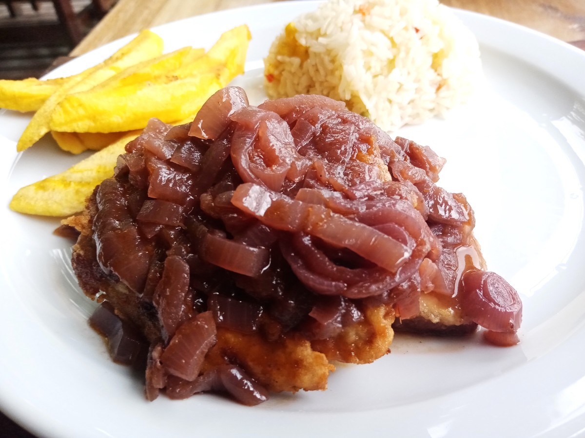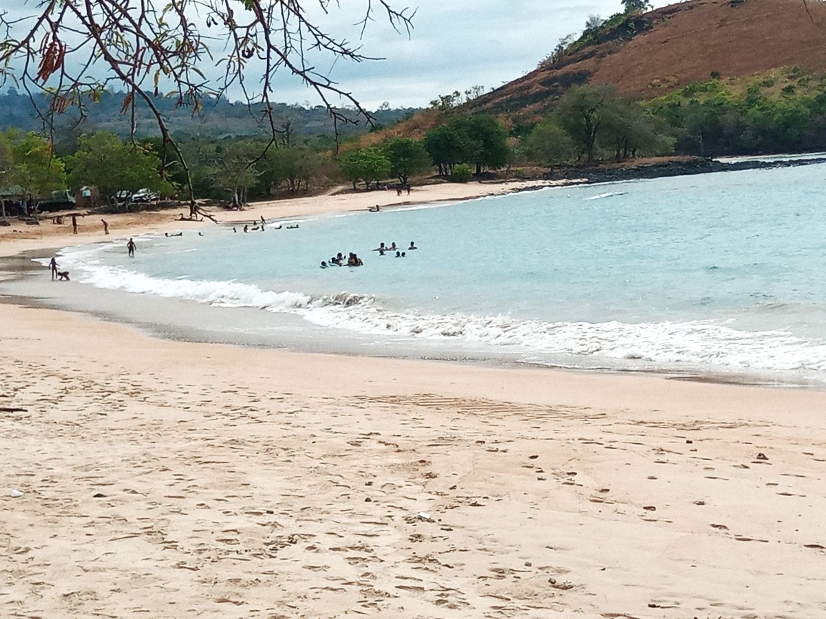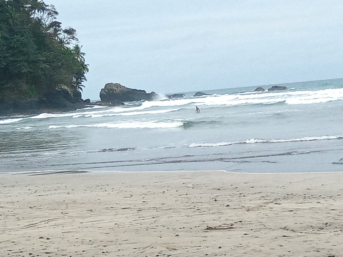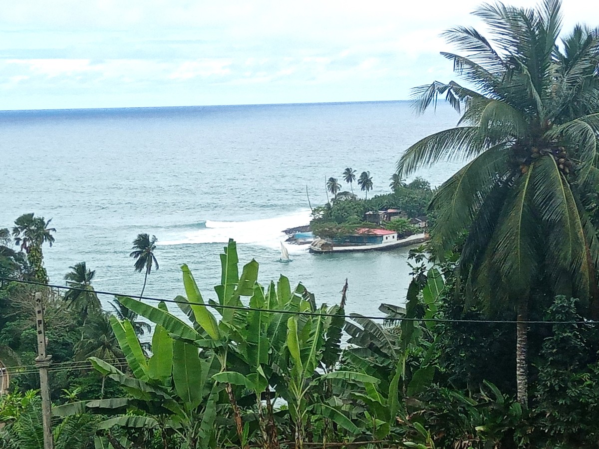 Asi deset kilometrů za Neves se nachází restaurace Mucumbli s nádherným výhledem na moře. Jídlo je opět velmi chutné. Dala jsem si pyré z chlebovníku se zeleninou ve sladké kokosové omáčce. Manžel tuňáka s cibulí naloženou v portském víně. Na stůl si nám občas sedne malý ptáček s krásnou modrou náprsenkou. Vůbec se nebojí. Ještě před obědem jsme si odskočili dále na jih, kde nám byla doporučena návštěva kakaovníkové plantáže Diogo Vaz. Jednalo se o vetchá, smutně vypadající stavení, takže jsme se raději vrátili. Cestou k restauraci jsme se krátce zastavili na nádherné pláži s kokosovými palmami a černým sopečným pískem. Nedaleko odtud byl výhled údolím řeky do bujné vnitrozemské vegetace. Na druhé straně silnice praly vesnické ženy u řeky prádlo. Namydlily ho a posléze ho na plochých kamenech usilovně drhly. Vyprané prádlo sušily těsně u řeky na zemi. Vůbec jim nevadilo, že drobně mrholilo. Prádlo nikdy nevěší, protože je zde vysoká vlhkost vzduchu a nikdy by neuschlo. Země je naopak vyhřátá sluncem a prádlo rychle uschne. Navázali jsme kontakt s jednou z nich. Vysvětlila nám, že tento způsob praní je ekologický, voda je průzračně čistá a nic ji to nestojí. Poté si dala koš s vypraným prádlem na hlavu a vykročila do své vesnice, kde ji čekaly dvě dcery. Jedna letos začala chodit do školy a druhé je teprve rok. Mladá paní byla velmi sympatická a hovořila bezchybnou portugalštinou. To se ovšem nedá říci o mém manželovi. Pro ledničku zarputile používal slovo “frigideira”, které však ve skutečnosti znamená “pánev na smažení”. Vedlo to k mnoha nedorozuměním a humorným situacím.