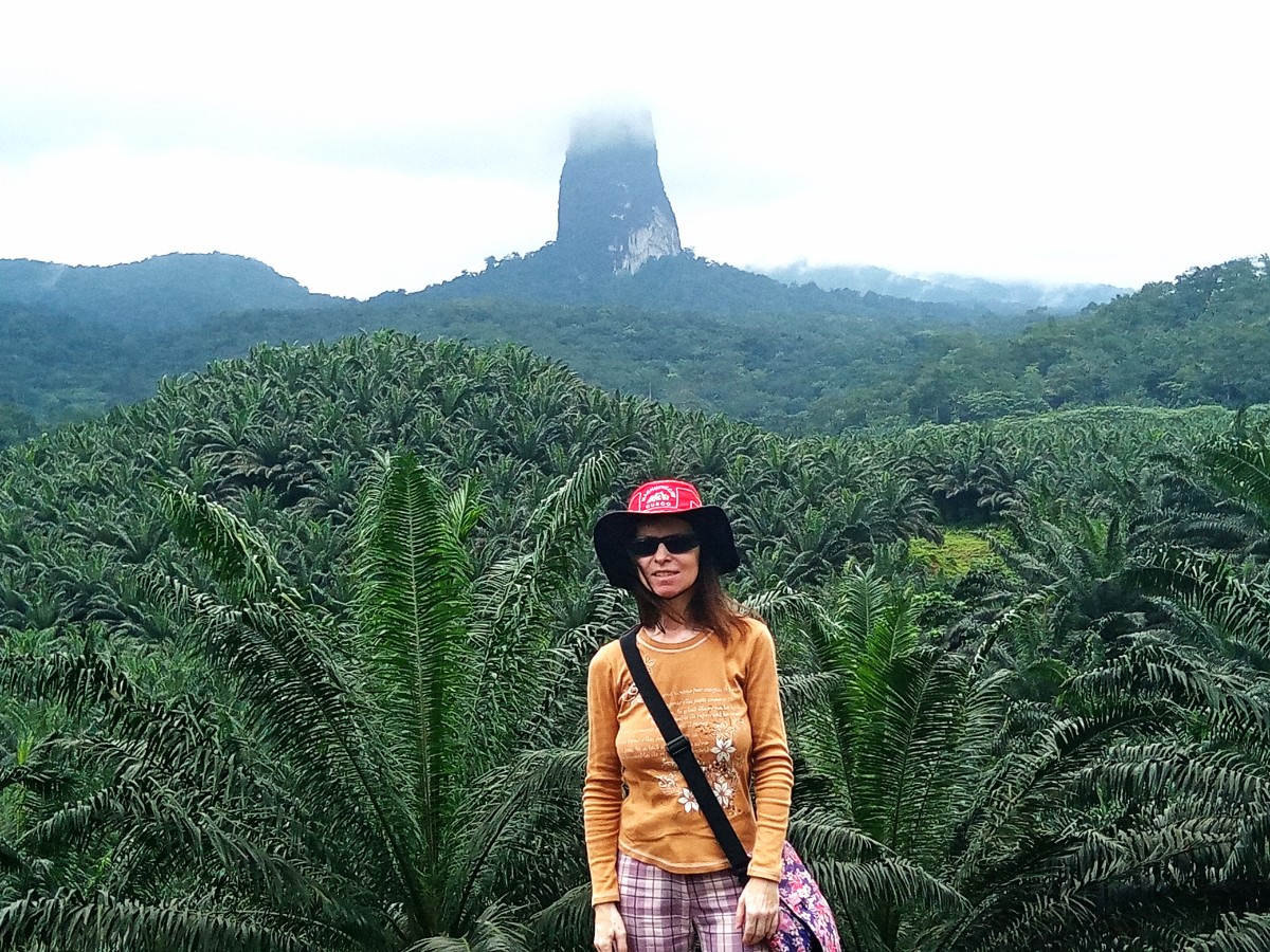 Cesta na jih východního pobřeží se vine podél moře tropickou džunglí. Často zde prší a voda dělá divy. Různé odstíny zeleně jsou přírodou uspořádány do několika vegetačních pater. Je zde tak vlhko, že většina vesničanů nosí gumové holiny. Je neděle, některé ženy jsou svátečně oblečeny a v ruce drží kabelku a bibli. Všude je živo, ulice jsou plné lidí, kteří posedávají, diskutují nebo prostě lelkují. Nicnedělání je ostatně na tomto ostrově převažující činnost. O domácí zvířata se nikdo nestará, početní vepři si potravu hledají sami, stejně jako slepice a krávy. Ty se pasou mezi olejovými palmami, které v jižní části ostrova nahradily původní vegetaci. Palmový olej je dnes nejdůležitější vývozní artikl. Předstihl kokosové ořechy i kakao. Káva se pěstuje hlavně pro domácí spotřebu. Občas se objeví pláž s černým nebo zlatavým pískem. Říčky a potoky slouží jako vesnické prádelny. Ženy perou jednou týdně. Břehy vodních toků září pestrými barvami. Nejsou to květy, ale vyprané prádlo. Rádi bychom navázali kontakt s místními obyvateli, ale každý pokus okamžitě končí slovy “dinheiro” – peníze. Jsme považováni za chodící peněženky. Tento jev se však týká pouze odlehlejších oblastí. V jedné vesnici takto žebrala i elegantně oblečená žena s nalakovanými nehty. Silnice na jih se postupně mění v rozbitou cestu. Dojeli jsme k vyhlídce na Pico Cão Grand. Tato hora má nadmořskou výšku 663 metrů a převyšuje okolní terén o více než tři sta metrů. Leží v národním parku Obô, který je na seznamu chráněné biosféry UNESCO a zaujímá třetinu ostrova. Obô znamená v místním dialektu “les”. Kromě ptáků tam žije pouze jeden druh opice. Není třeba se obávat šelem ani hadů, jediný jedovatý plaz nikdy člověka nenapadá. Malárie je rovněž na ústupu.