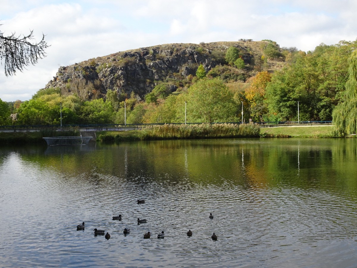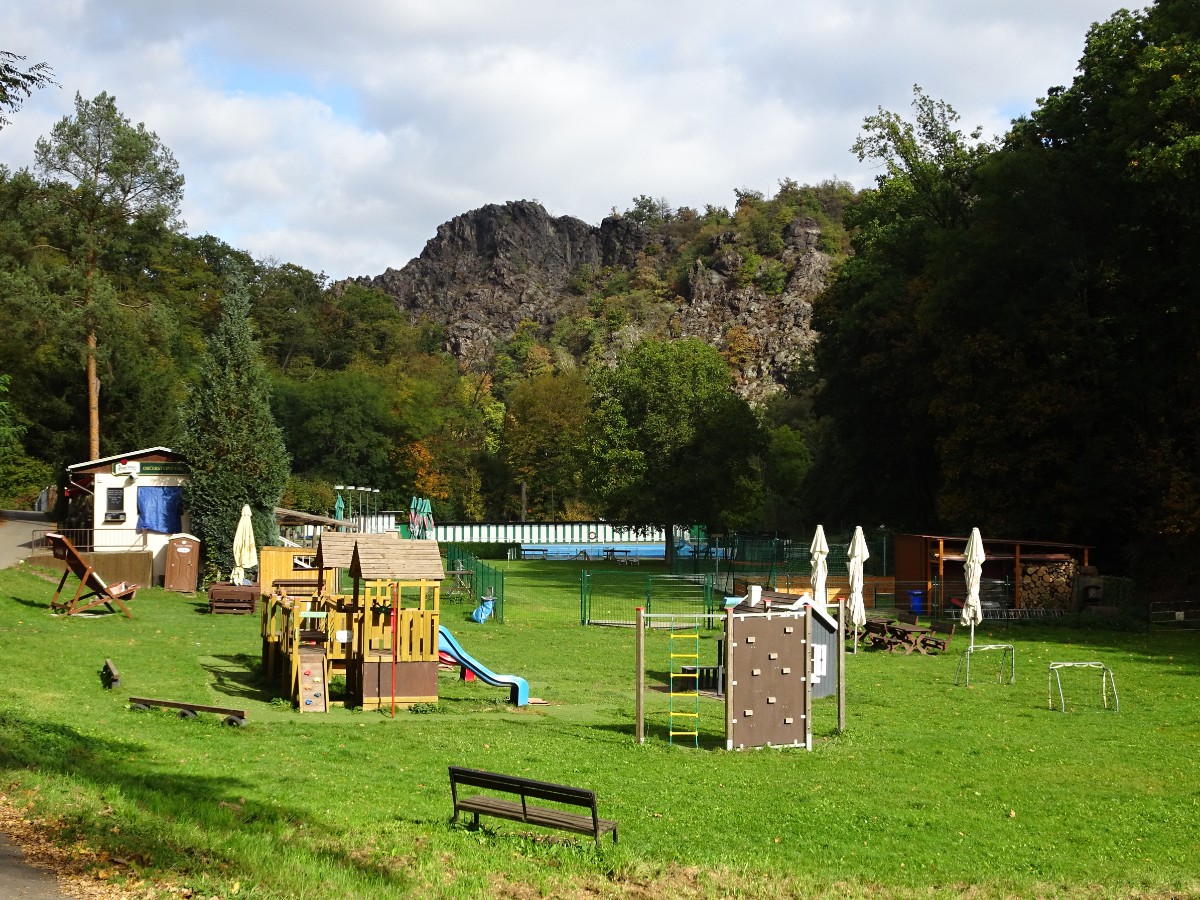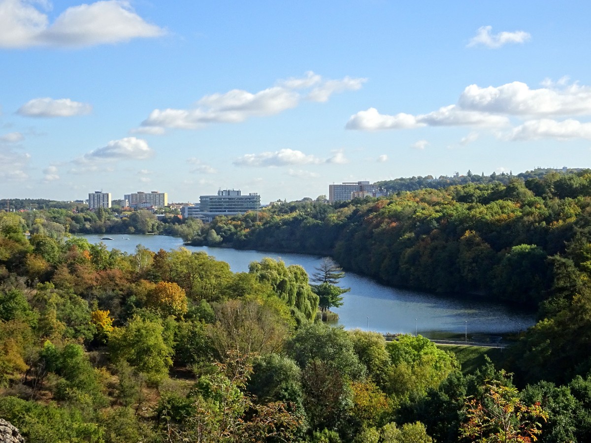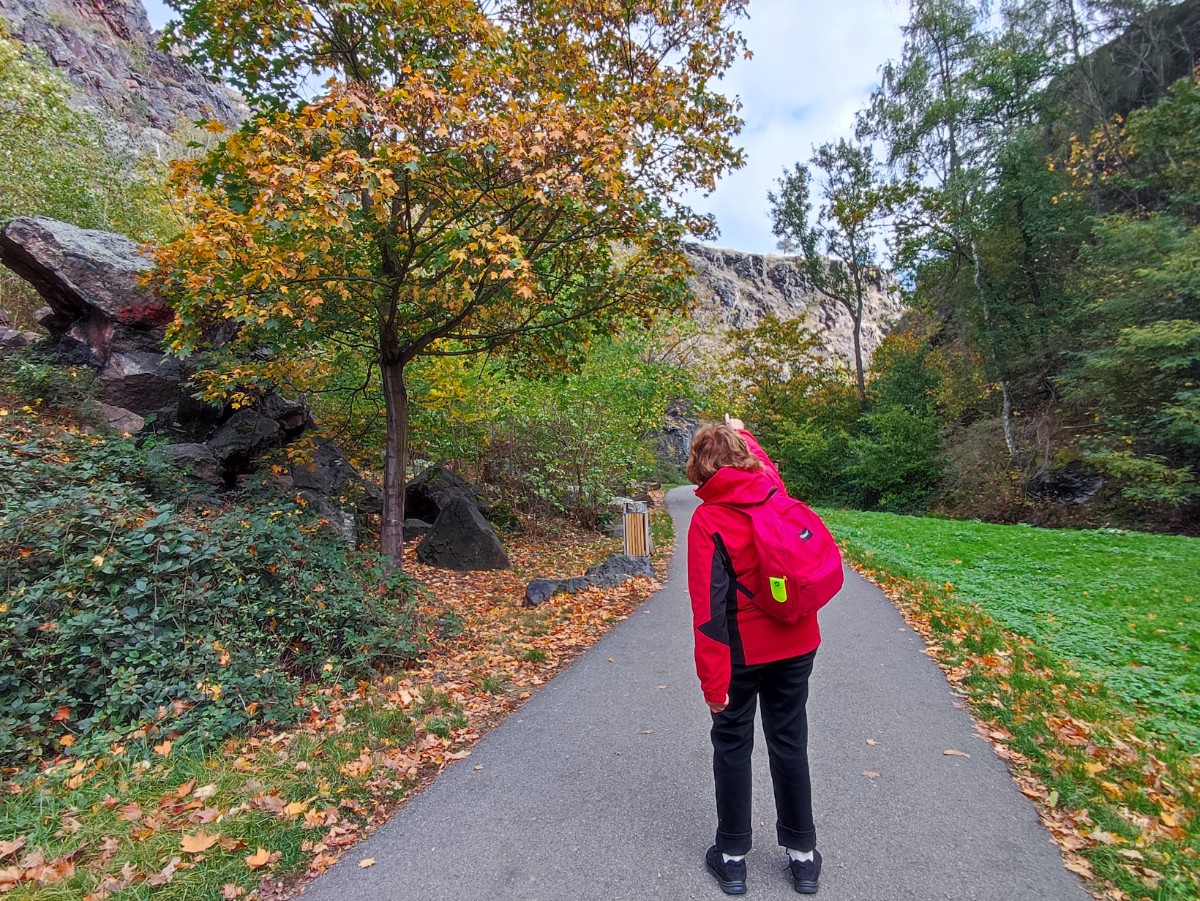 Za debaty na téma "ti Pražáci se ale mají" jsme pokračovaly dál po žluté značce a u křížku v Purkrabském háji přestoupily na červenou. Sešly jsme ke koupališti Divoká Šárka, umístěném v romantickém prostředí pod skálou Dívčí skok. Koupání tu podle mého názoru bude, jak se říká, osvěžující i v parném létě. Cesta podle Šáreckého potoka nás dovedla až do kaňonu mezi oběma skalami a teď teprve bylo vidět, jak vysoko jsme seděly a neodvažovaly se pohlédnout dolů. Kochaly jsme se nádhernou podzimem se barvící přírodou a docouraly se až na hráz vodní nádrže Džbán.