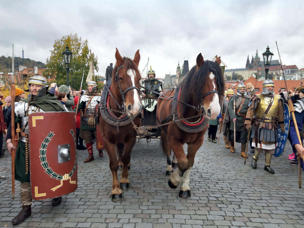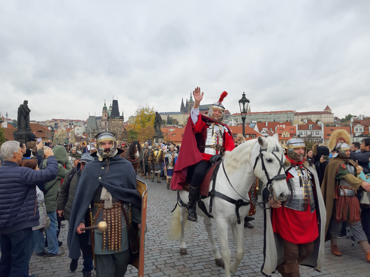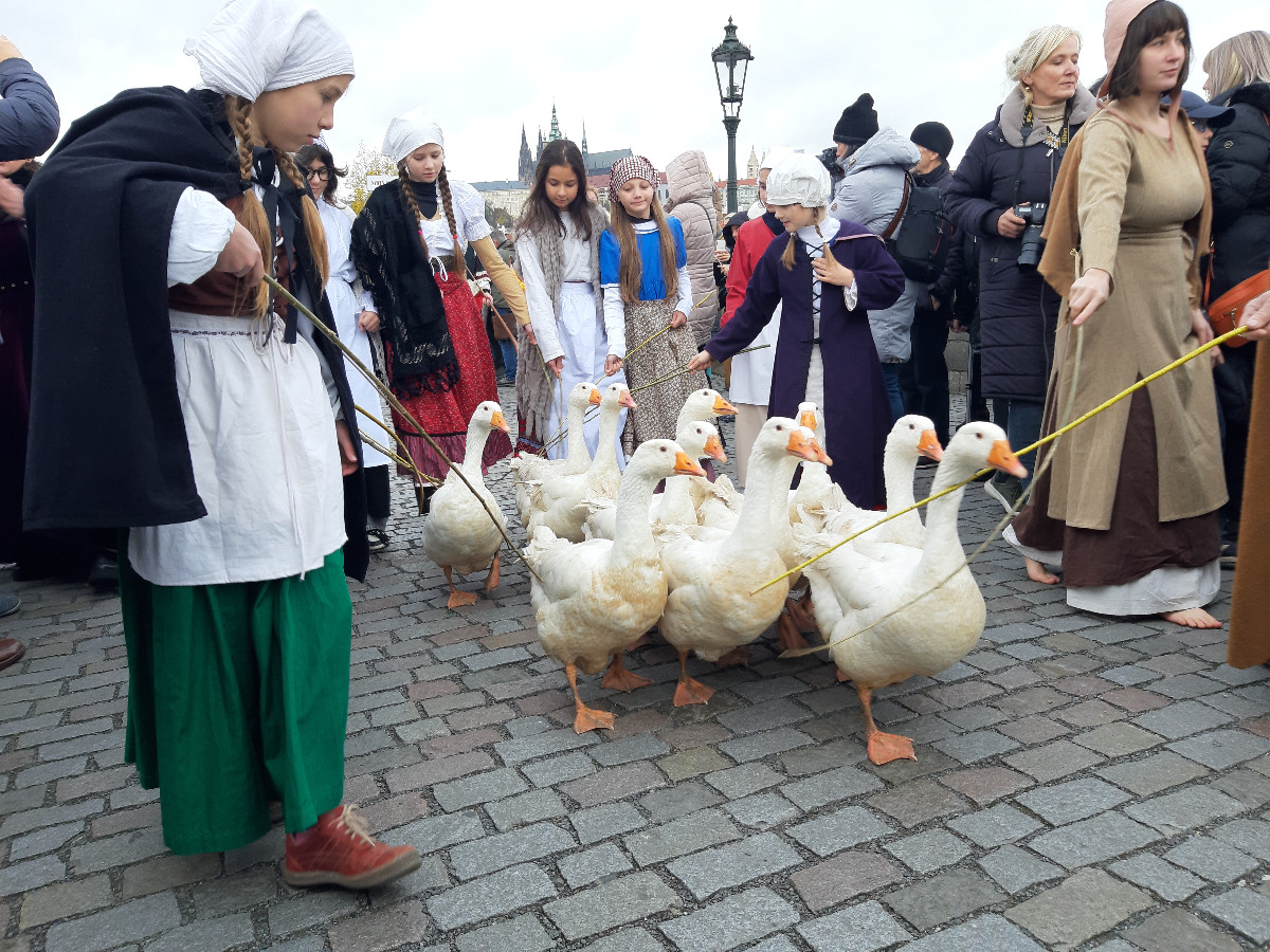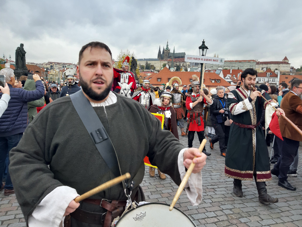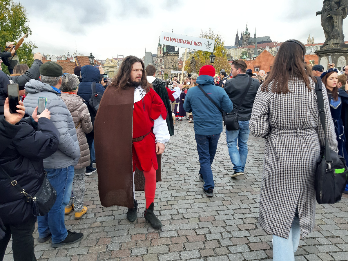 A jak probíhal svátek sv. Martina v Praze?  V sobotu 11. listopadu v 11 hodin a 11 minut vyšel od 11. pilíře Karlova mostu průvod svatého Martina z Tours. Průvod vedlo jedenáct hus, které hnalo 11 husopasek. Na bílém koni jel svatý Martin v oděvu římského vojáka. Svatého Martina následoval povoz skoroplný sněhu a setnina římských vojáků.