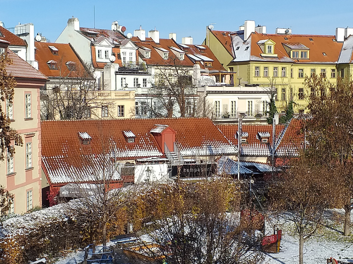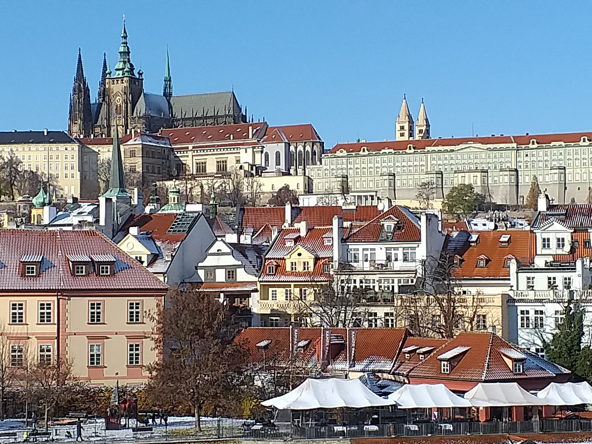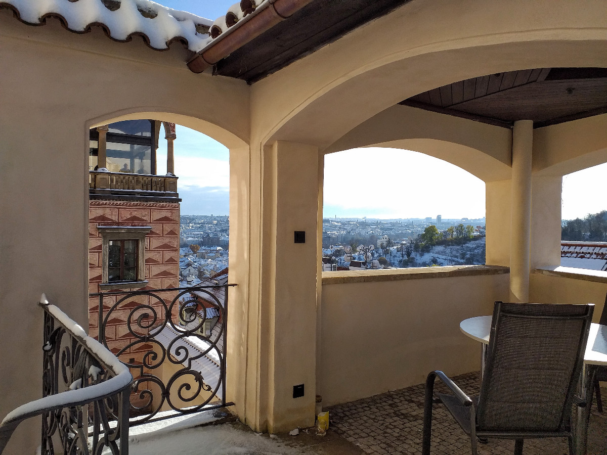 Malostranské střechy, Strahovský klášter, Loreta, Karlův most, Hradčany, Vltava... A také Fortna, nacházející se vedle Schwarzenberského paláce.