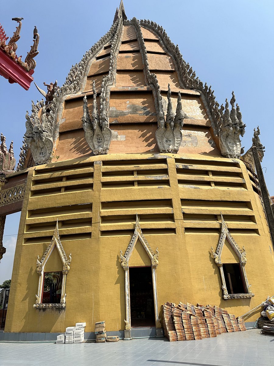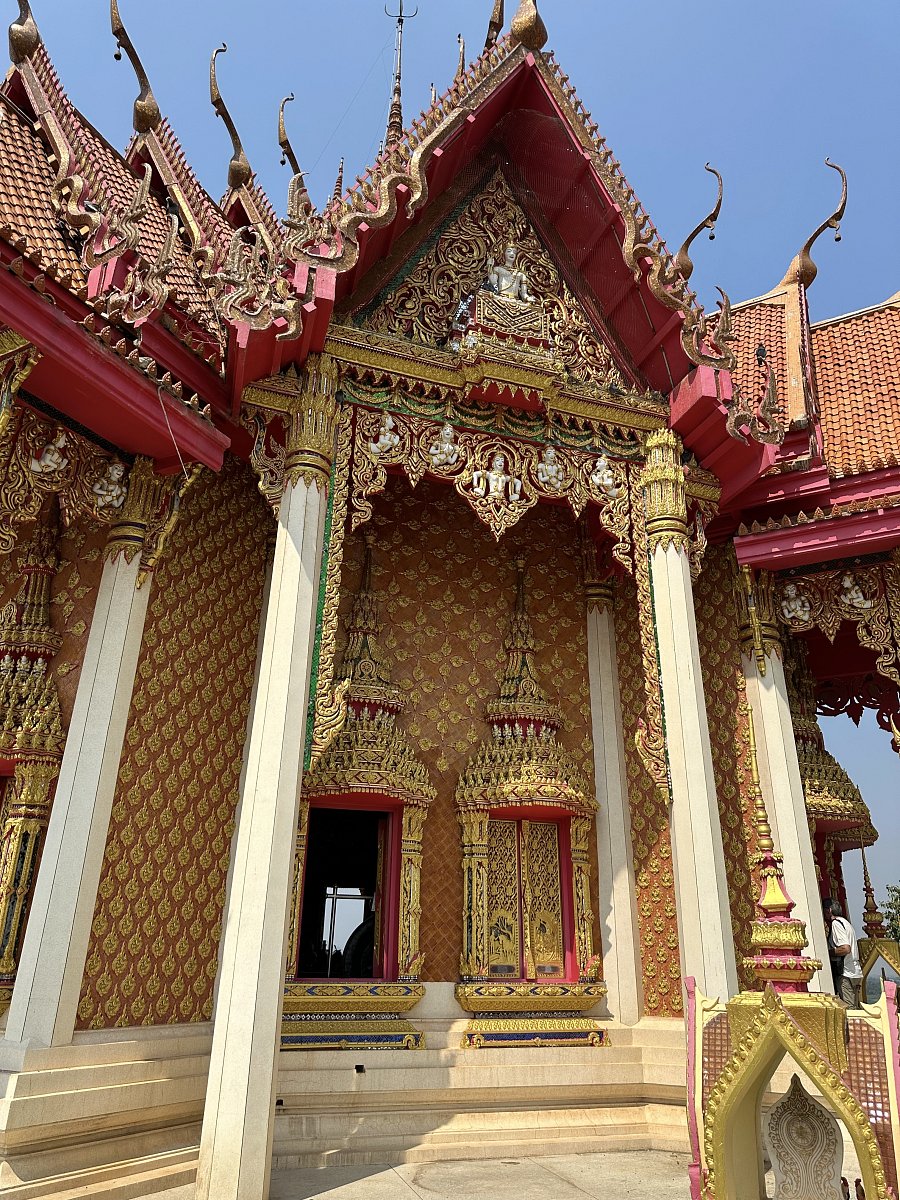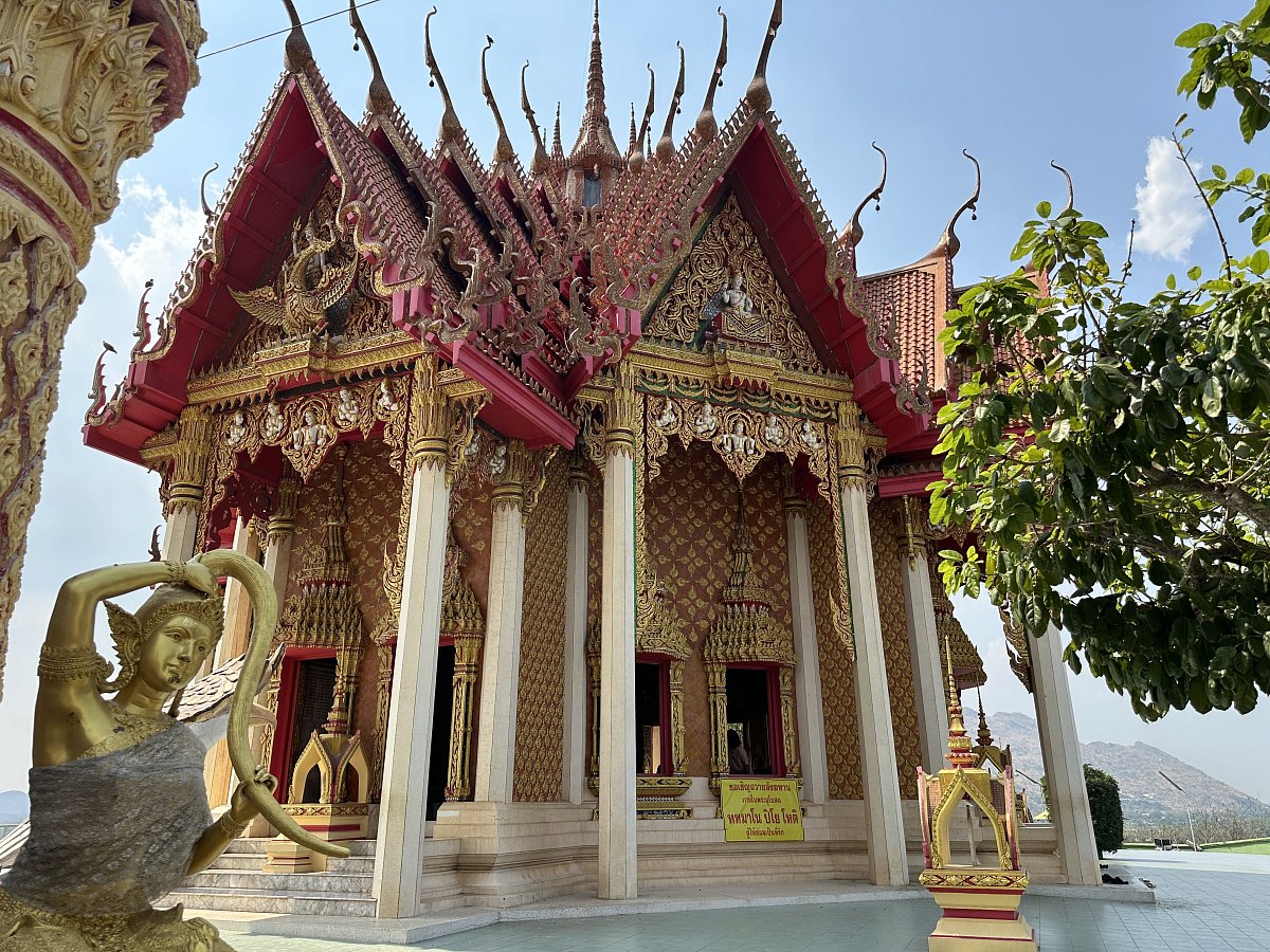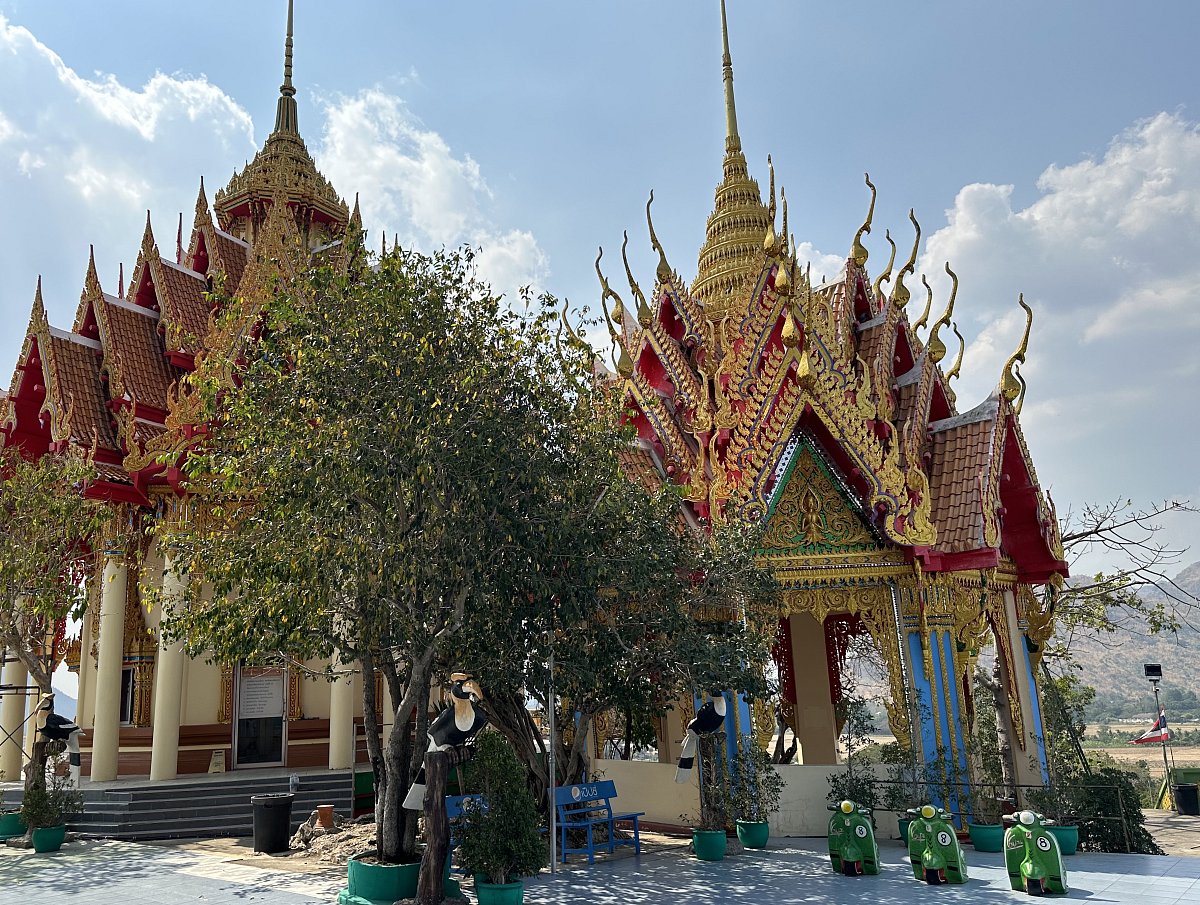 Oproti rušné tržnici byl chrám Wat Tham Khao Noi naprostou oázou klidu. Na cestě z Bangkoku jsme viděli buddhistických chrámů několik, ale tento byl opravdu okouzlující, už jen tím, že byl postaven na skalnatém pahorku s krásným výhledem do okolí. Pod chrámem byla rozsáhlá jeskyně s postavami buddhy a modlitebnou. Chrámy v Thajsku jsou nejen krásně opraveny, ale hlavně jsou stále využívány mnichy a také slouží jako centra vzdělávání a kultury.